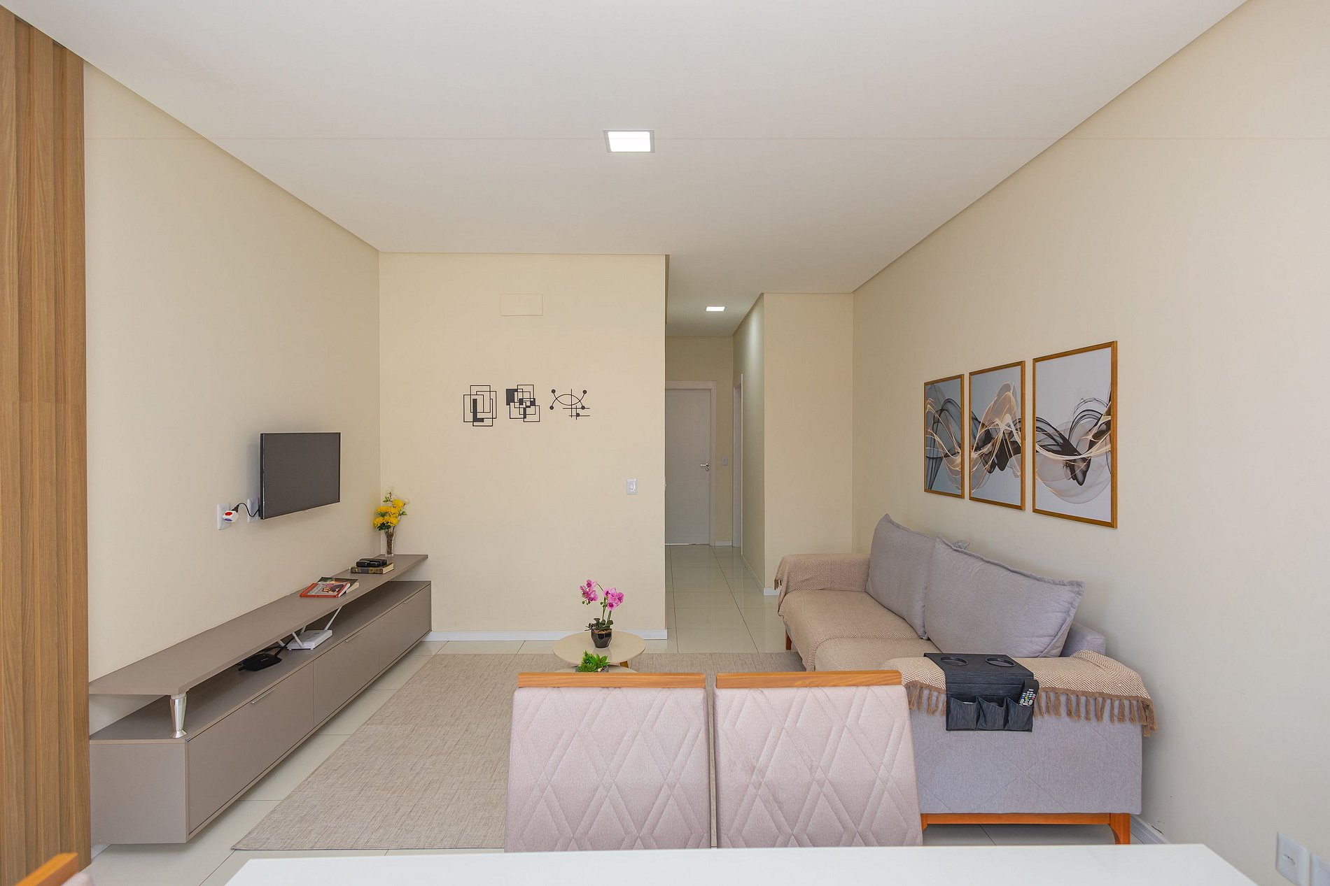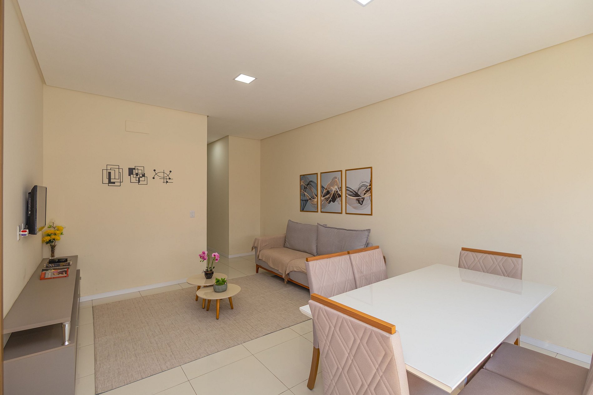 • A sala conta com sofá confortável, TV Smart, mesa para 6 pessoas, cortinas e uma ampla janela que traz luz natural, além de ter fácil acesso à cozinha totalmente equipada, com fogão, forno, geladeira, liquidificador, micro-ondas, suggar, filtro de água e muito mais.