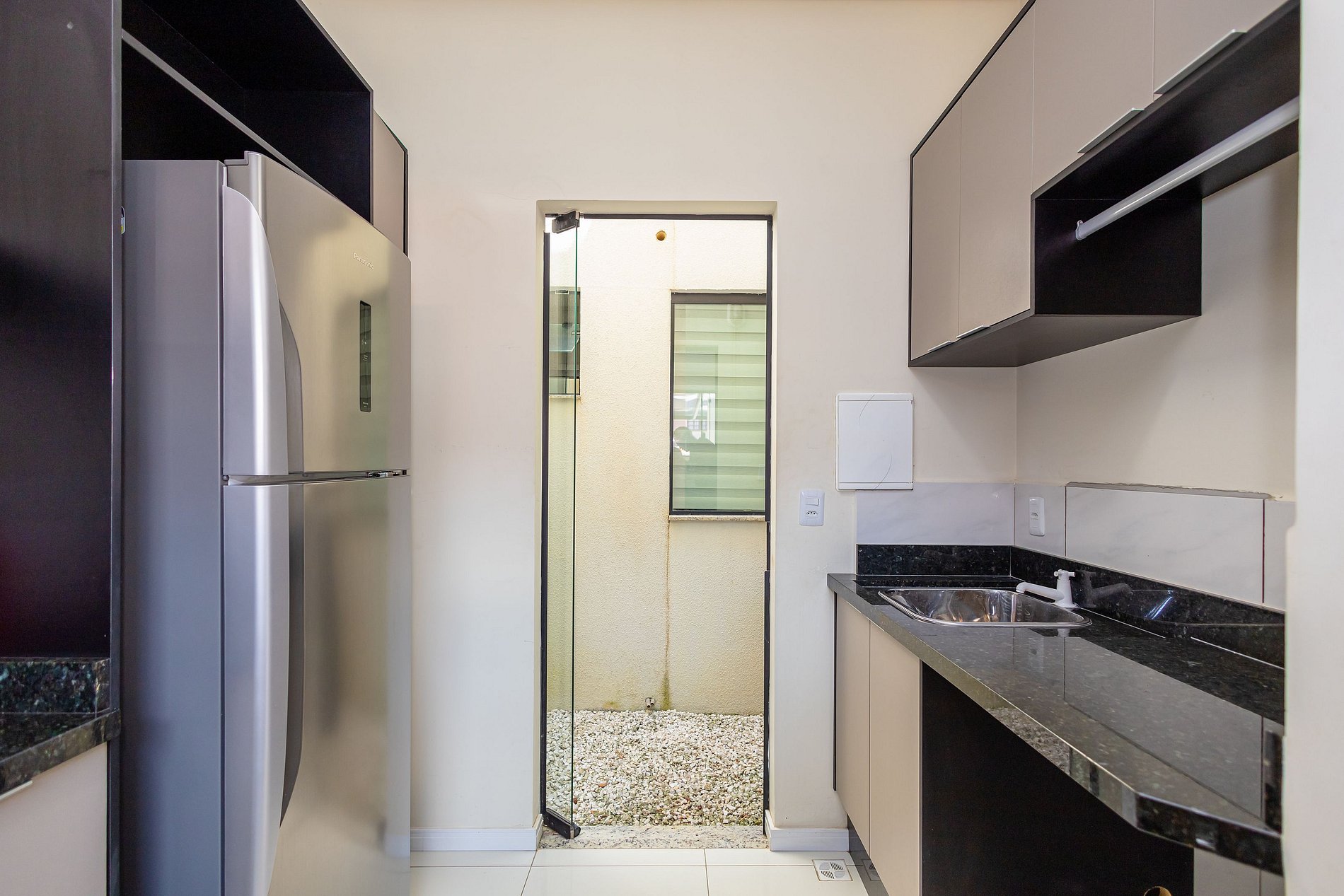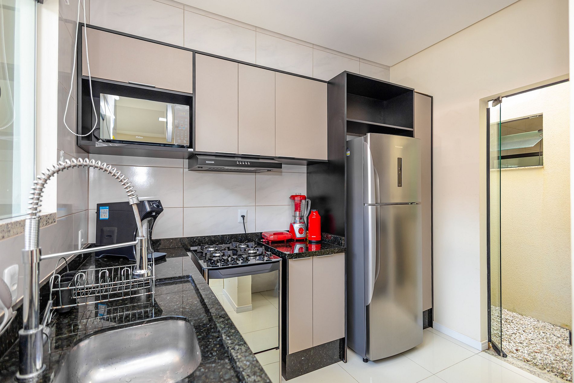 A cozinha completa é perfeita para preparar suas refeições, enquanto a sala, com sofá e TV Smart, é o lugar ideal para relaxar.