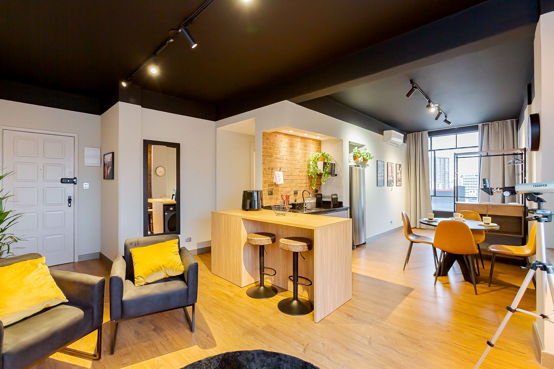 • Área de descanso e lazer: A sala é dividida em dois ambientes, um com 2 poltronas confortáveis e uma TV Smart de 65 polegadas, e outro com sofá-cama de casal, perfeito para descanso. Ambos os ambientes possuem janelas com vista para a cidade, cortinas blackout e ar-condicionado split, garantindo conforto o dia todo e noite tranquila. Na sala, também há uma luneta para desbravar a vista. Além disso, 2 banquetas estão posicionadas em frente à janela, para aproveitar a vista, e 2 outras ficam integradas à cozinha.