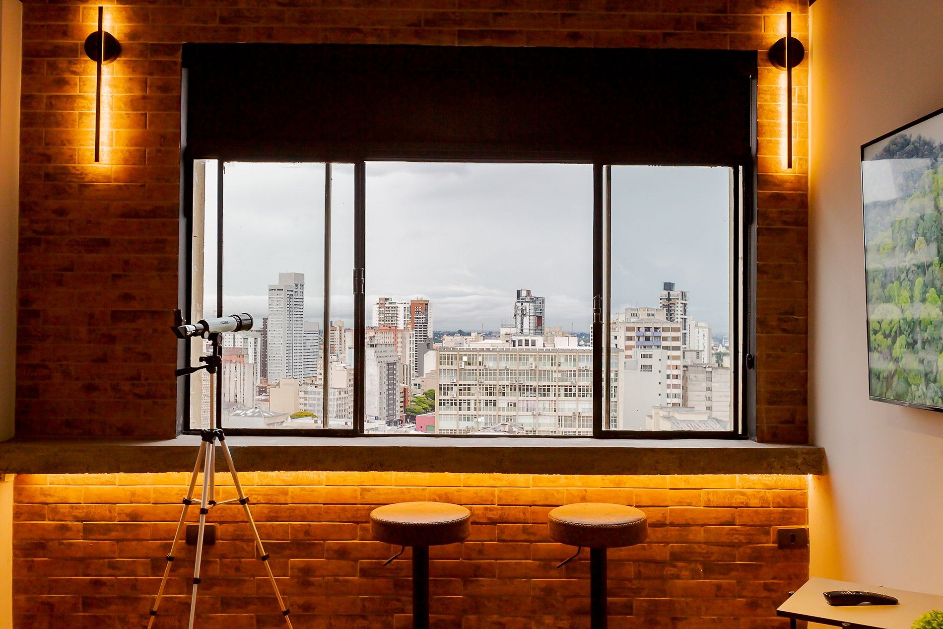 No 18º andar deste símbolo de Curitiba, o apartamento oferece uma vista espetacular da cidade, permitindo aos hóspedes desfrutar da beleza de Curitiba de uma forma única e privilegiada. Para tornar a experiência ainda mais incrível, o imóvel conta com um telescópio, perfeito para observar o céu estrelado e a cidade de uma perspectiva única.