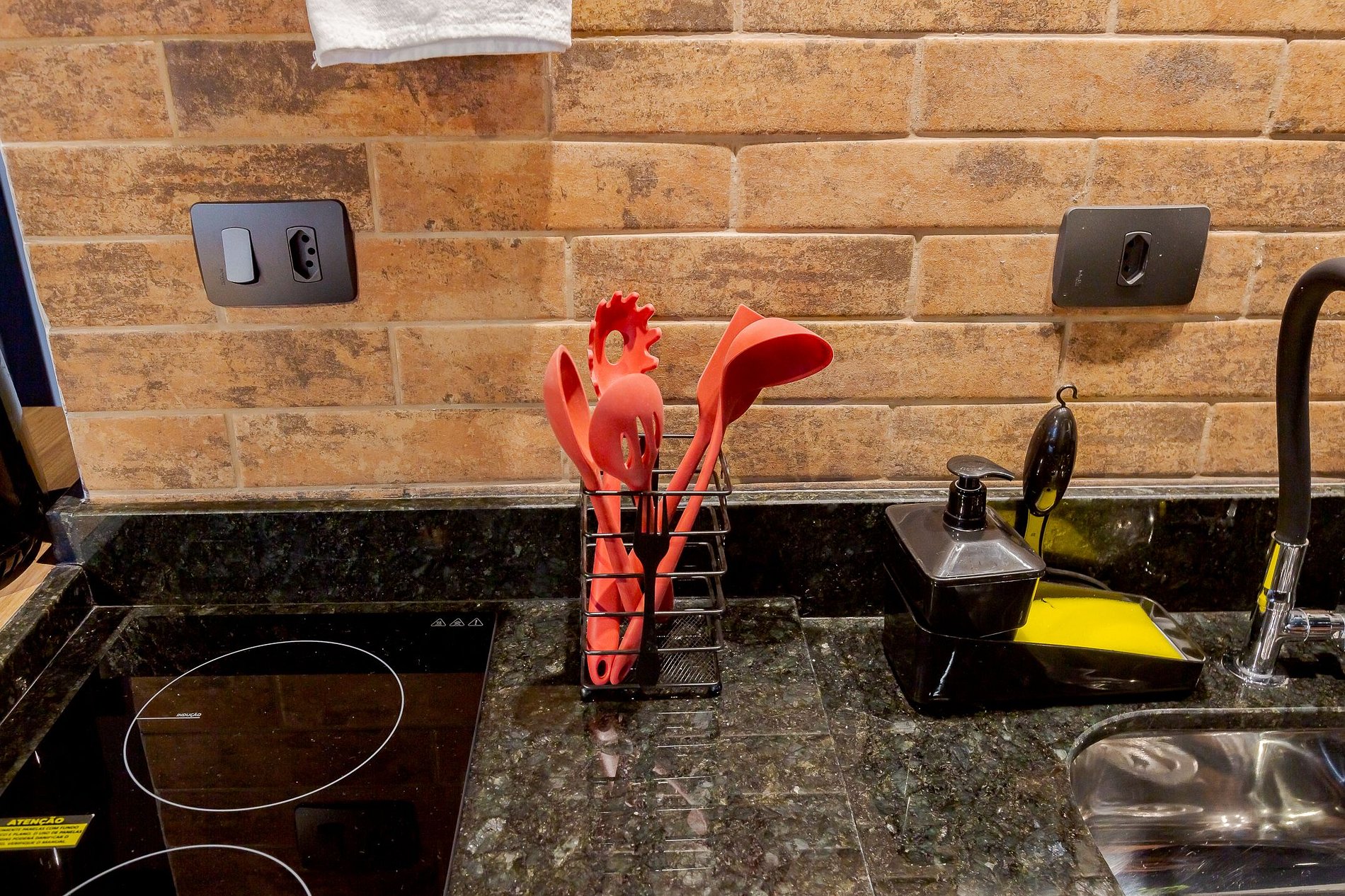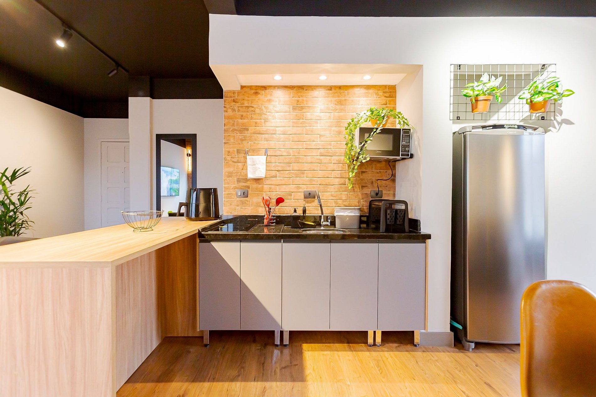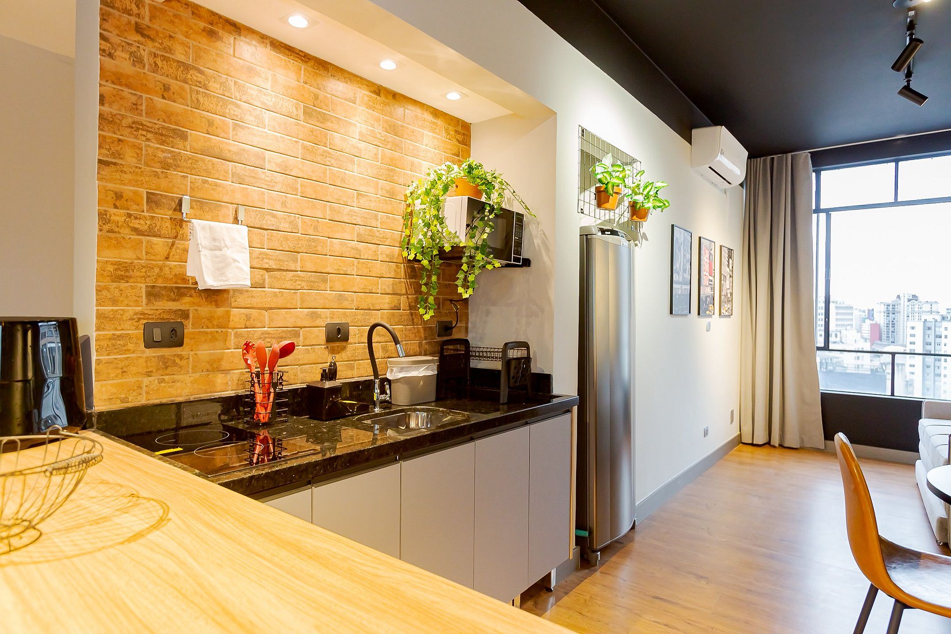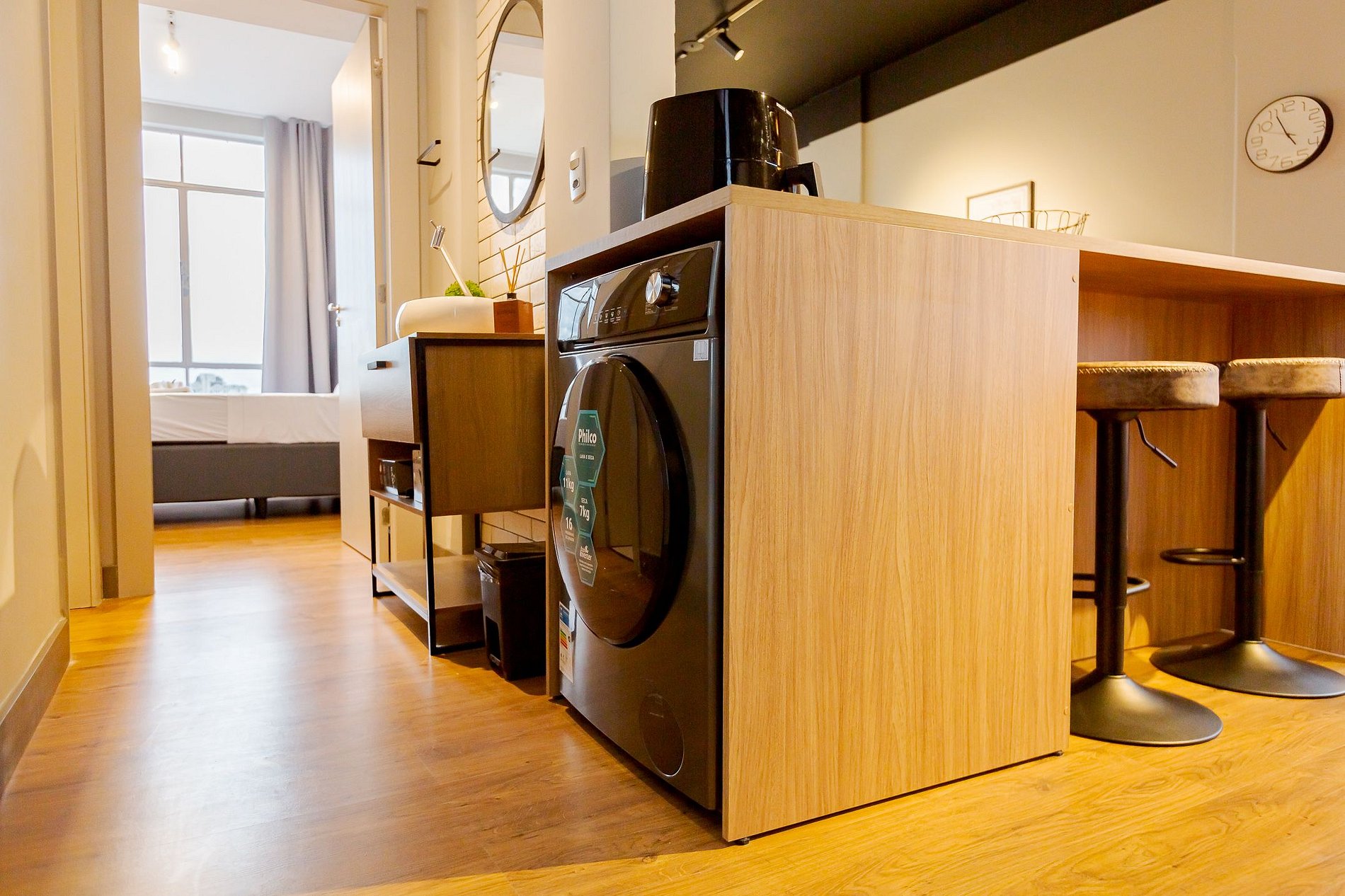 • Cozinha e refeições: A cozinha está integrada à sala e conta com air fryer, micro-ondas, cooktop, geladeira, panelas, talheres, taças de vinho e uma mesa redonda com 4 lugares para refeições, oferecendo praticidade e conforto.