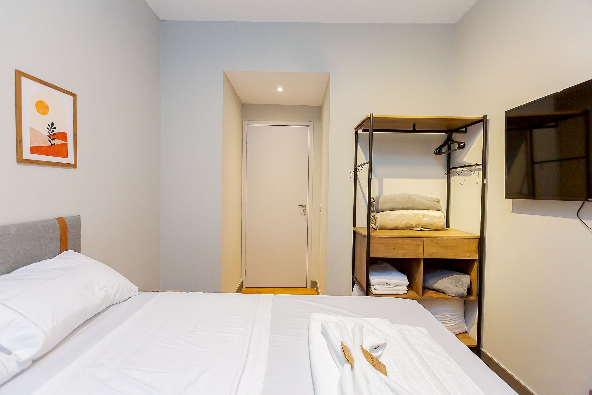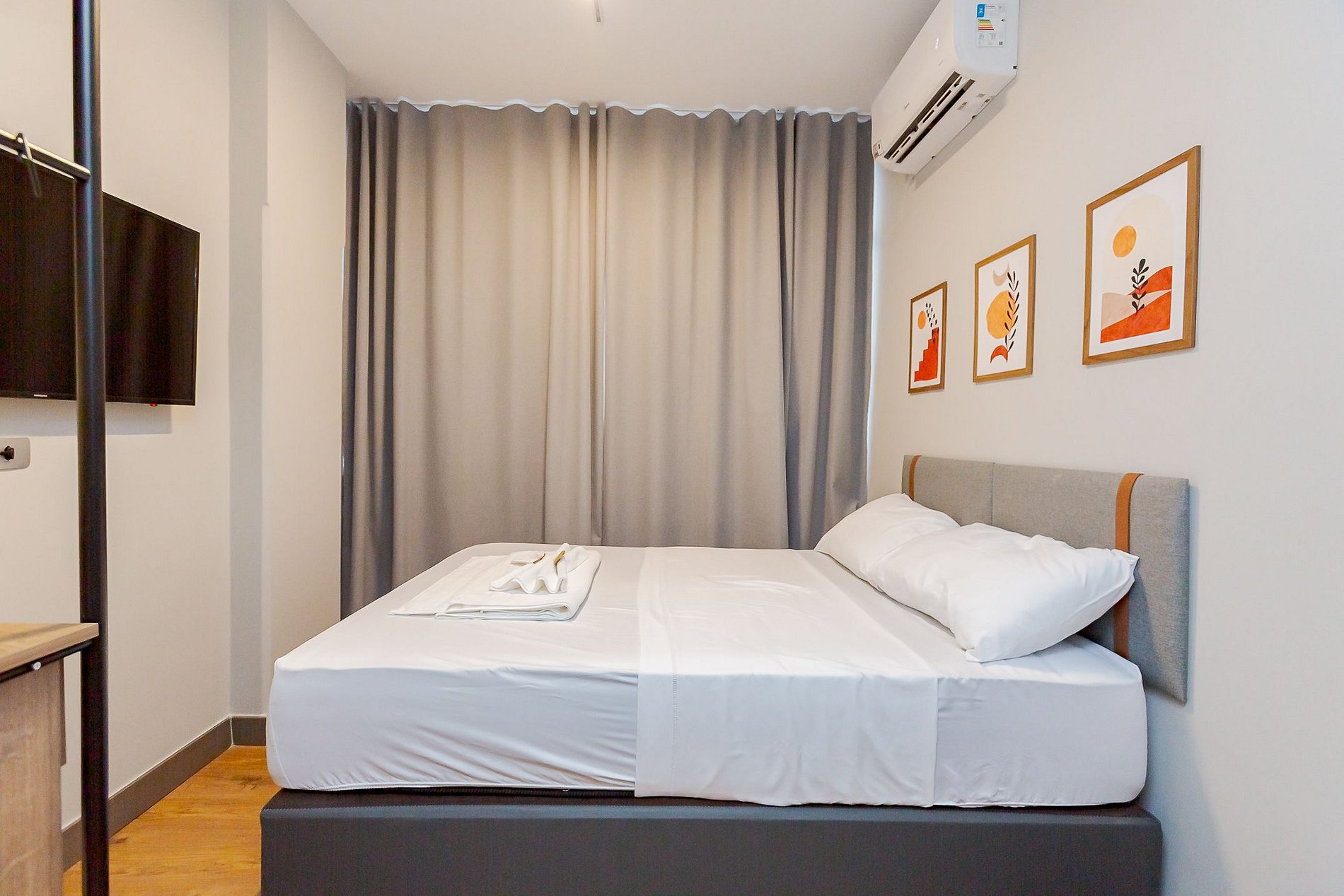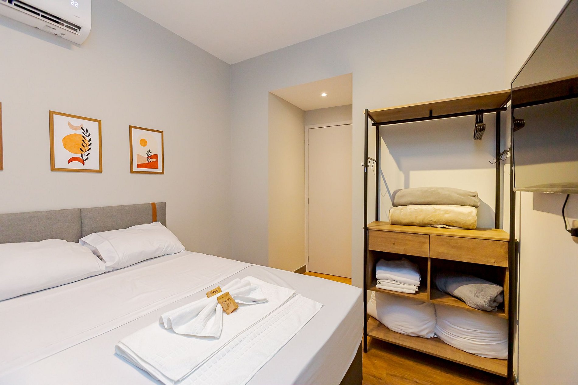 • Quarto: O quarto possui cama de casal com roupas de cama, TV Smart, ar-condicionado split, cortina blackout e armário aberto com cabides, proporcionando um ambiente acolhedor e organizado.