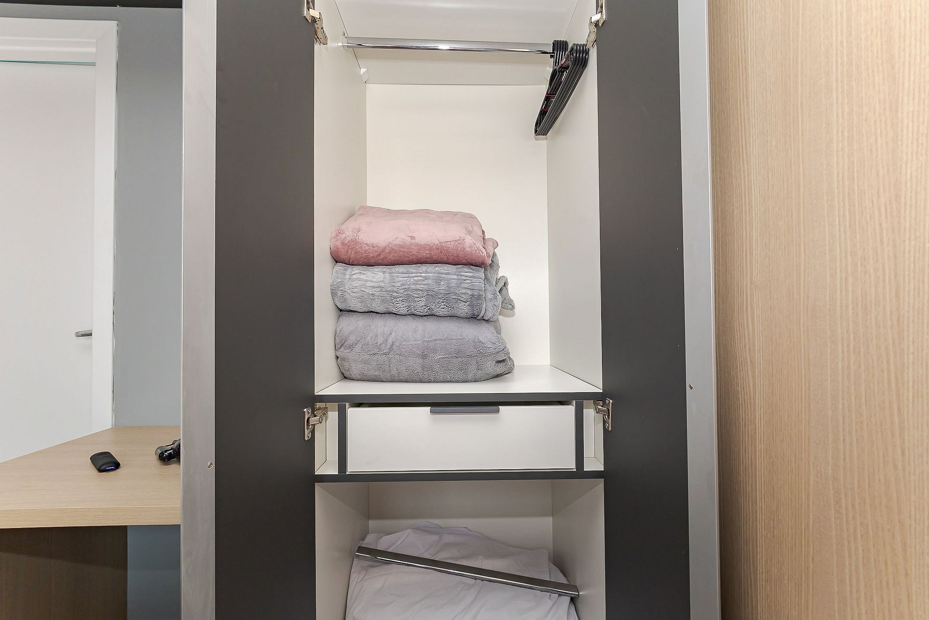 • Quarto: A suíte possui cama queen, TV Smart de 42", roupas de cama, cortinas blackout, ventilador de mesa, armário com cabides e ferro de passar roupa.