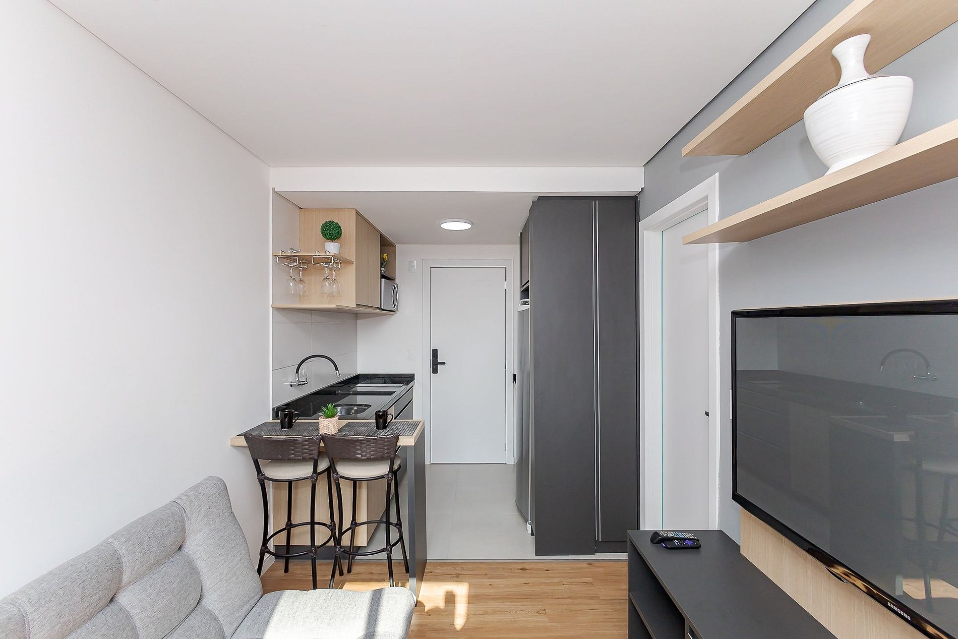 • Sala e jantar: A sala conta com um sofá-cama de casal, cortina blackout e TV Smart de 42". O espaço inclui uma mesa integrada à cozinha, que pode ser usada para refeições ou trabalho, com duas cadeiras.