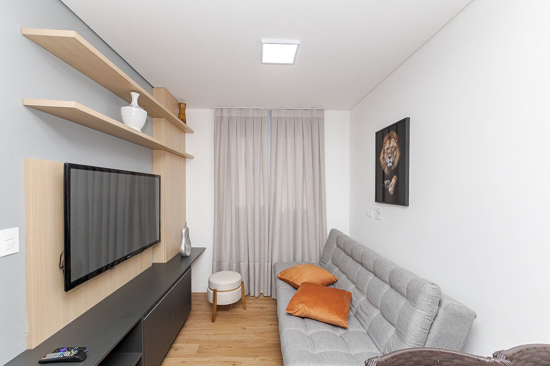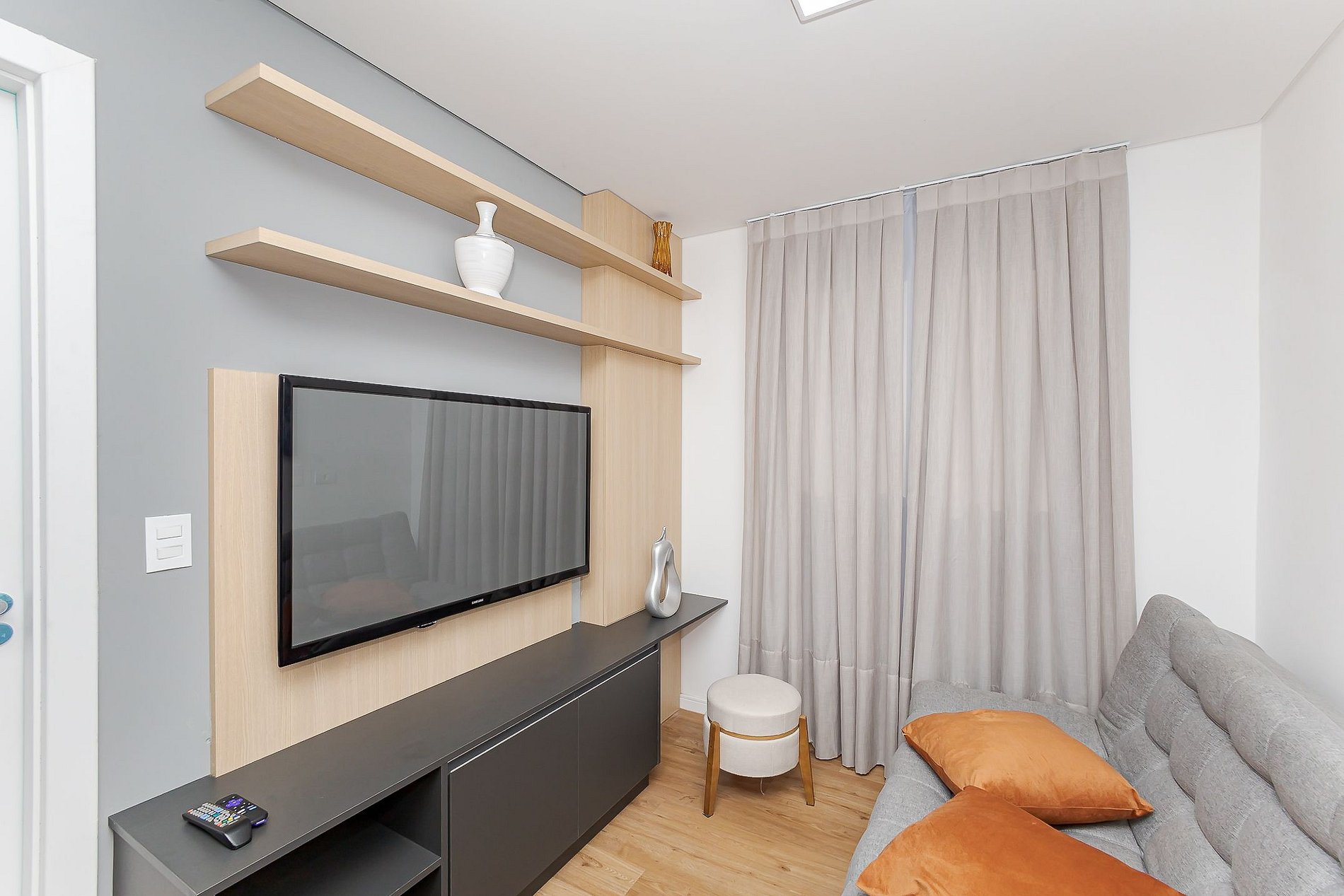 A suíte é aconchegante e a sala integrada à cozinha proporciona um ambiente funcional.