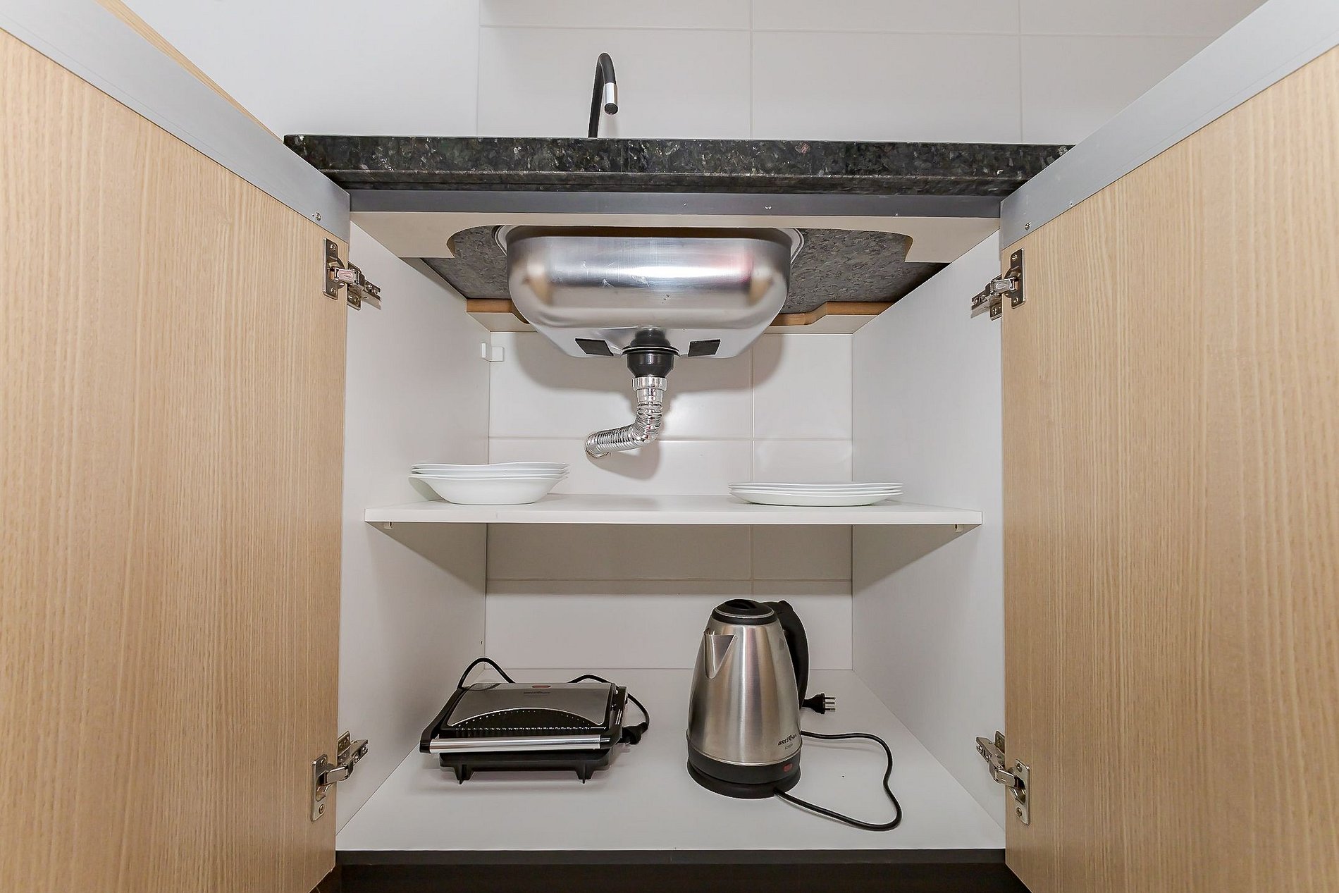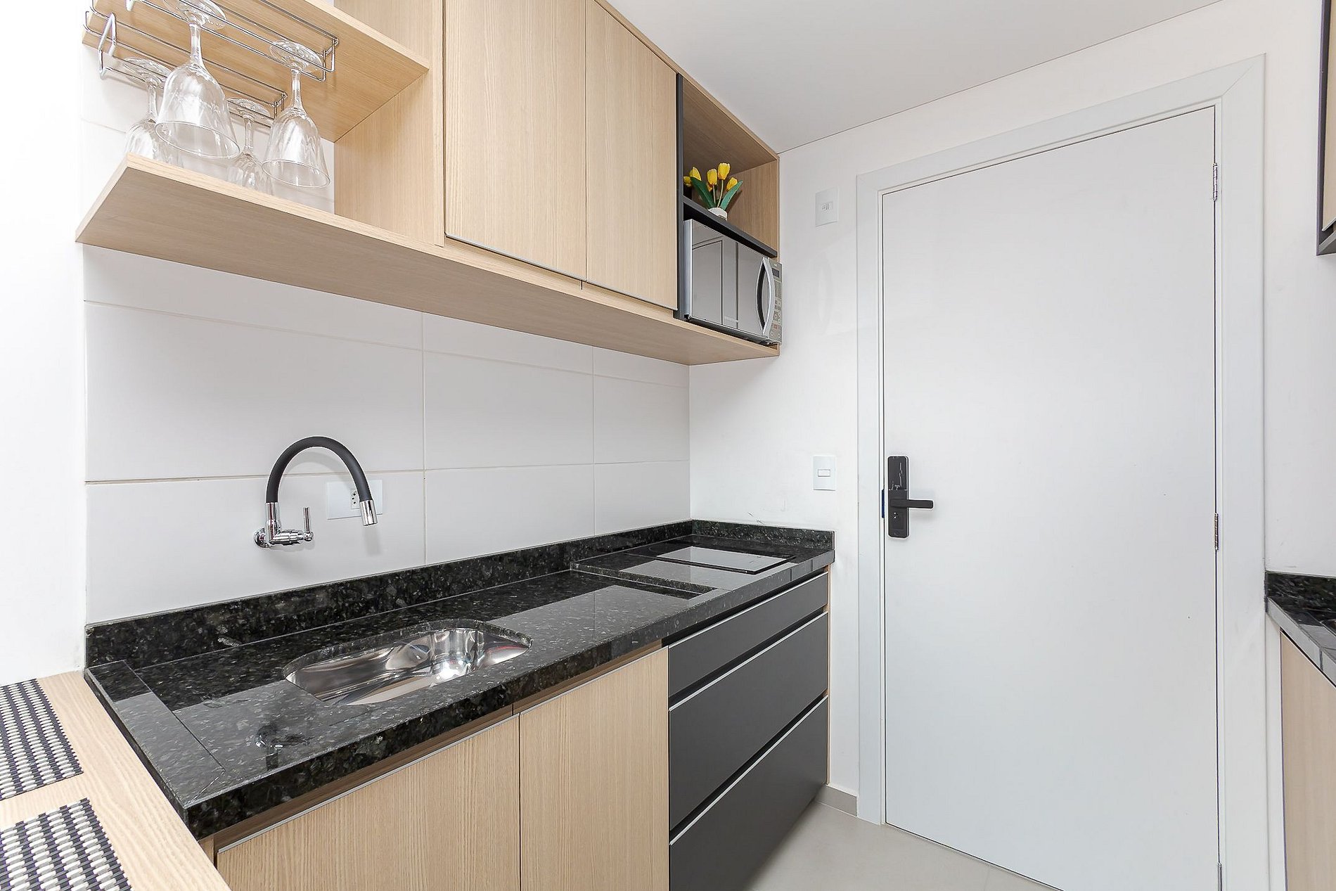 • Cozinha: Equipada com cooktop de 2 bocas, churrasqueira elétrica short grill, micro-ondas, geladeira, liquidificador, sanduicheira, chaleira, panelas, talheres, pratos, copos e utensílios essenciais.