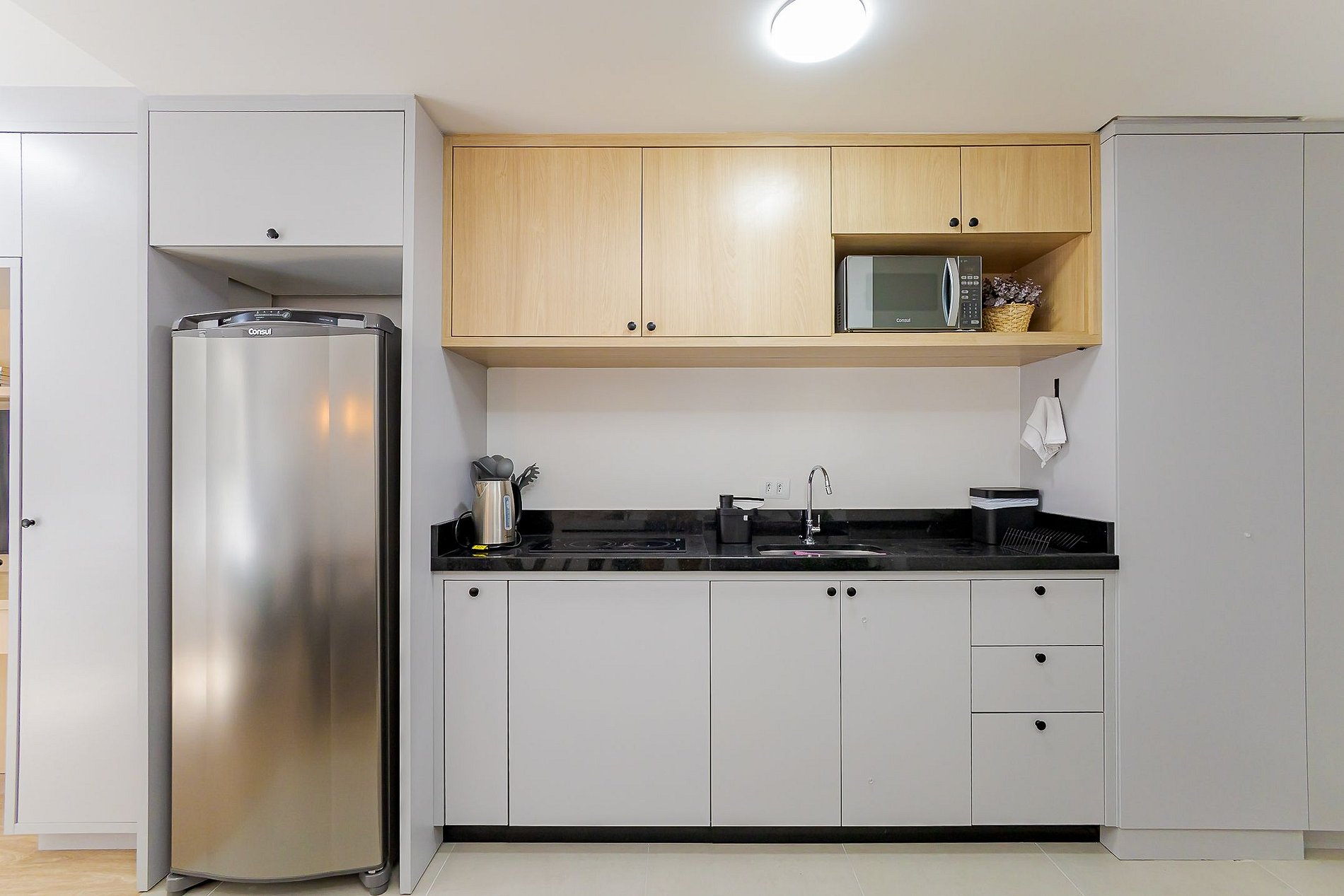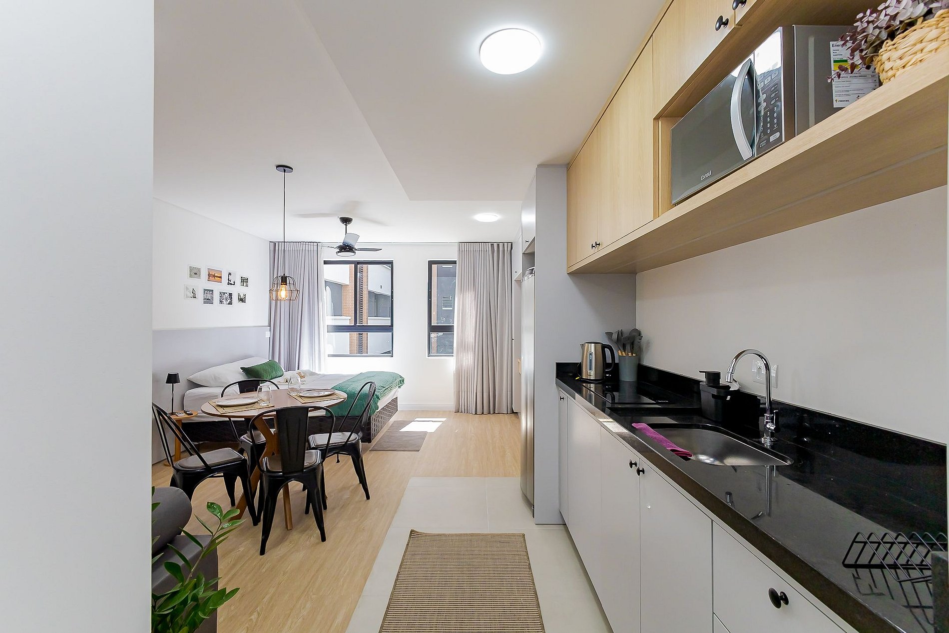 • Cozinha: Equipada com cooktop de 2 bocas, micro-ondas, chaleira elétrica, talheres, copos de vidro e panelas para pequenas refeições.