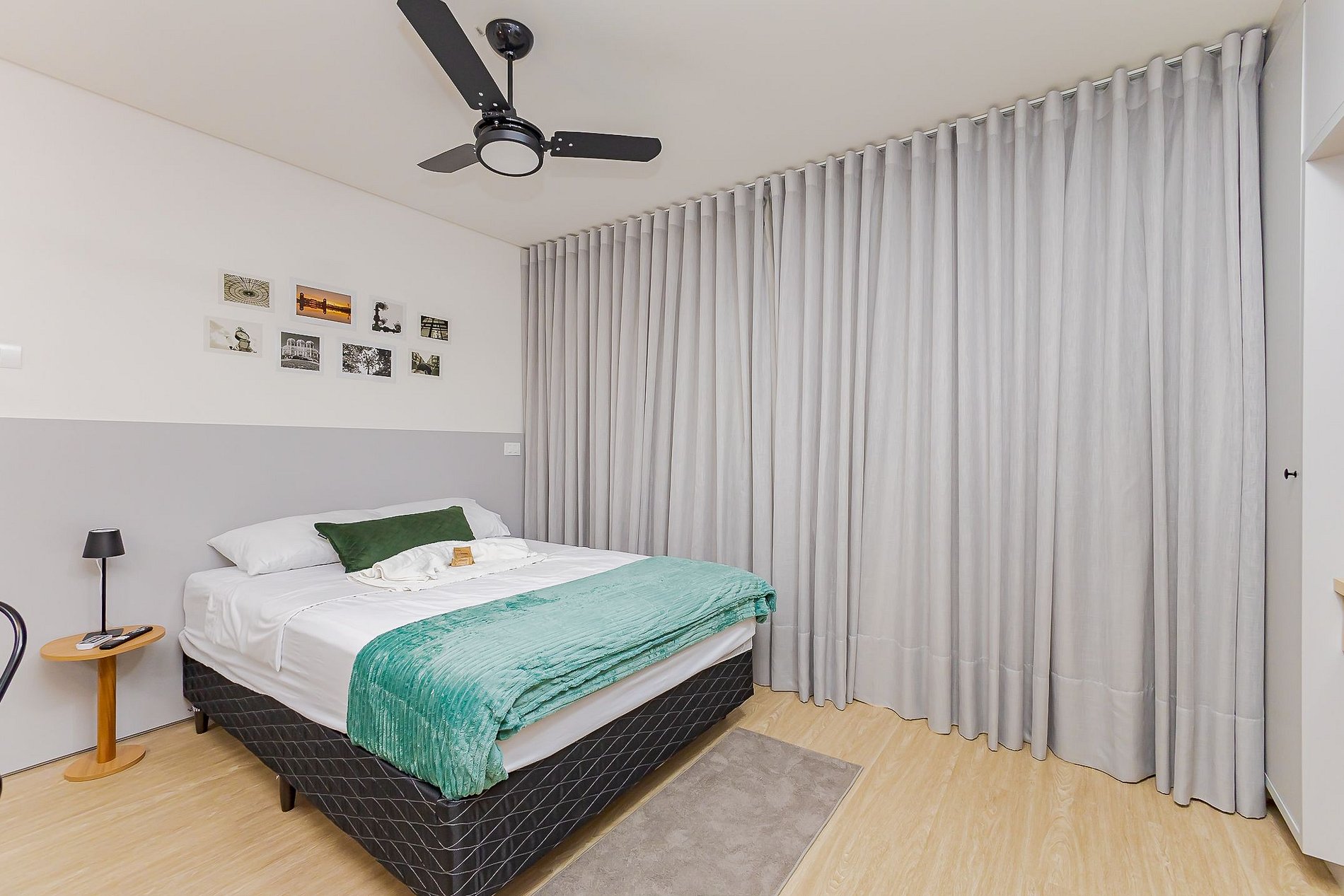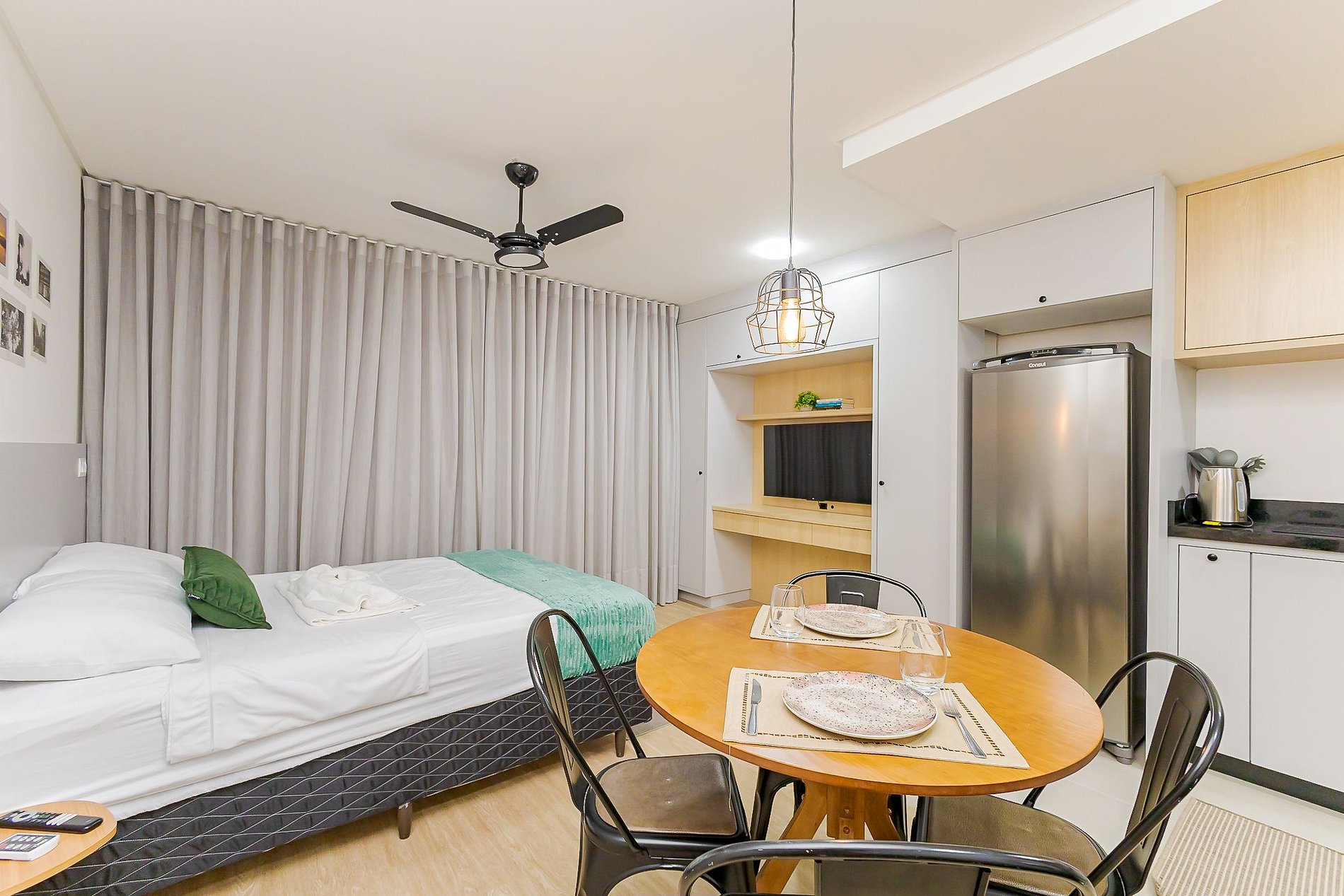 • Ambiente integrado: O estúdio conta com cama de casal com cabeceira, sofá-cama de casal, ventilador de teto, TV Smart, cortinas blackout e tomadas próximas à cama.