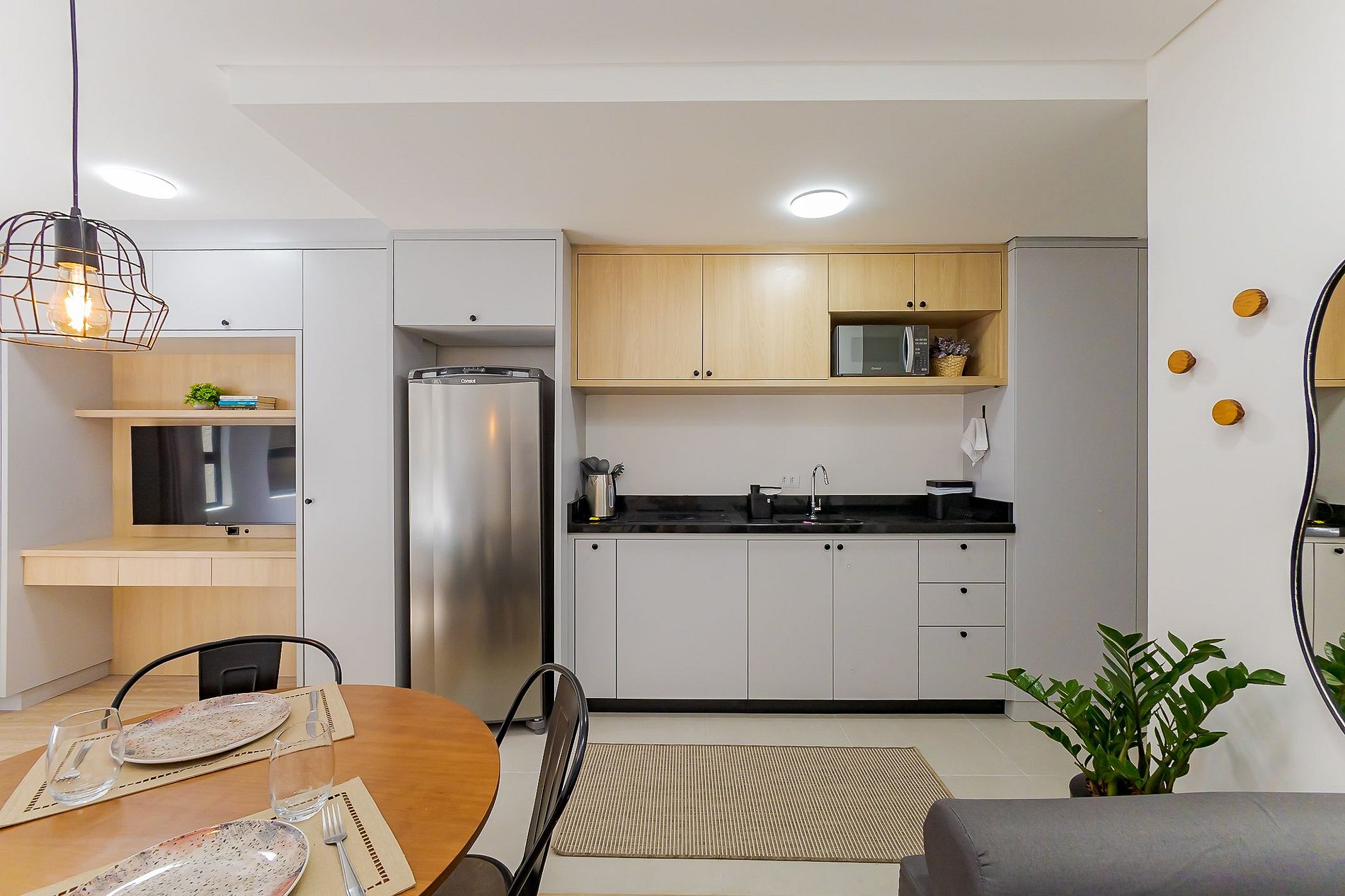 • Área de jantar: Mesa redonda com 4 cadeiras, ideal para refeições ou trabalho.