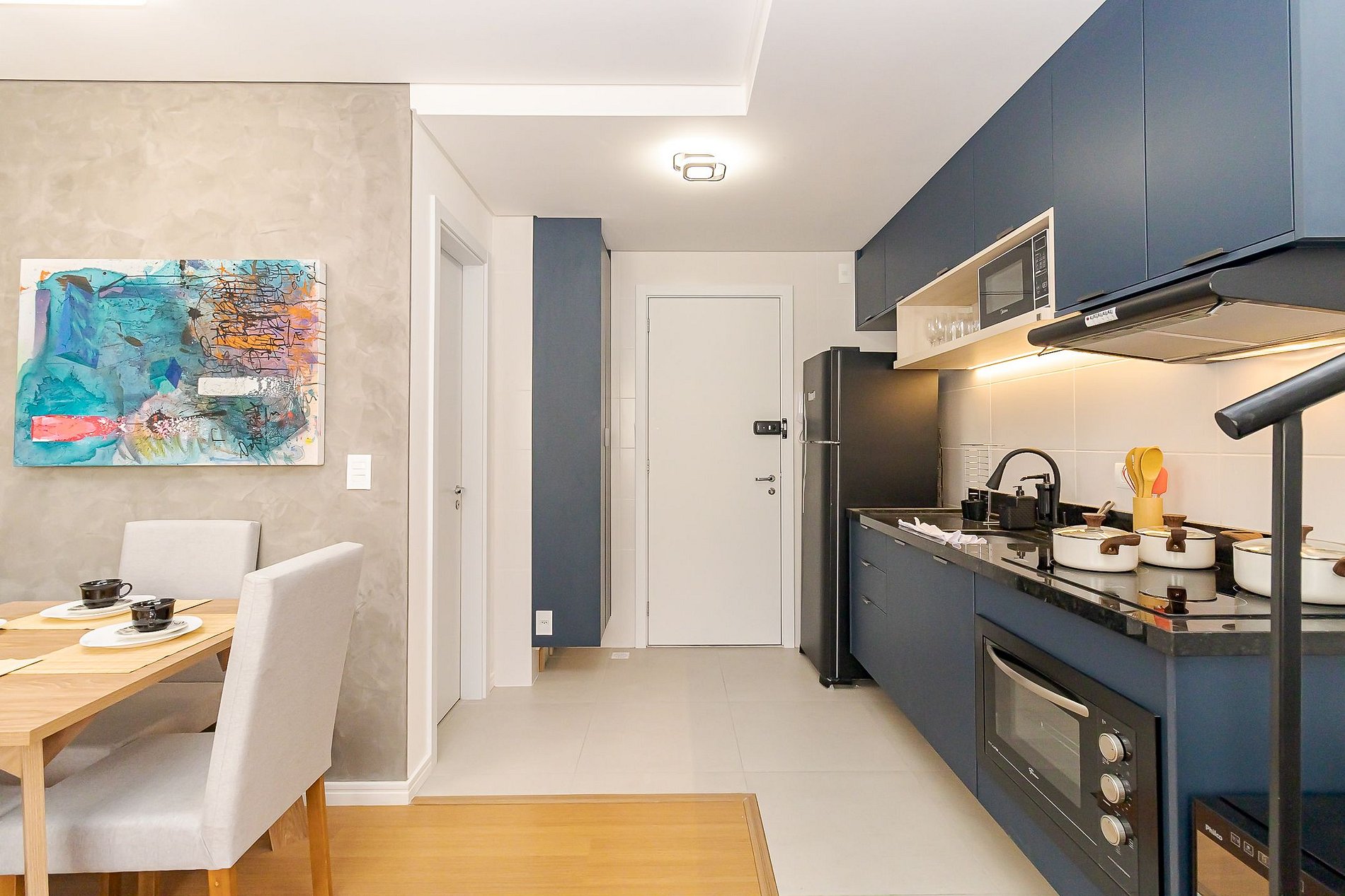 • Sala e cozinha integradas: sofá-cama de casal, TV Smart, mesa de jantar, cortina privativa e cozinha equipada com geladeira, micro-ondas, forno, airfryer, depurador, cooktop, adega climatizada, cafeteira, chaleira elétrica, pratos, talheres, utensílios, panelas, copos e taças.