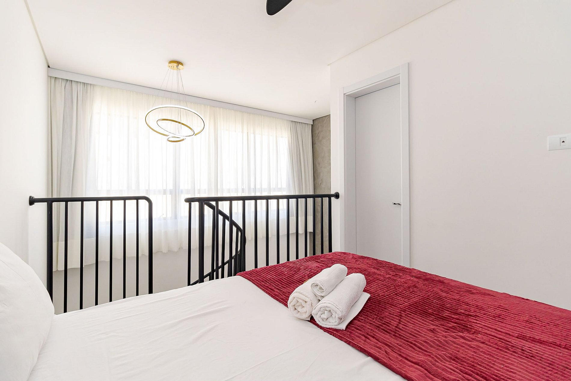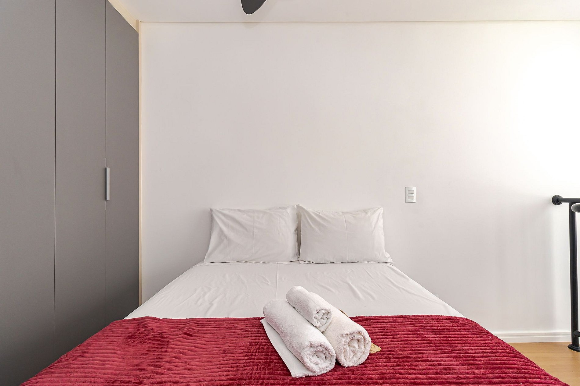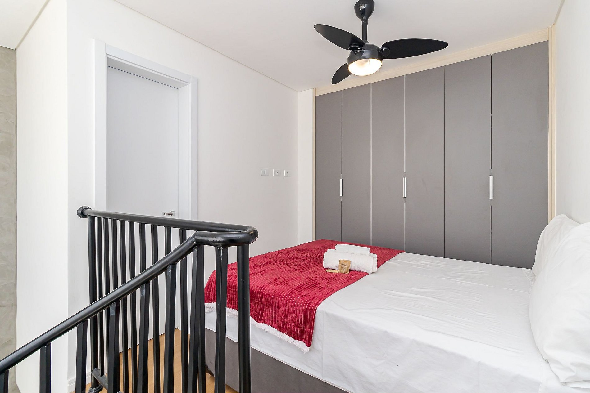 • Quarto (mezanino): cama de casal, armário amplo com cabides, ventilador de teto e cortina privativa.