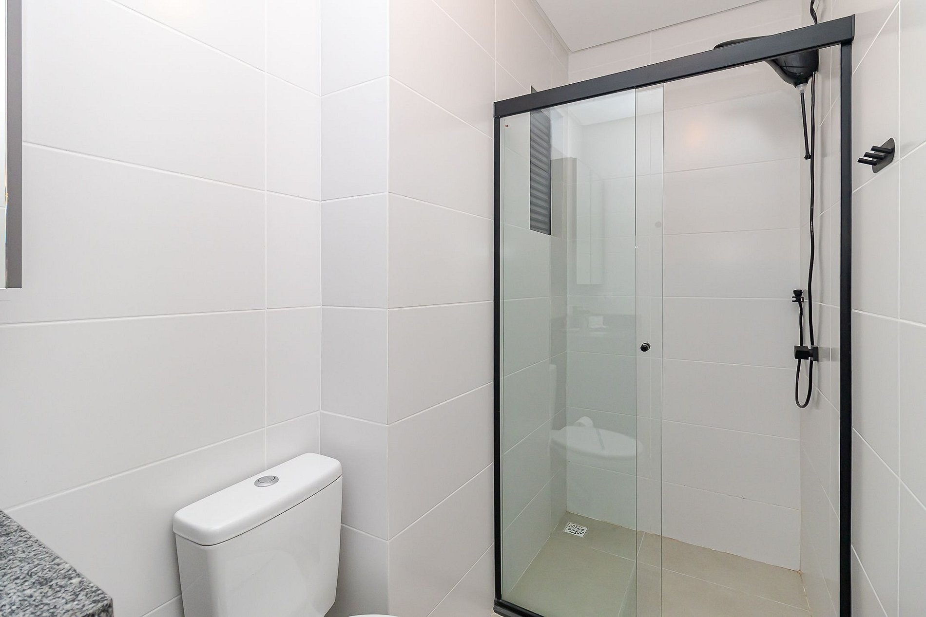 • Banheiro completo: chuveiro elétrico com água quente, box de vidro e espelho.