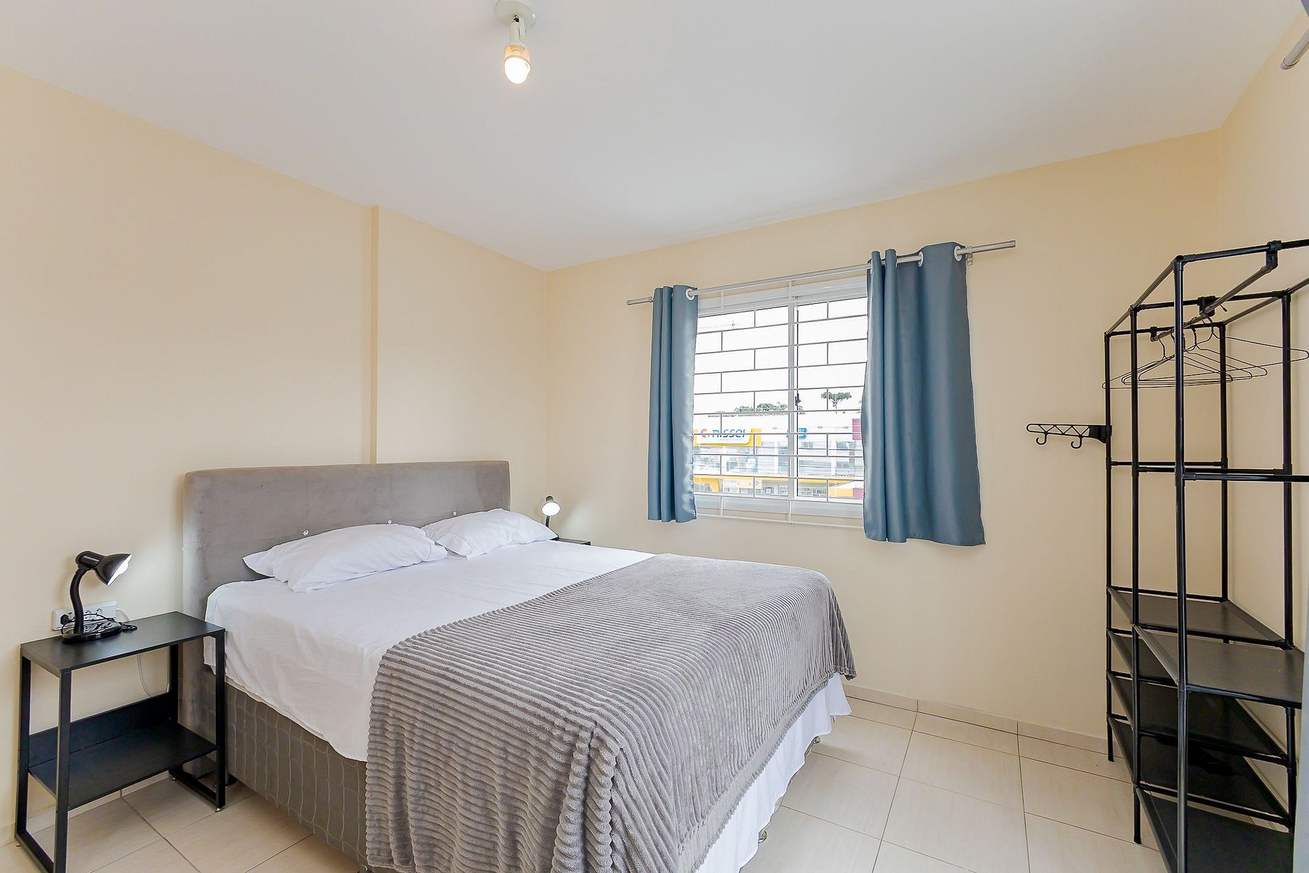 • Quarto 2: Duas camas de solteiro, arara de roupas com cabides e cortinas blackout.