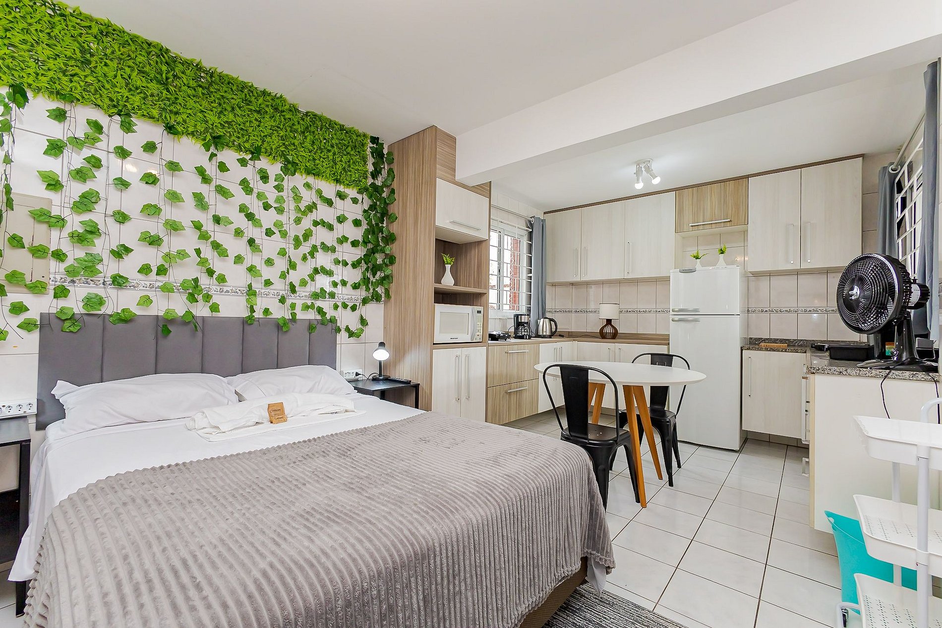 • Espaço integrado: Conta com cama de casal confortável, cabeceira com luz de leitura, TV Smart, ventilador de mesa e cortinas blackout para um ambiente mais aconchegante.