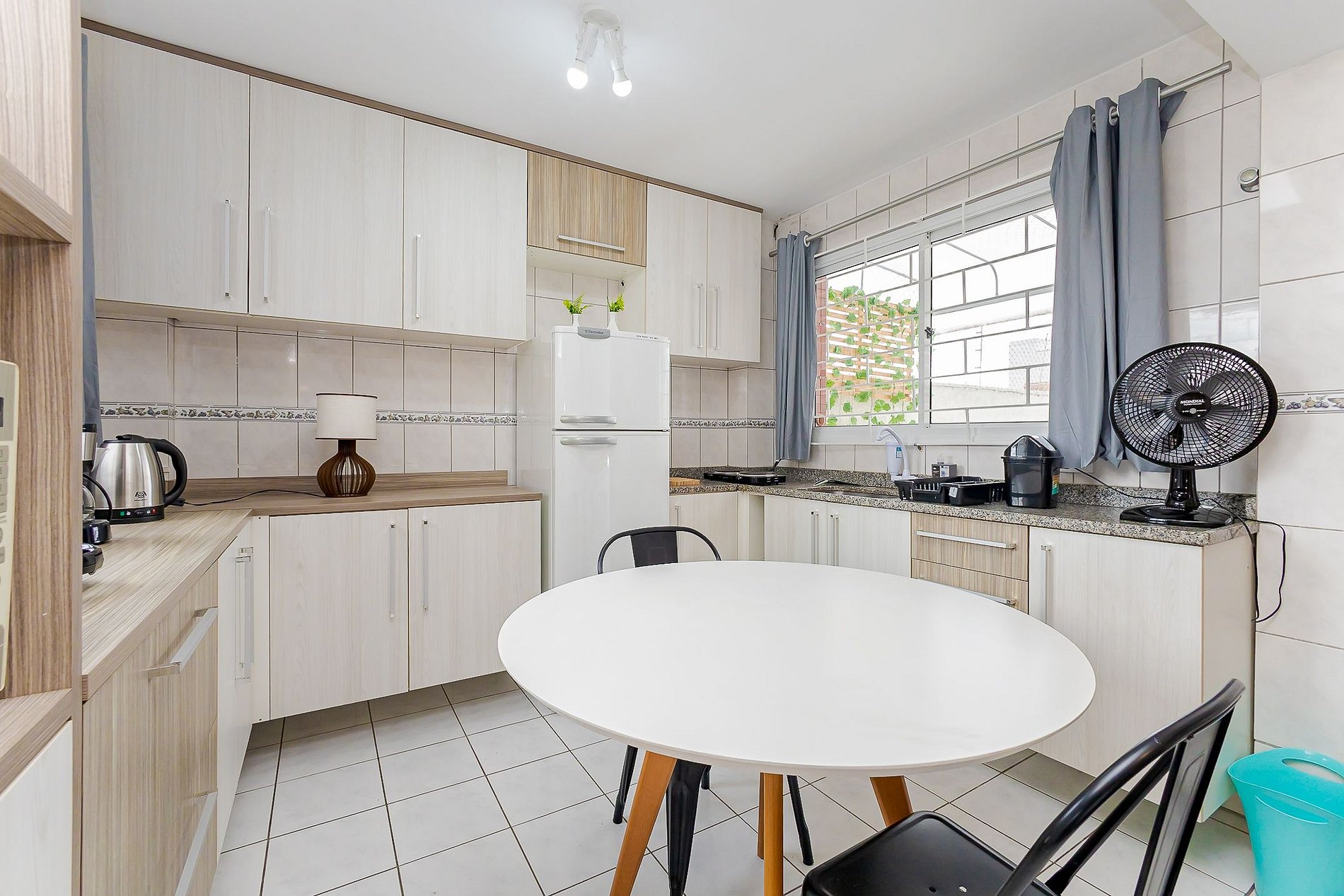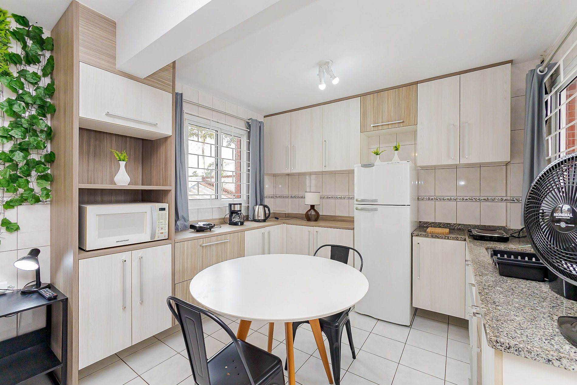 • Cozinha: Equipada com cooktop de 2 bocas, micro-ondas, geladeira, chaleira elétrica, sanduicheira, cafeteira, louças, talheres e armários para armazenamento.
