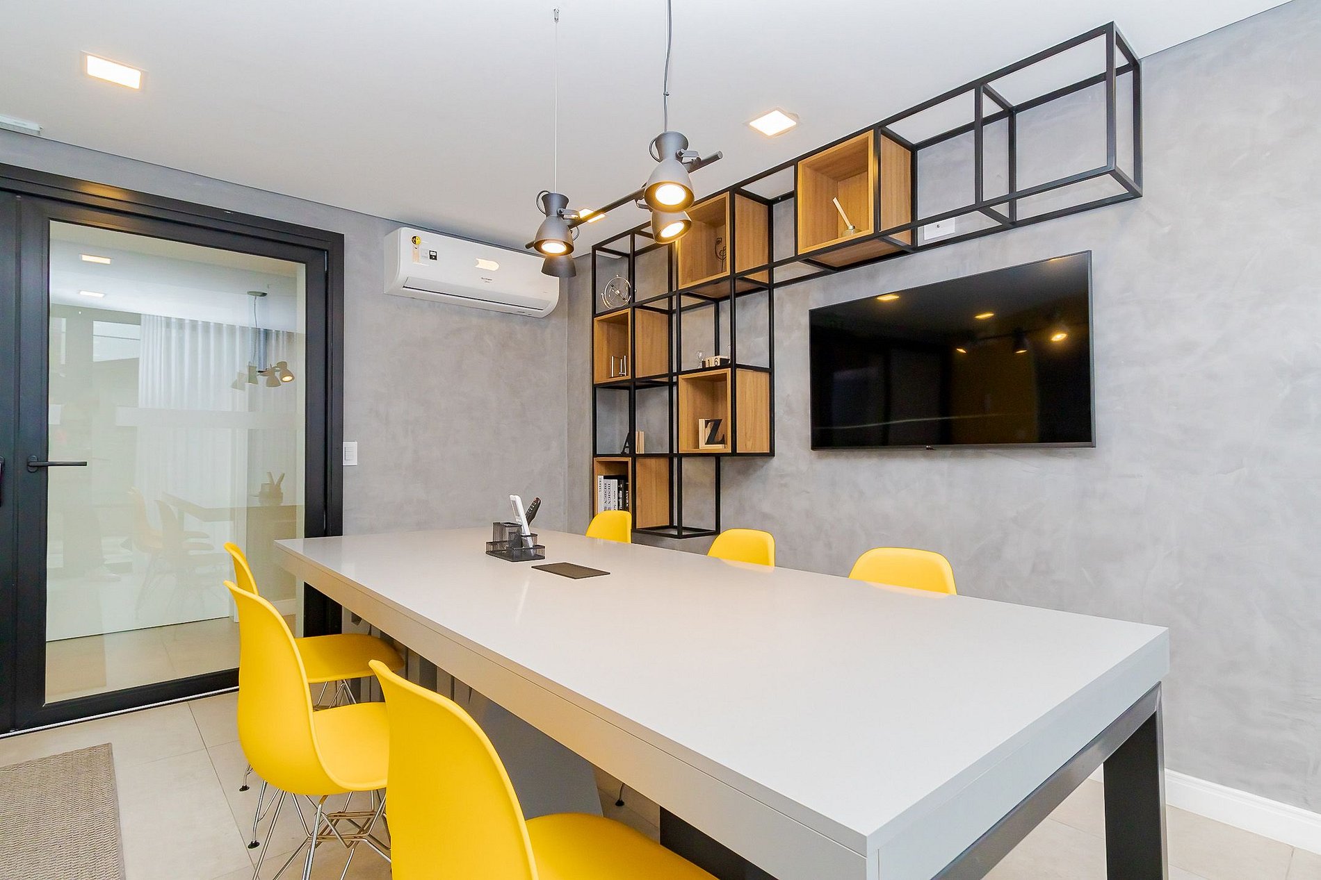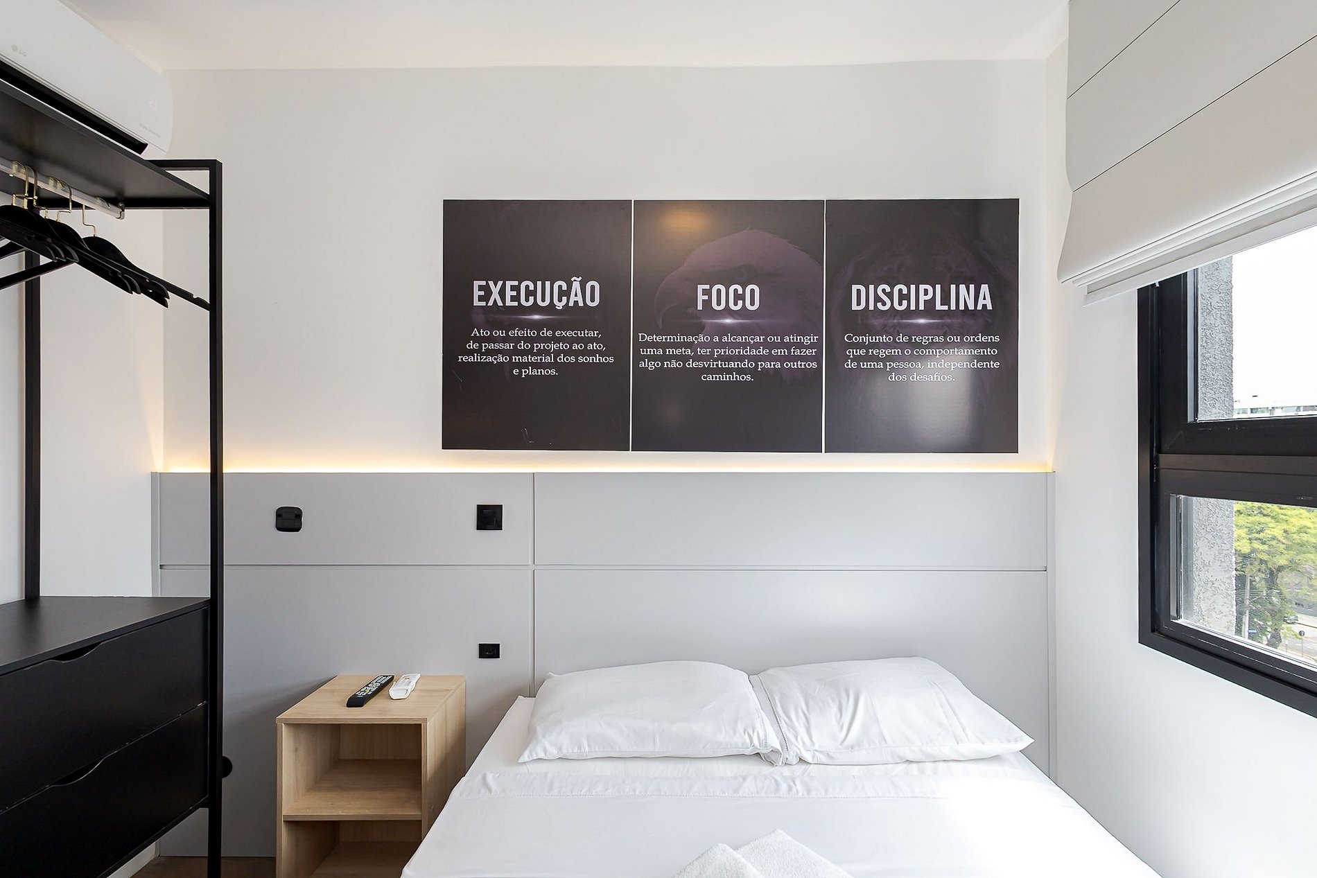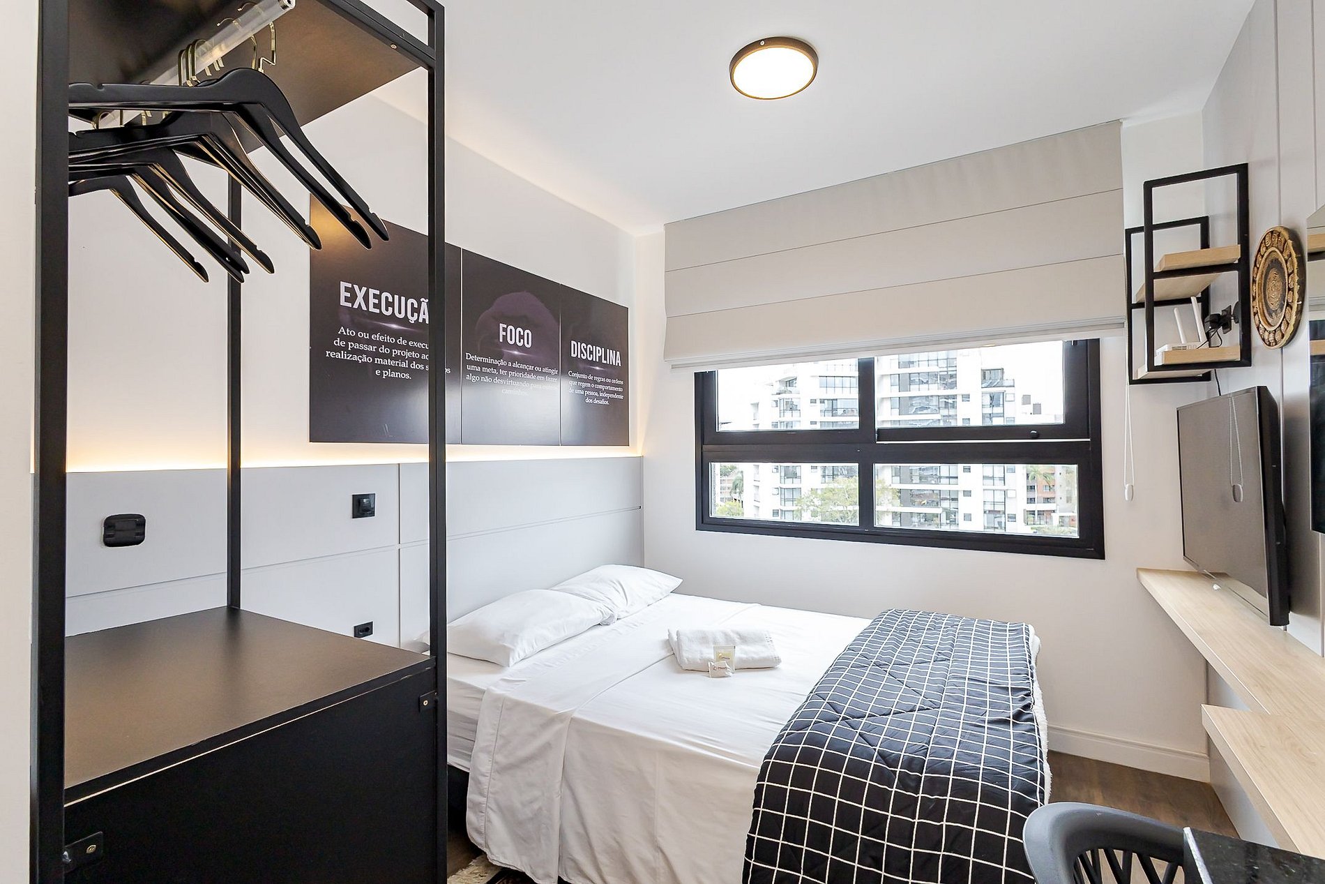 • Ambiente integrado: cama de casal com cabeceira em LED, ar-condicionado split, mesa de trabalho ou refeições com cadeira, TV Smart, persiana privativa e armário com arara e cabides.