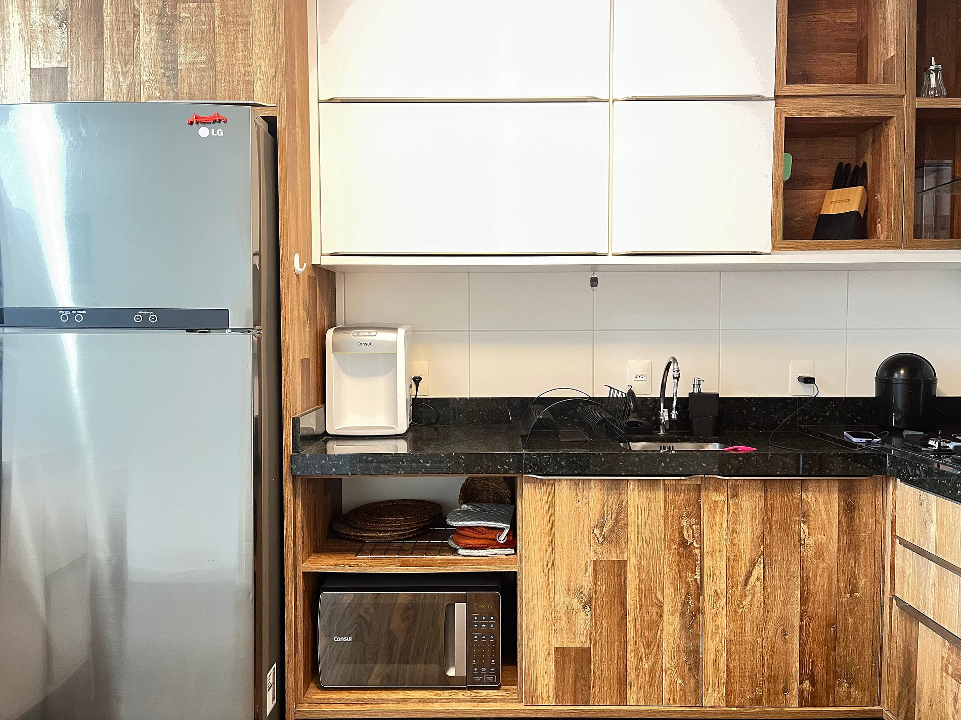 • Cozinha ampla e equipada com geladeira, filtro de água, micro-ondas, cooktop, forno, grill para churrasco, chaleira elétrica, liquidificador, pratos, copos, talheres e utensílios.