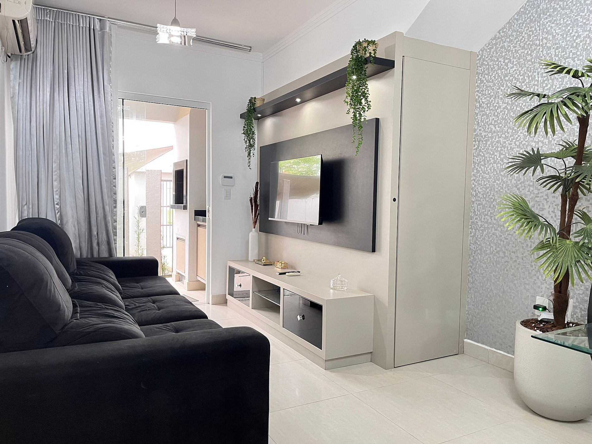• Sala com ar-condicionado split, sofá espaçoso, cortina blackout, mesa para 6 pessoas e TV Smart.