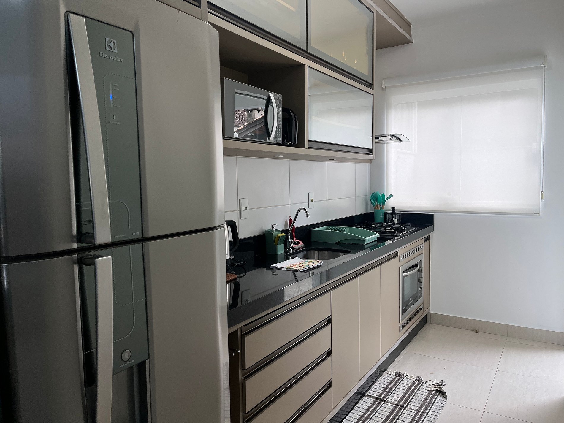 • Geladeira, micro-ondas, forno, cooktop, chaleira elétrica, cafeteira, liquidificador, talheres e copos.