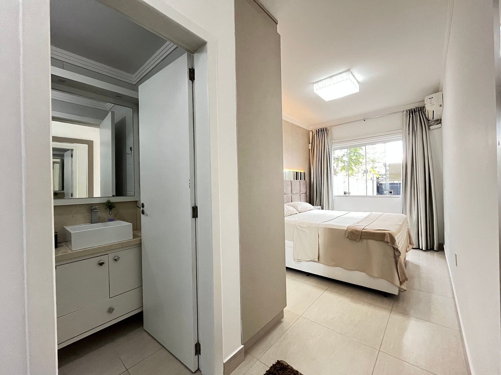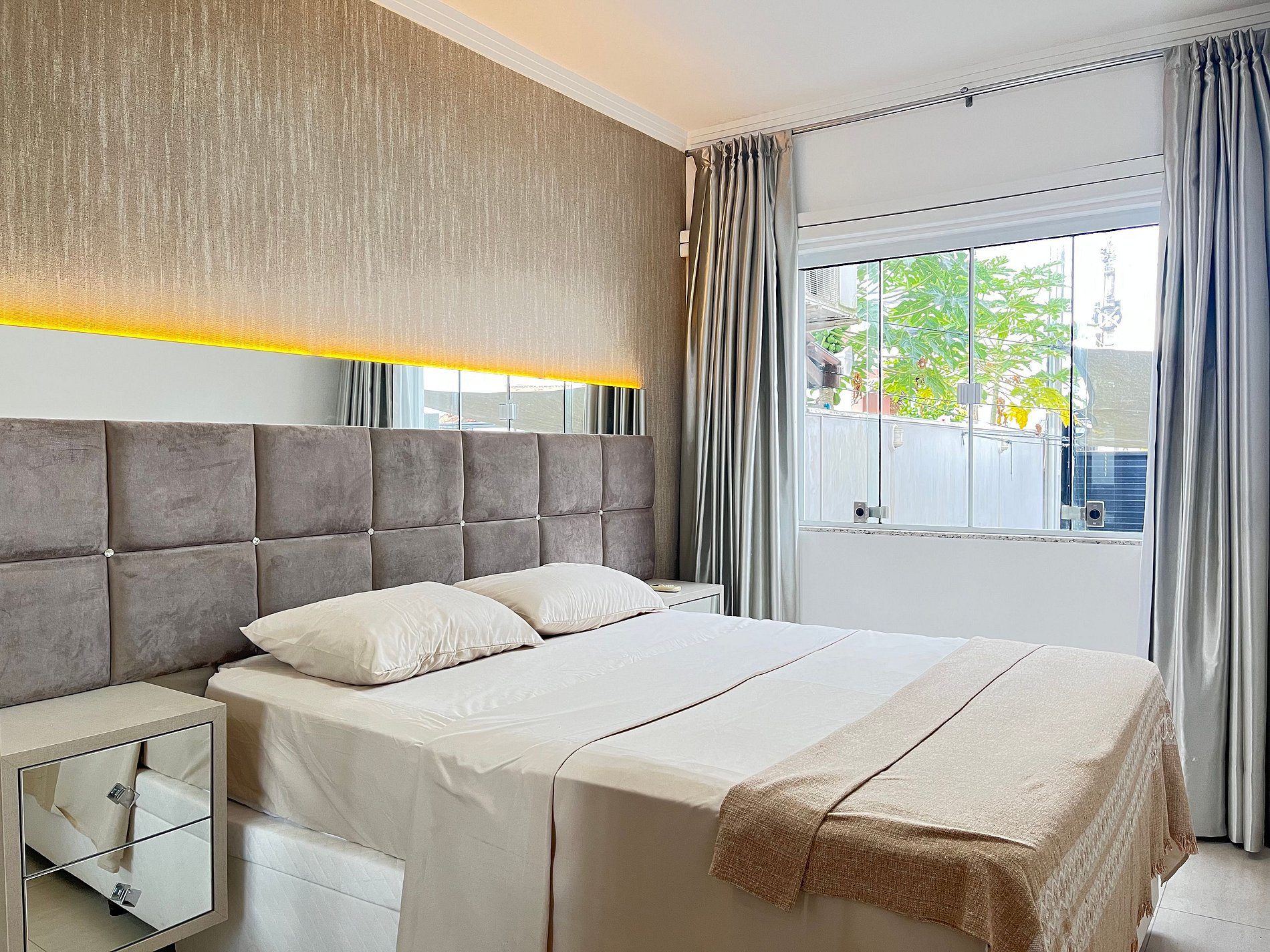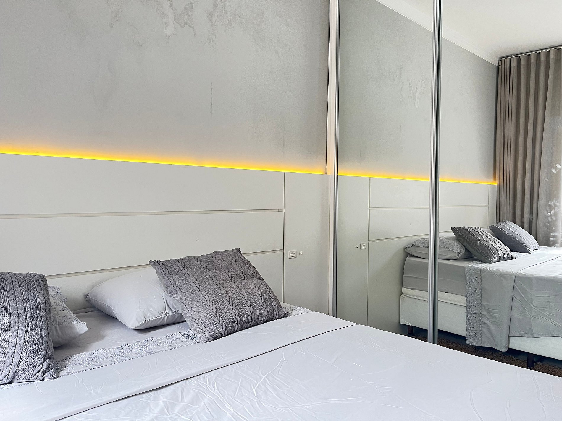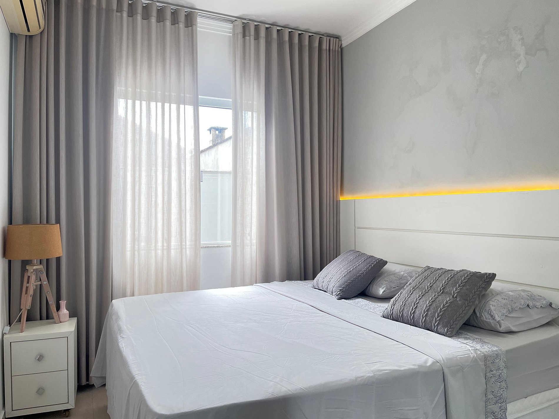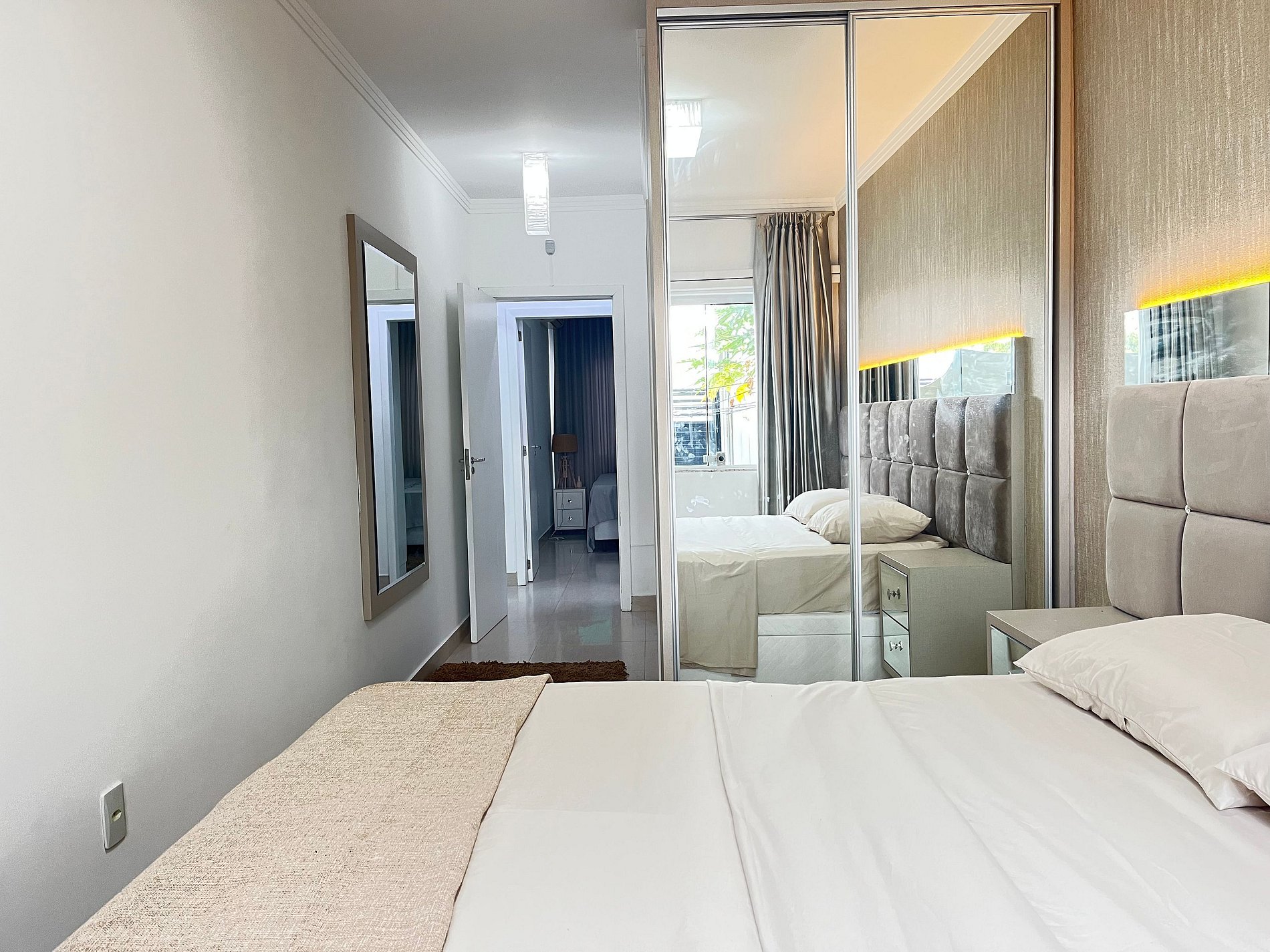 • Quarto 2: cama de casal com cabeceira LED, ar-condicionado split, cortina blackout, armário espelhado, abajur, tomada ao lado da cama e roupa de cama.