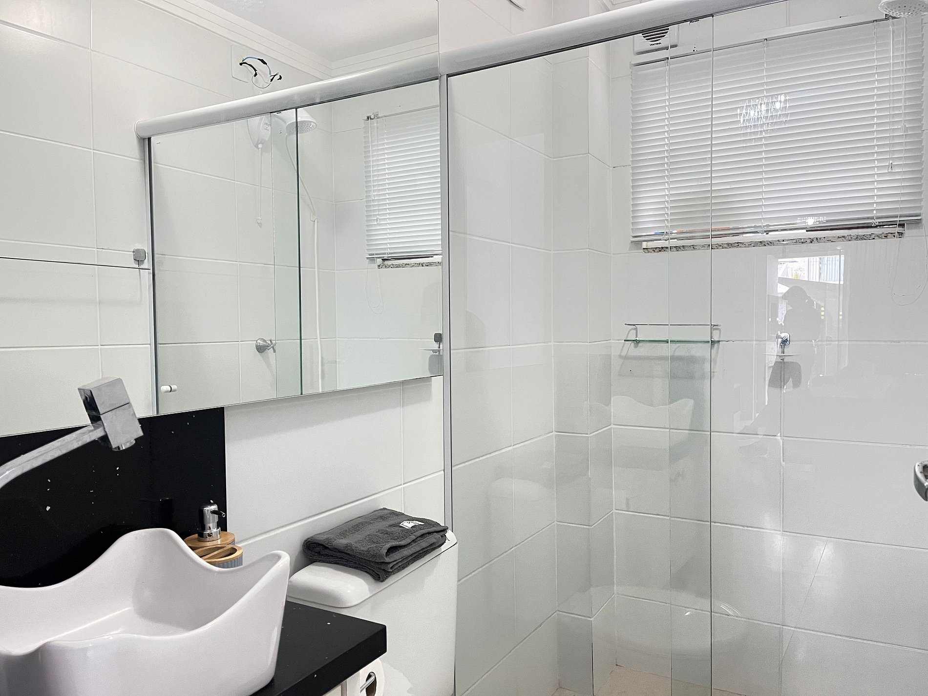 • Suíte: cama king com cabeceira iluminada por LED, colchão de solteiro adicional, ar-condicionado split, armário espelhado, espelho, cortina blackout, roupa de cama e banheiro privativo com água quente, toalhas de corpo e rosto e secador de cabelo.