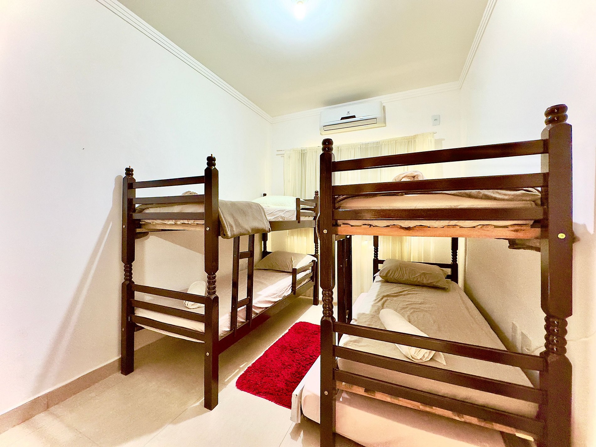 • Quarto 2: com 2 duas camas, sendo uma triliche outra beliche, ar-condicionado split, cortina, armário e roupa de cama.