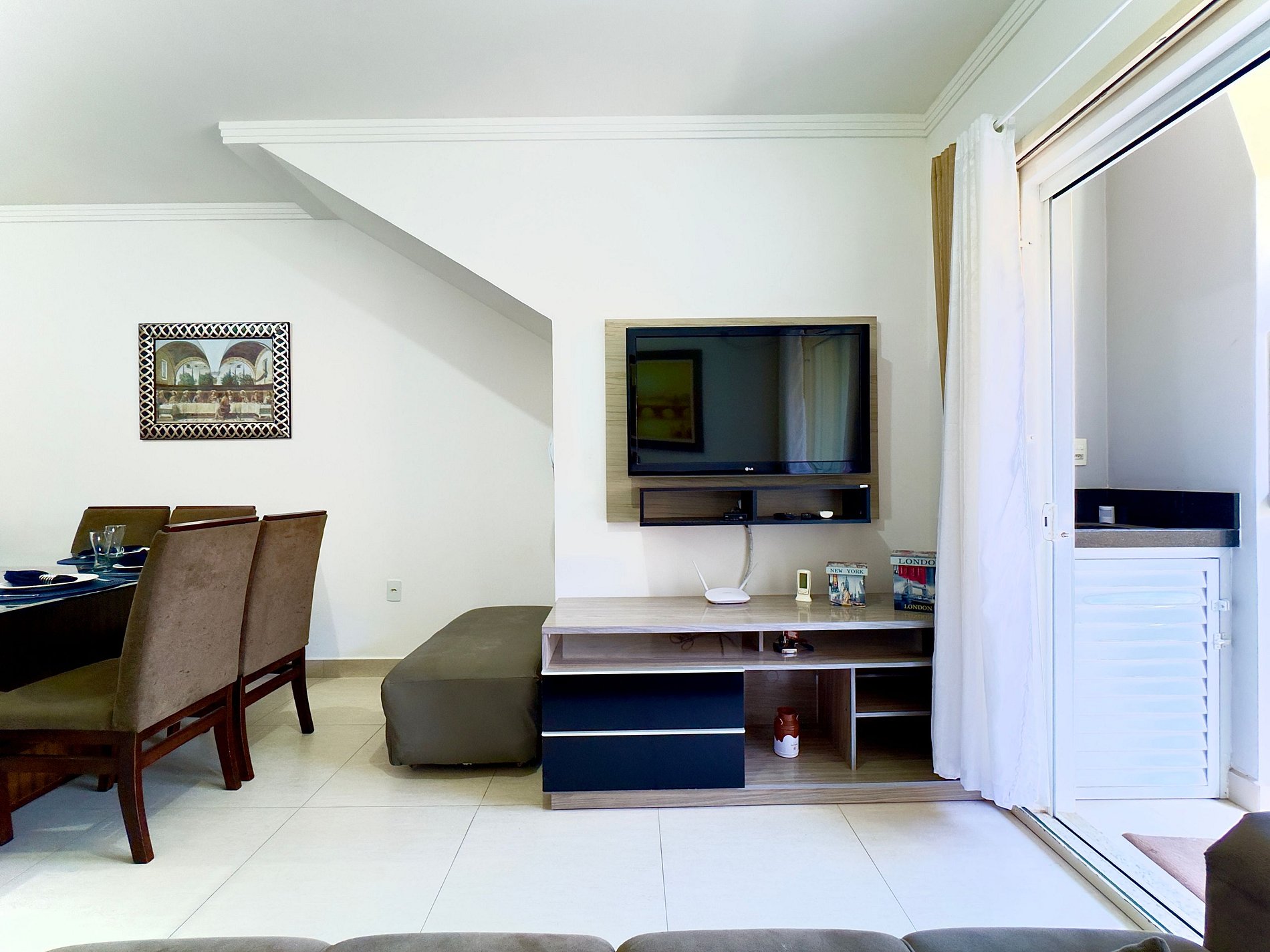 • Sala com ar-condicionado split, sofá espaçoso, cortina, mesa para refeições e TV.
