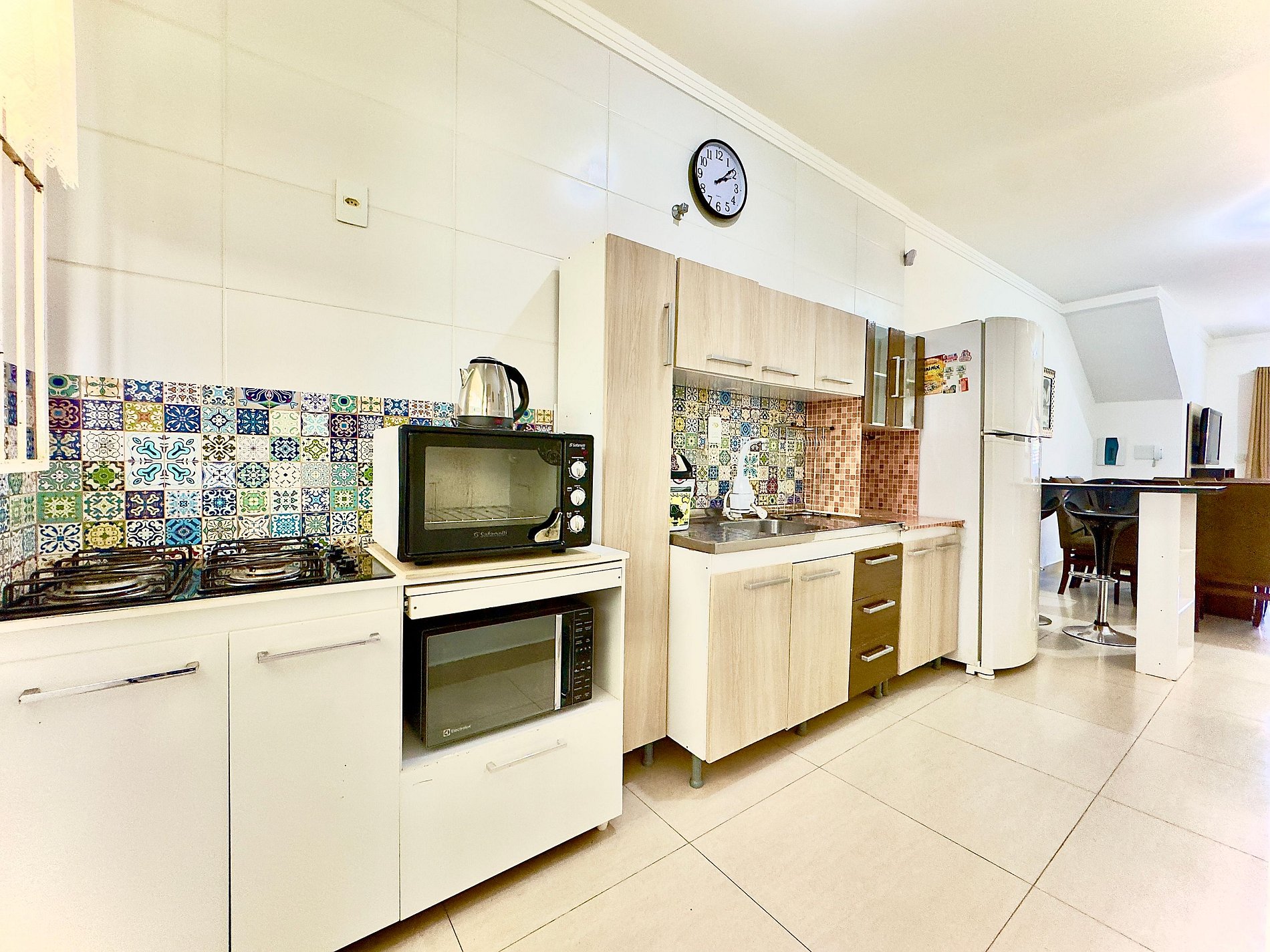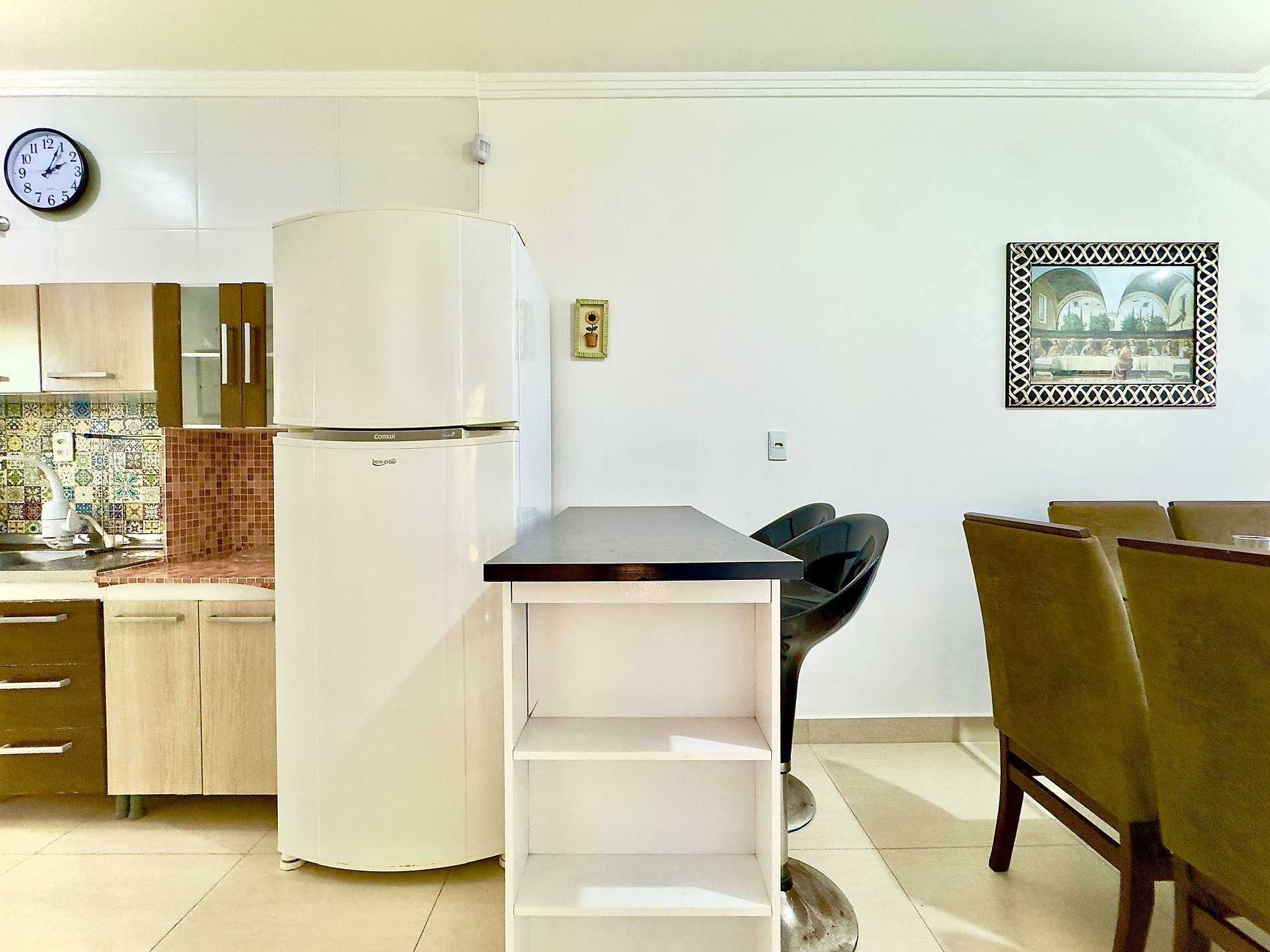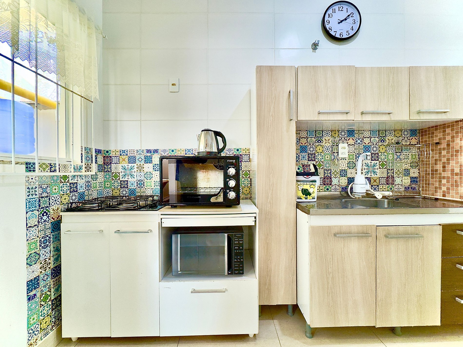 • Geladeira, micro-ondas, forno, cooktop, chaleira elétrica, cafeteira, liquidificador, talheres, copos e utensílios.