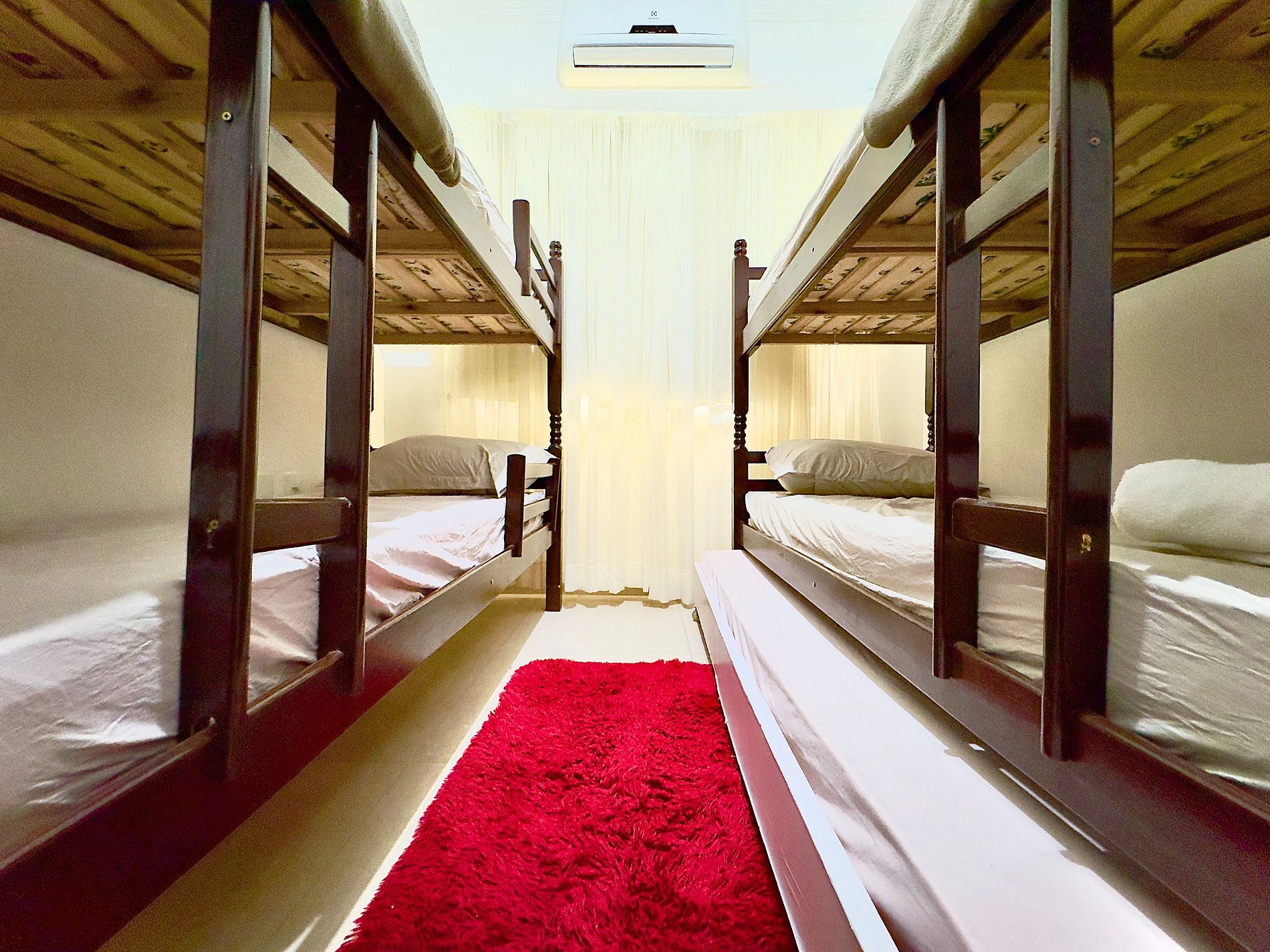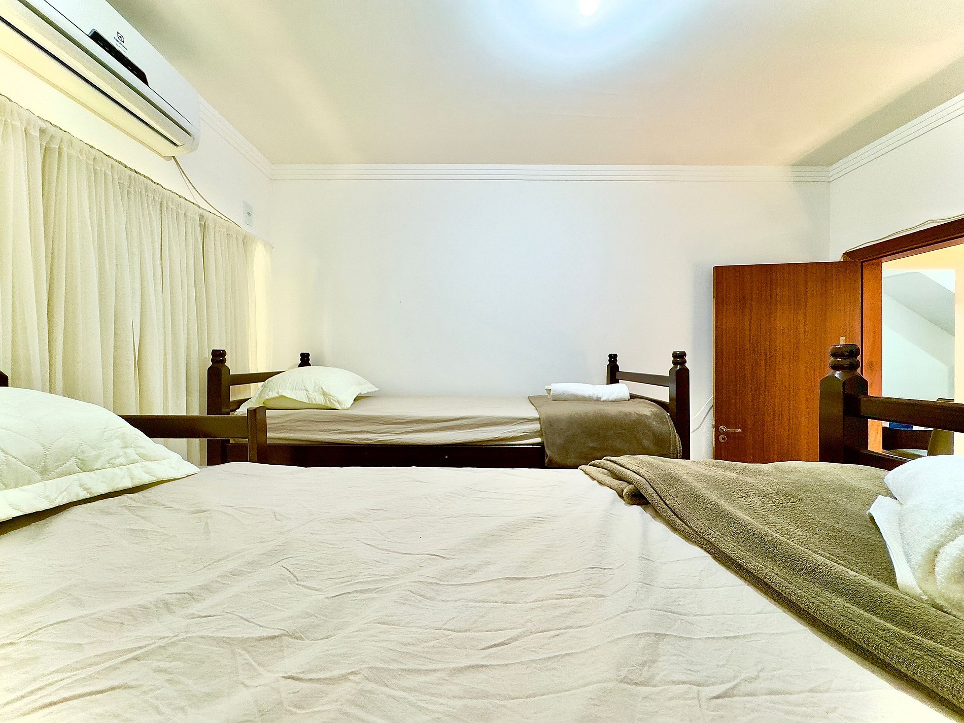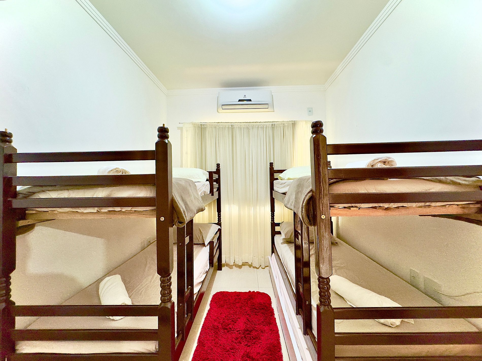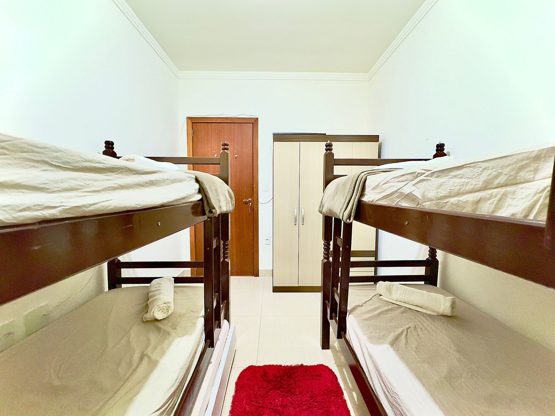 • Quarto 2: com 2 duas camas, sendo uma triliche outra beliche, ar-condicionado split, cortina, armário e roupa de cama.