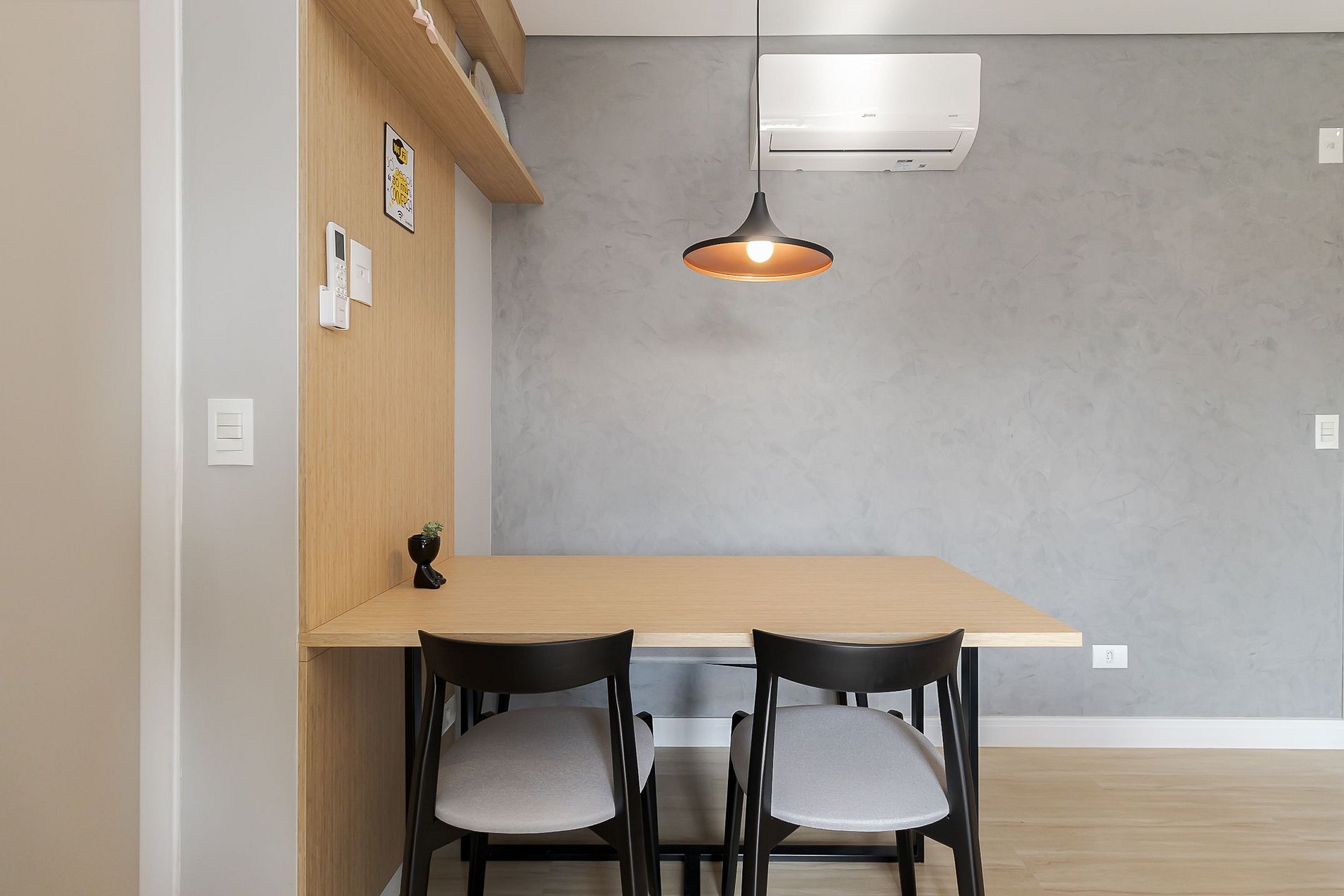 Conta com 1 suíte, 1 quarto de solteiro, banheiro, cozinha completa e varanda . A sala integrada à cozinha é perfeita para refeições, trabalho ou relaxar.