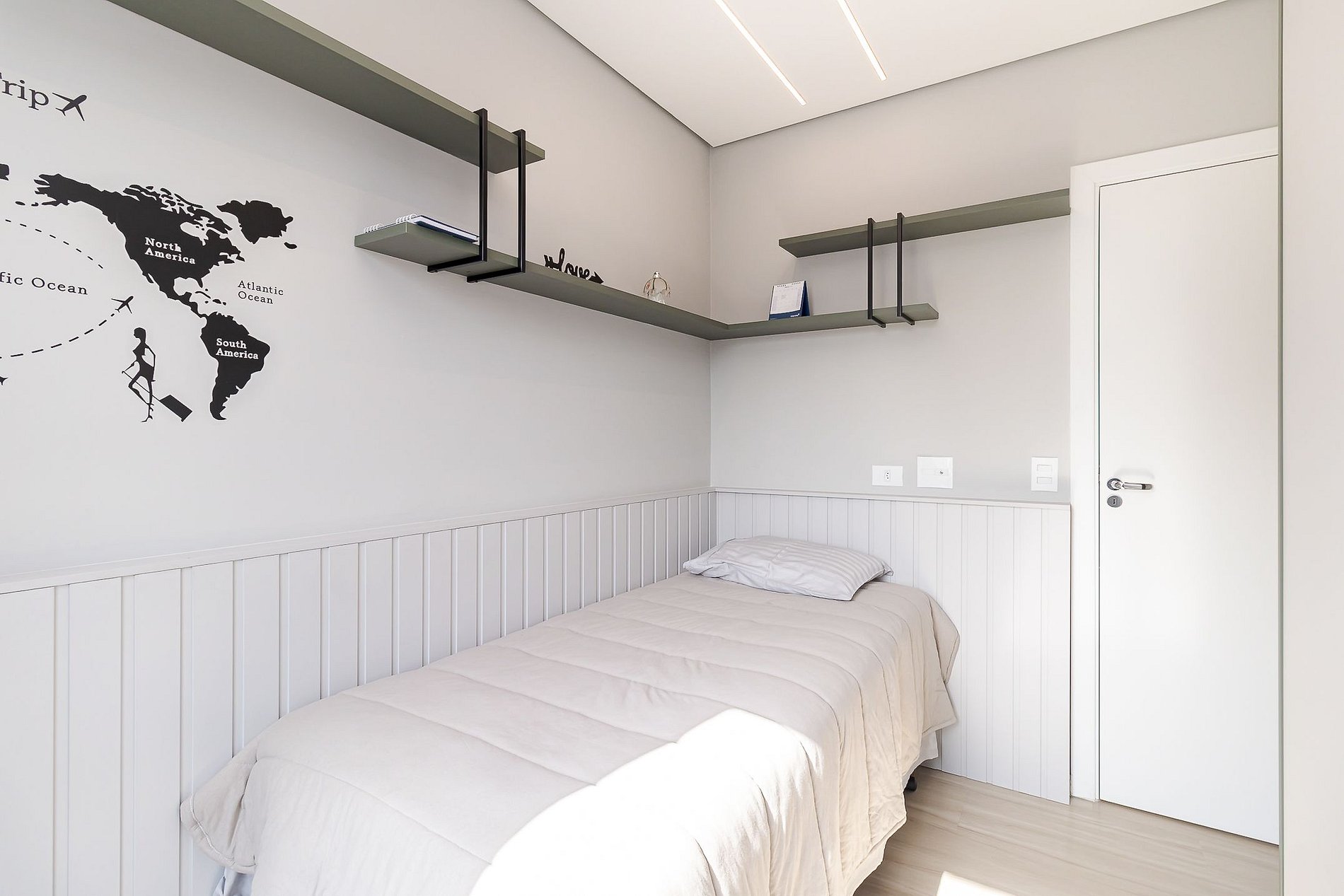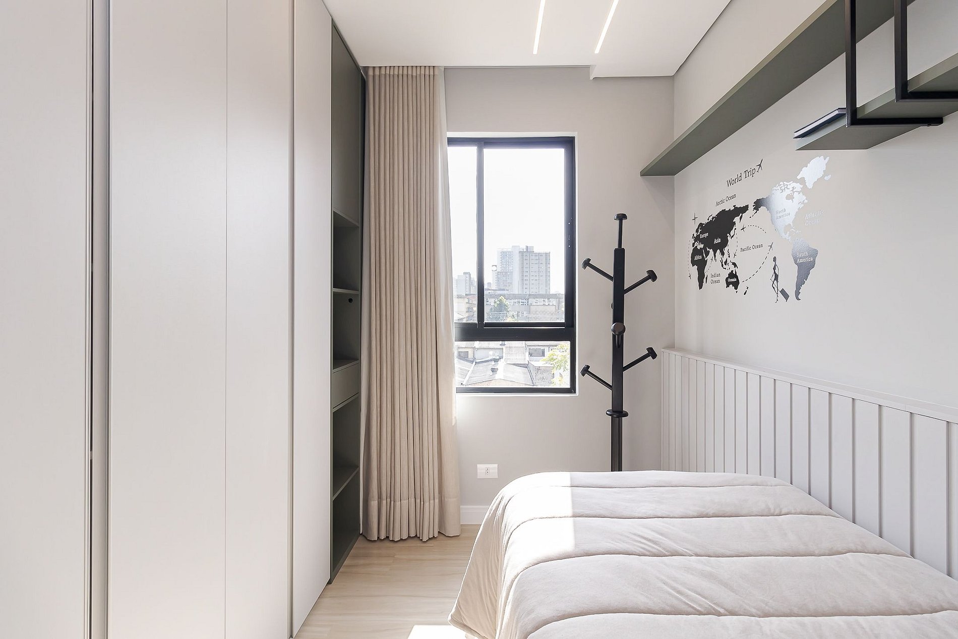 • O segundo quarto possui cama de solteiro, cortina, armário e cabideiro.