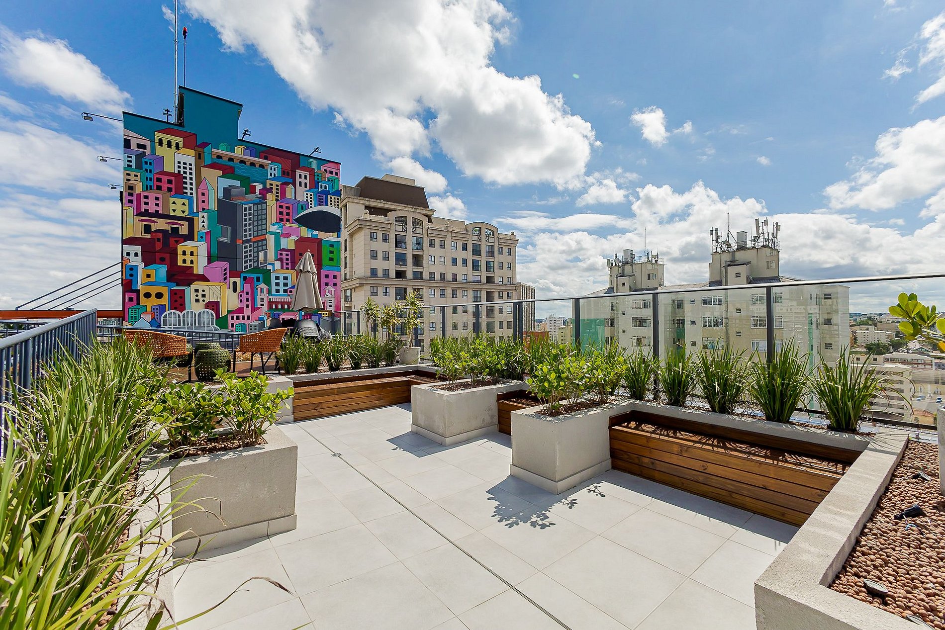 Entre os destaques estão o espaço de coworking, lavanderia compartilhada, sala de leitura e estudos, academia interna e ao ar livre, sala de jogos e um rooftop com piscina de raia de 20 metros e vista deslumbrante para a cidade. Todas as áreas comuns contam com Wi-Fi e o acesso às unidades é feito por fechadura digital, garantindo segurança e autonomia.