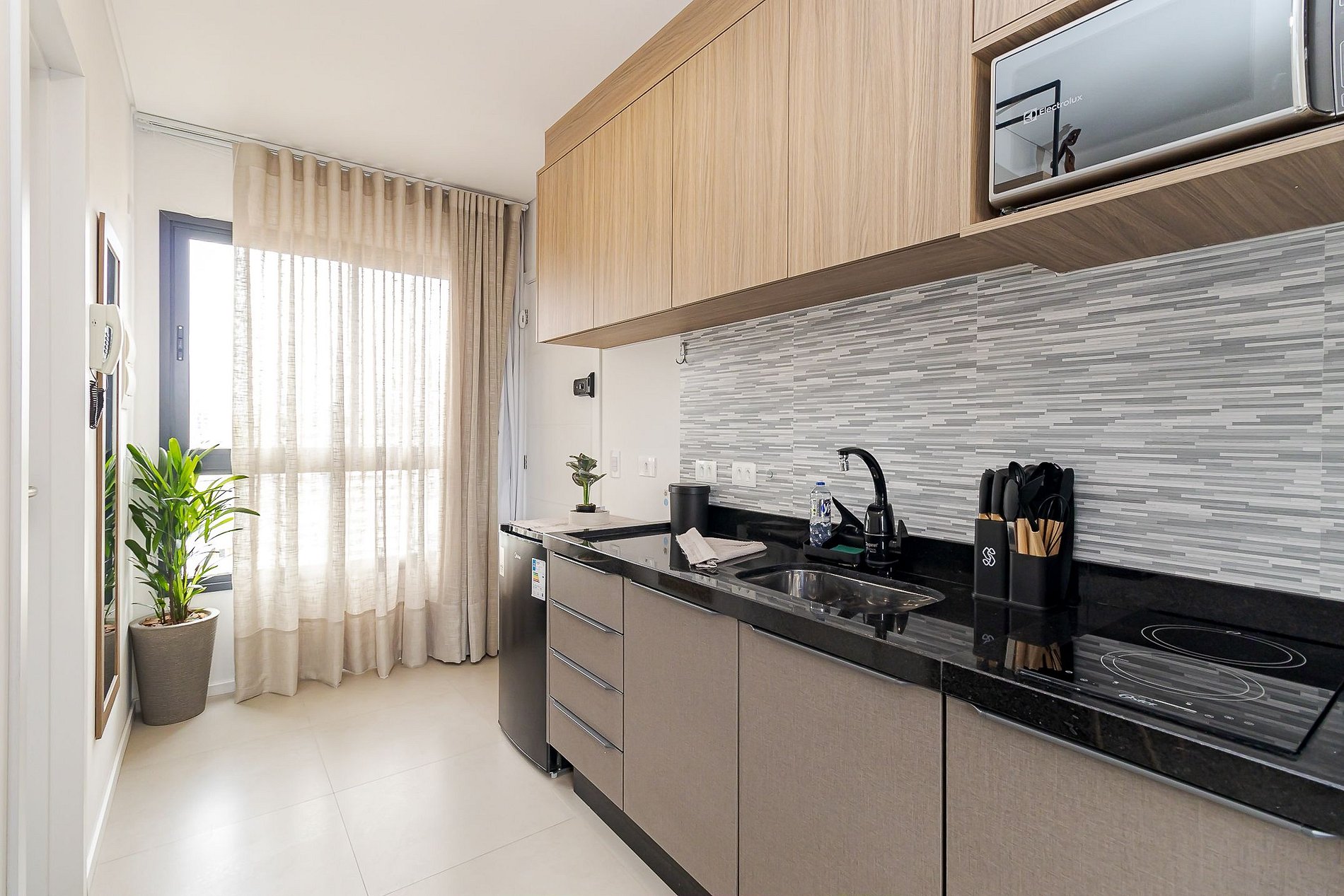 • Cozinha: frigobar, cooktop, micro-ondas, chaleira elétrica, máquina de café, panelas, pratos, copos, talheres e utensílios básicos.