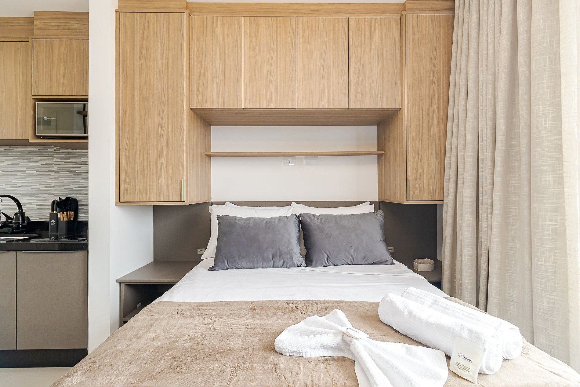 • Ambiente integrado: cama de casal, mesa para 2 pessoas que pode ser usada para refeições ou trabalho, TV Smart, ar-condicionado split, armários aéreos e cortina privativa.
