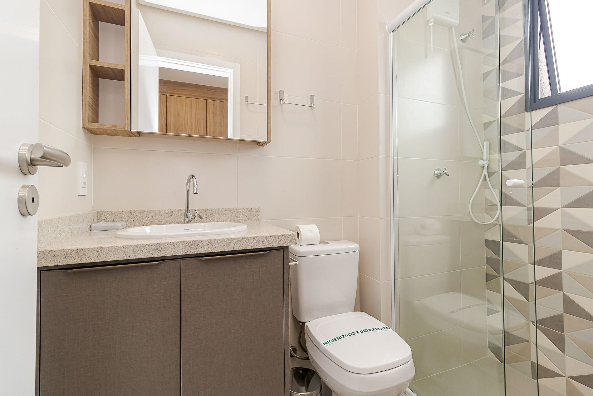 • Banheiro: completo, com box de vidro, armário espelhado e chuveiro com água quente.