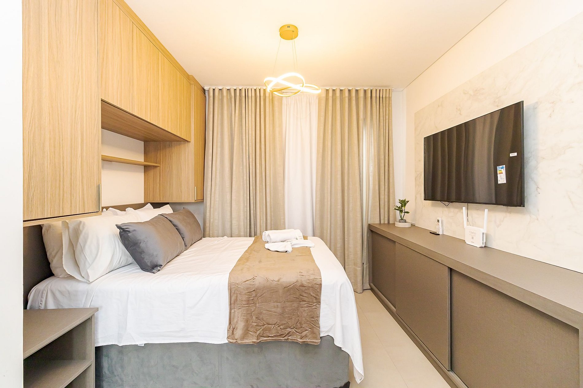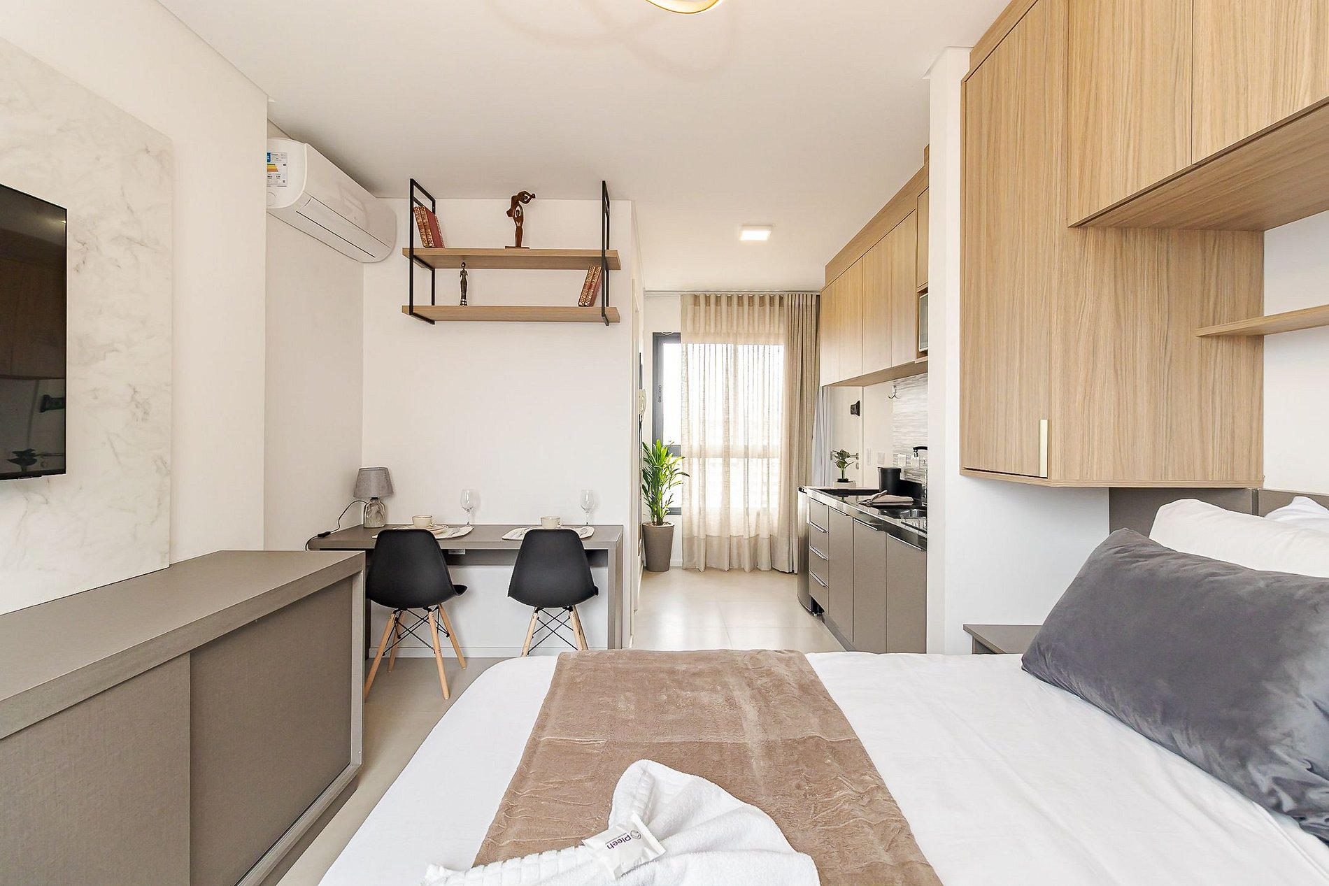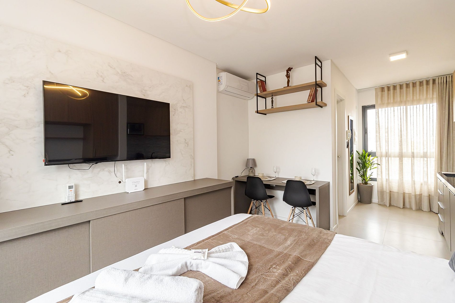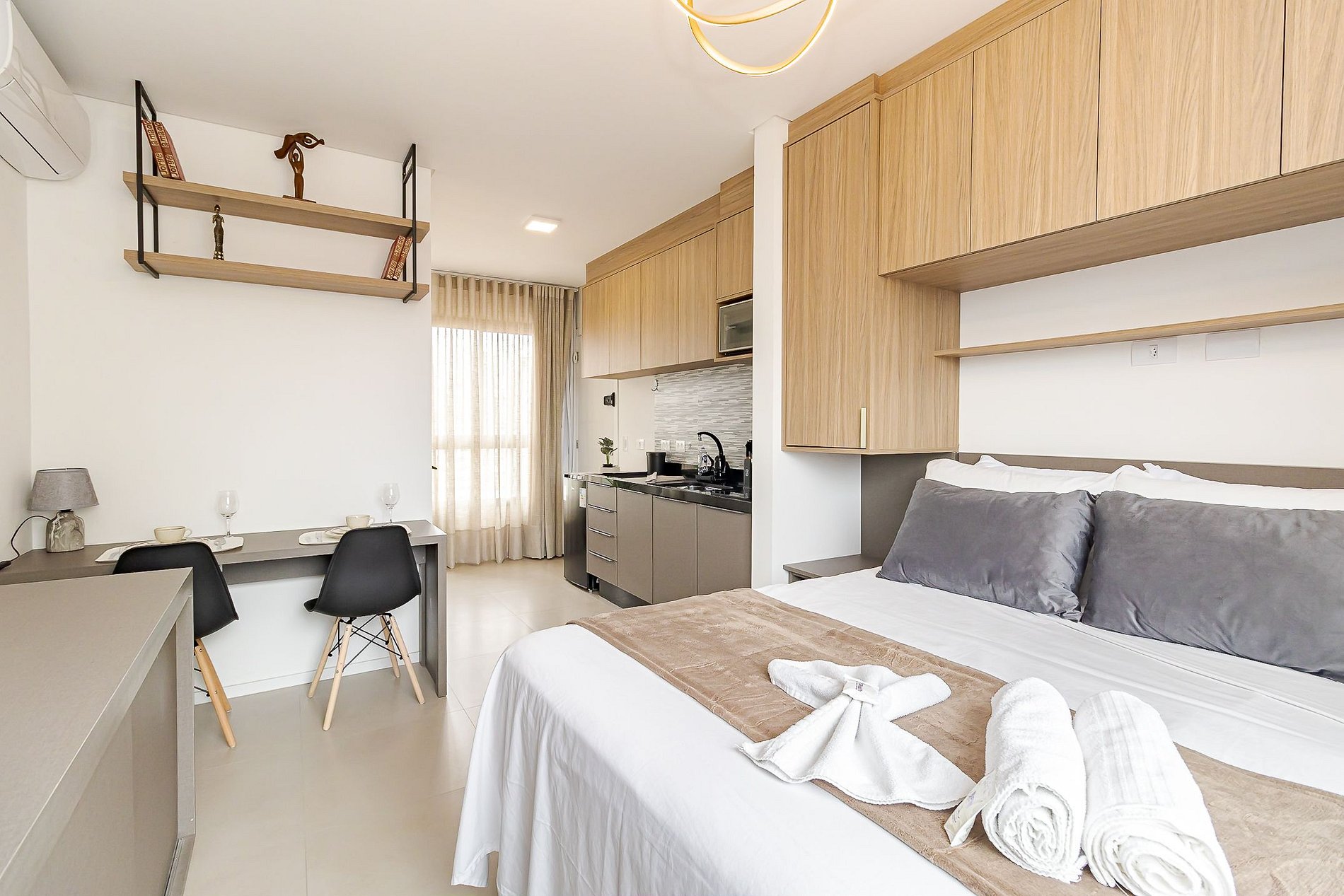 • Ambiente integrado: cama de casal, mesa para 2 pessoas que pode ser usada para refeições ou trabalho, TV Smart, ar-condicionado split, armários aéreos e cortina privativa.