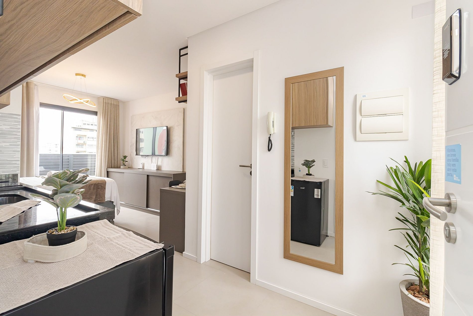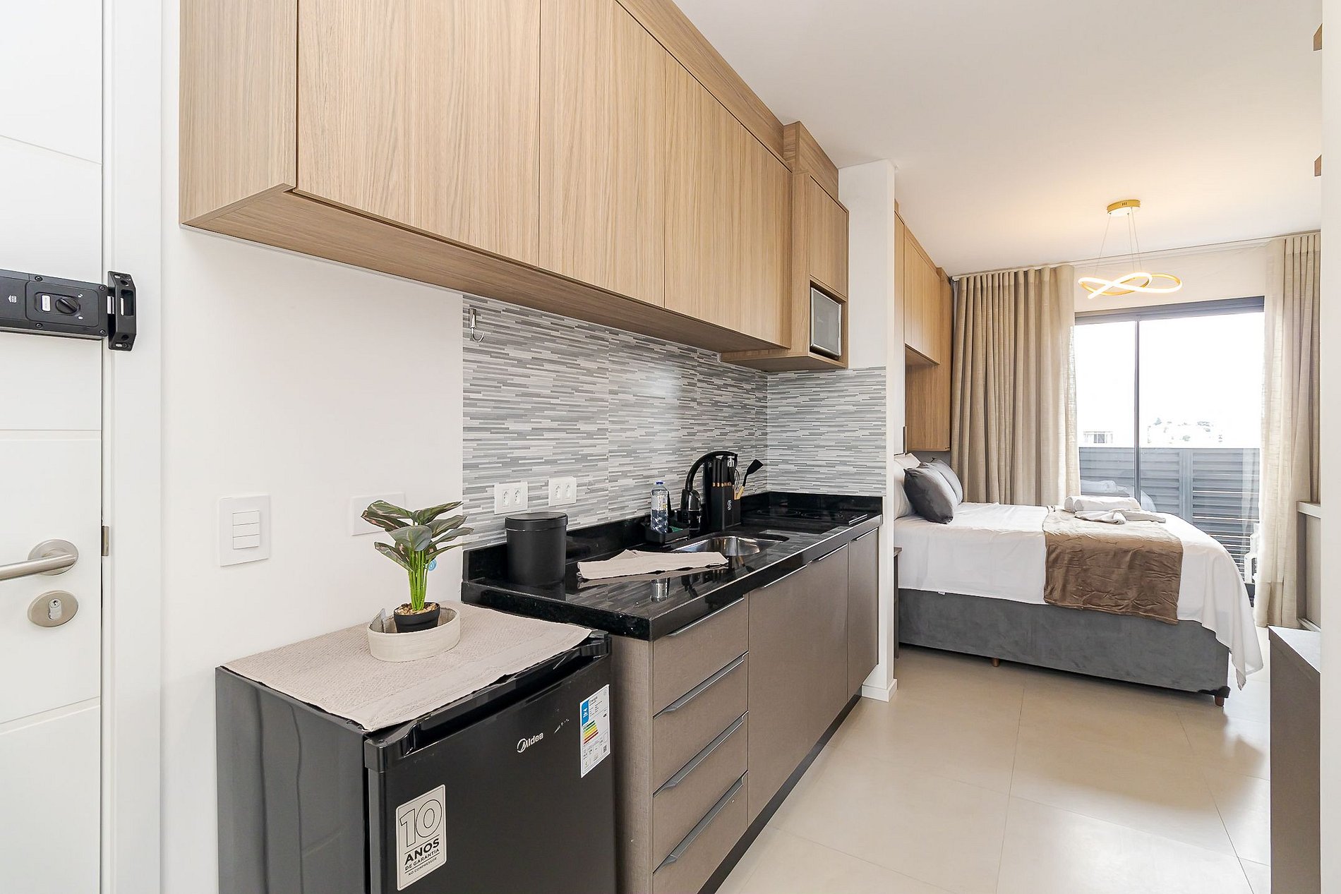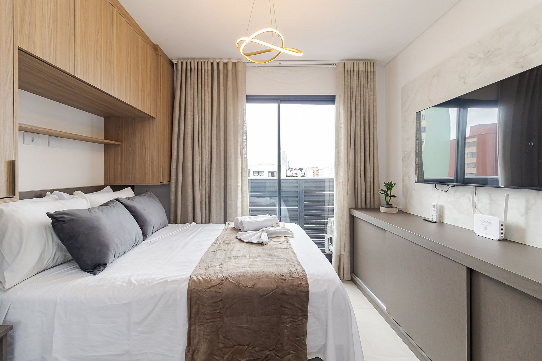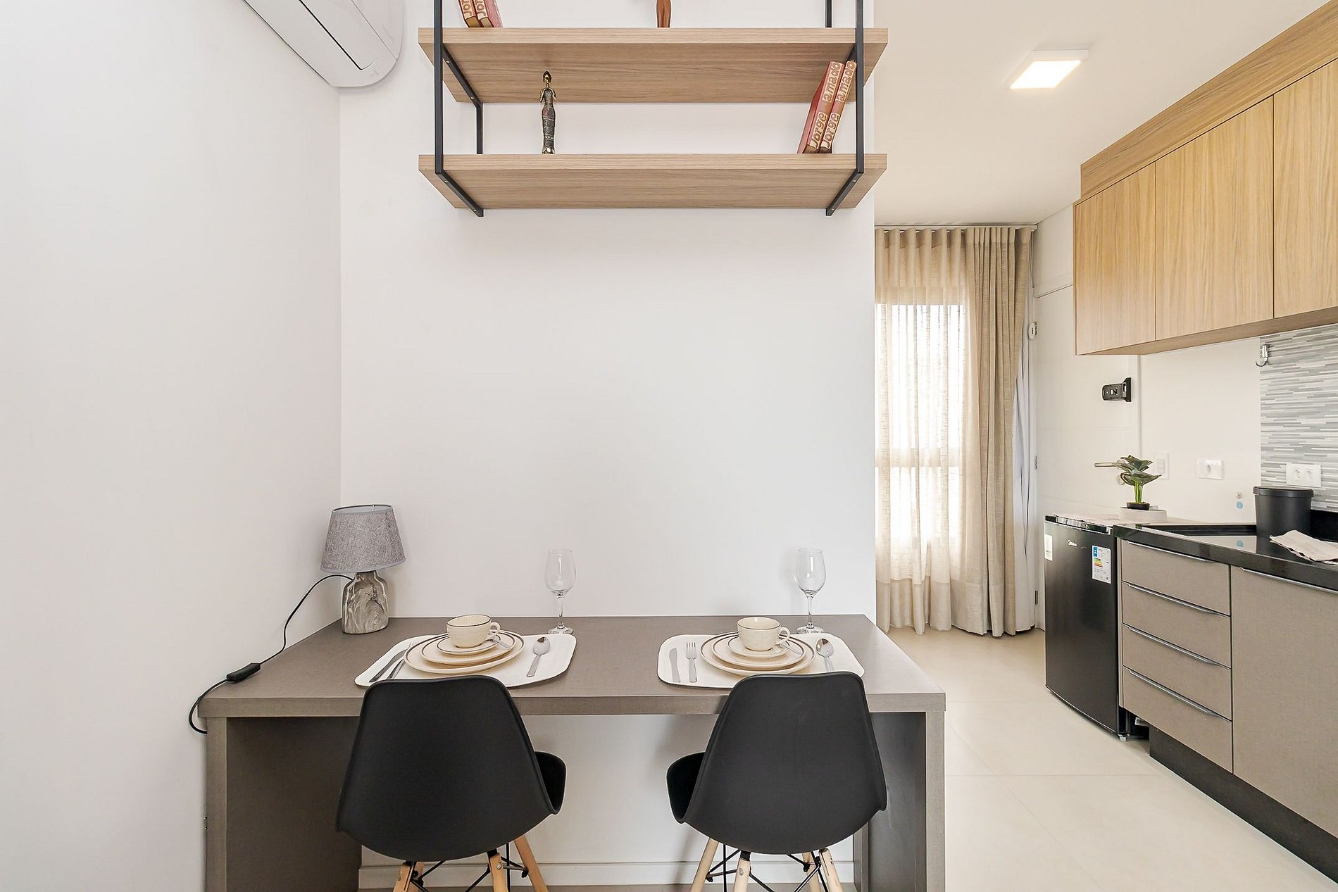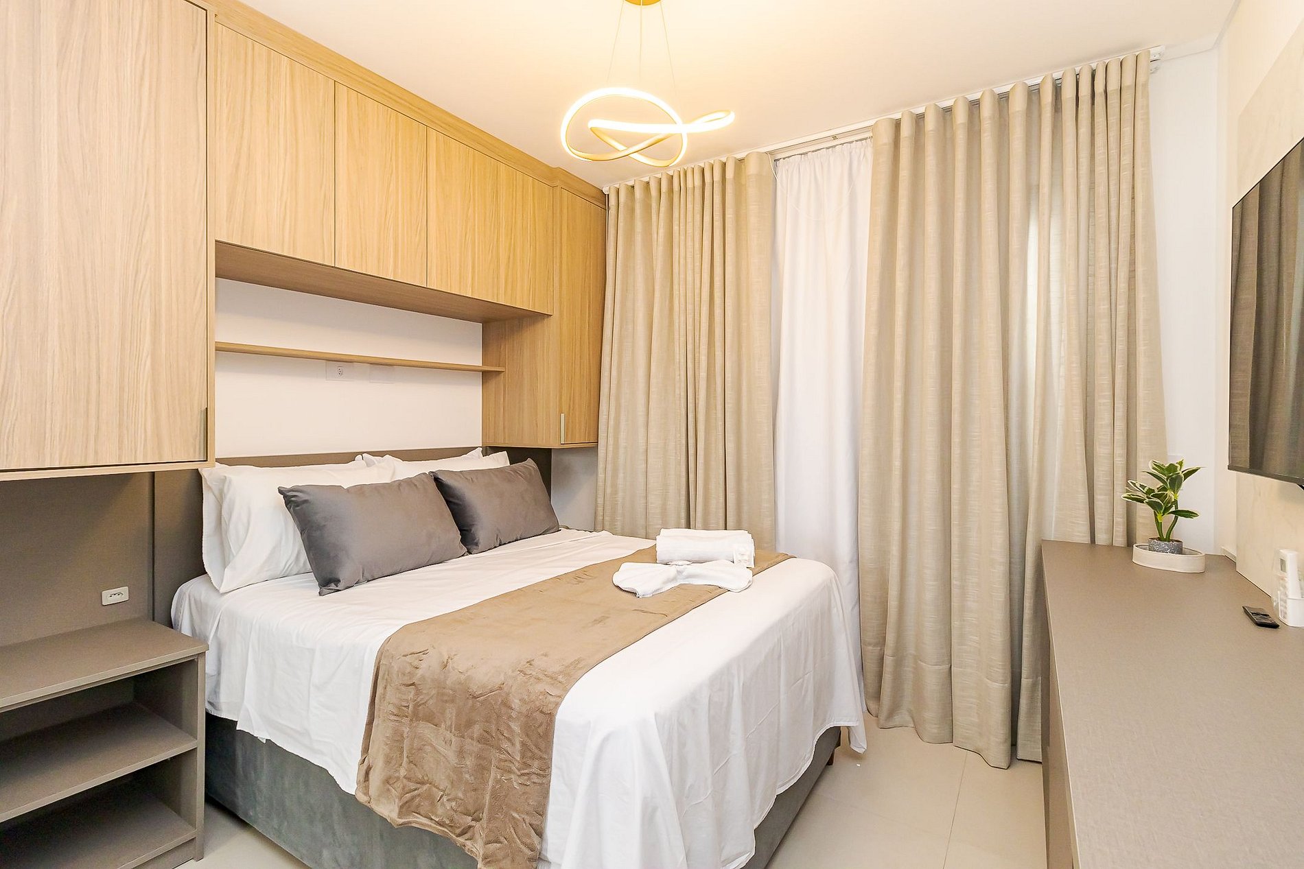 • Ambiente integrado: cama de casal, mesa para 2 pessoas que pode ser usada para refeições ou trabalho, TV Smart, ar-condicionado split, armários aéreos e cortina privativa.