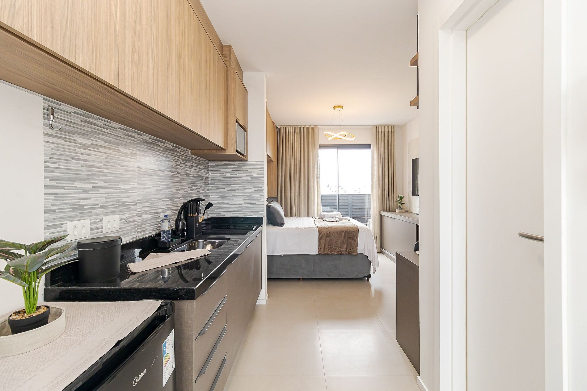 Com 24 m², o espaço acomoda até 2 hóspedes em um ambiente funcional, com cama de casal, cozinha completa e varanda.