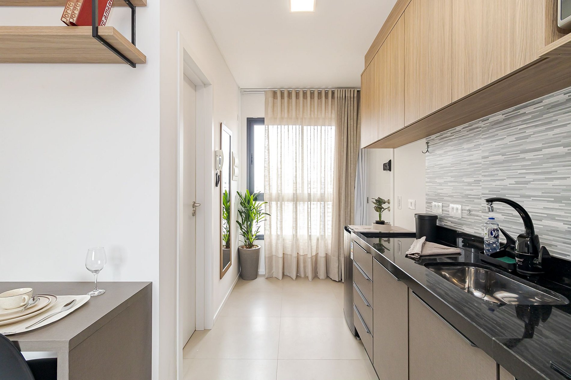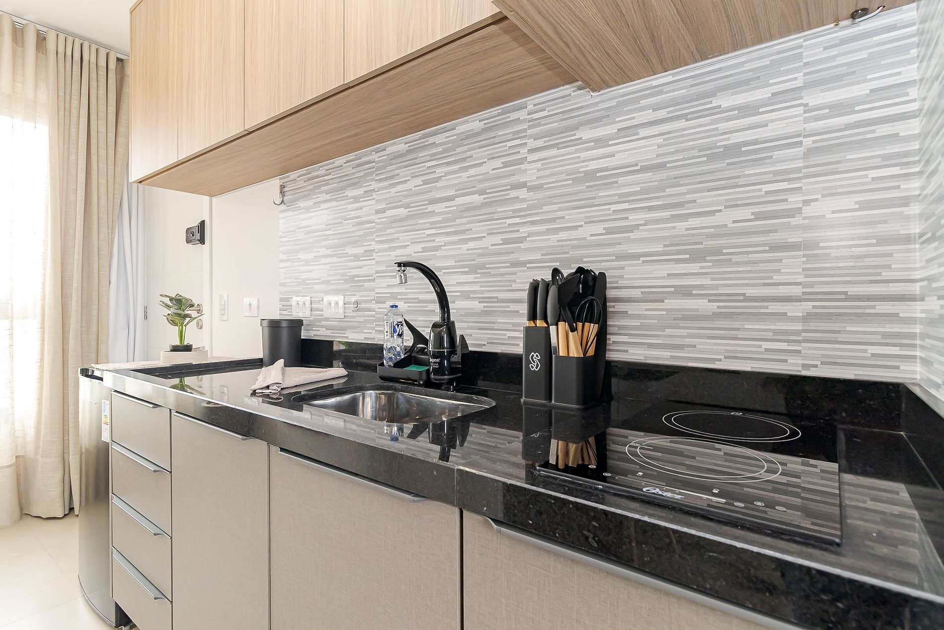 • Cozinha: frigobar, cooktop, micro-ondas, chaleira elétrica, máquina de café, panelas, pratos, copos, talheres e utensílios básicos.