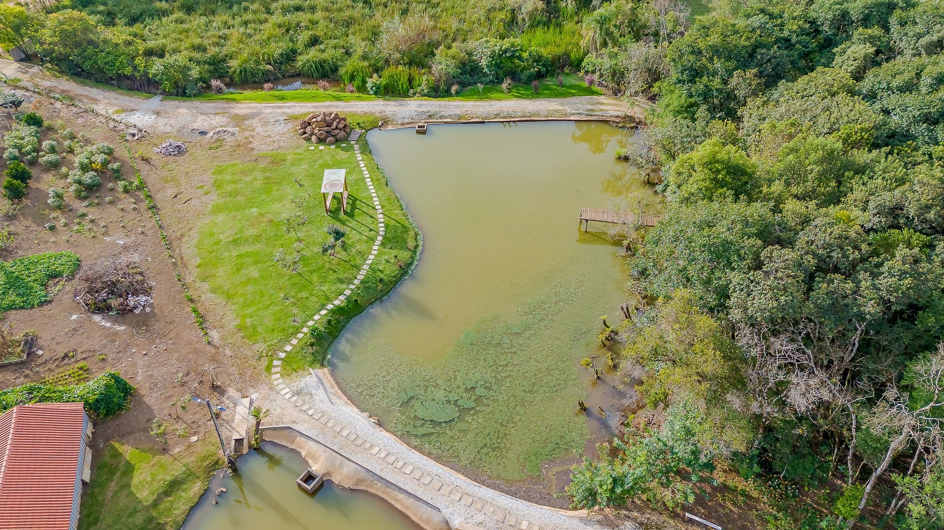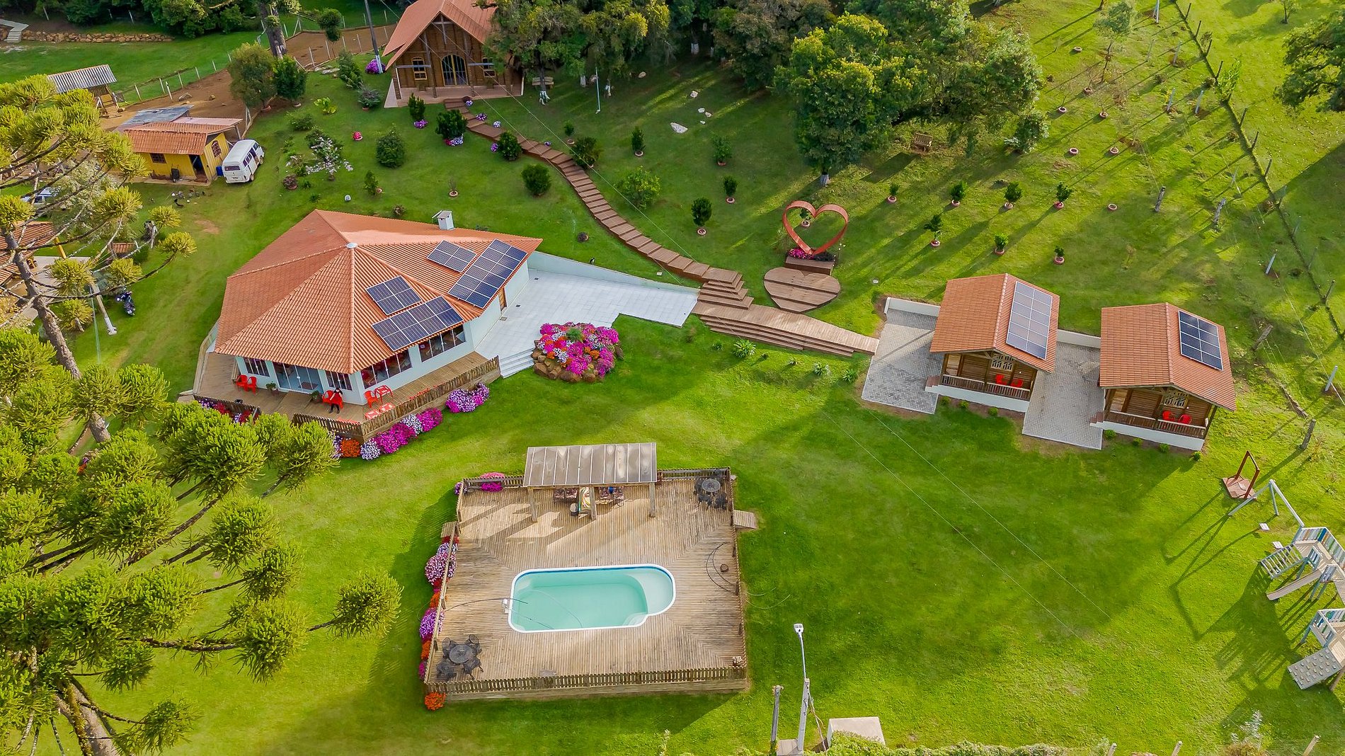 Localizada em Campo Magro, a Chácara Santa Rita oferece uma infraestrutura completa para lazer e descanso: piscina, lago com pedalinho, fazendinha com animais, pista de skate, quadra de futebol, trilhas para caminhada, redário para relaxar e uma charmosa capela para momentos de paz.