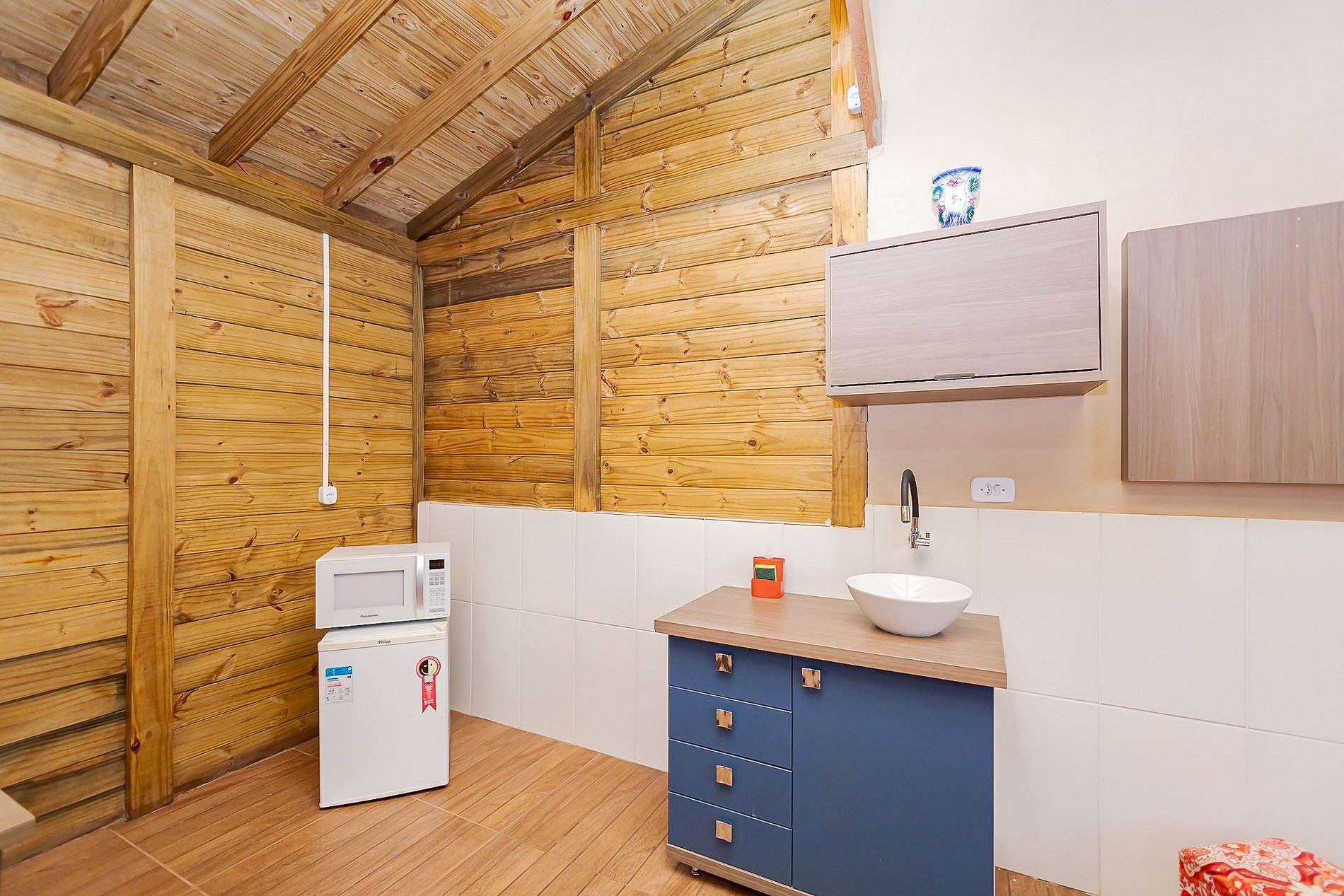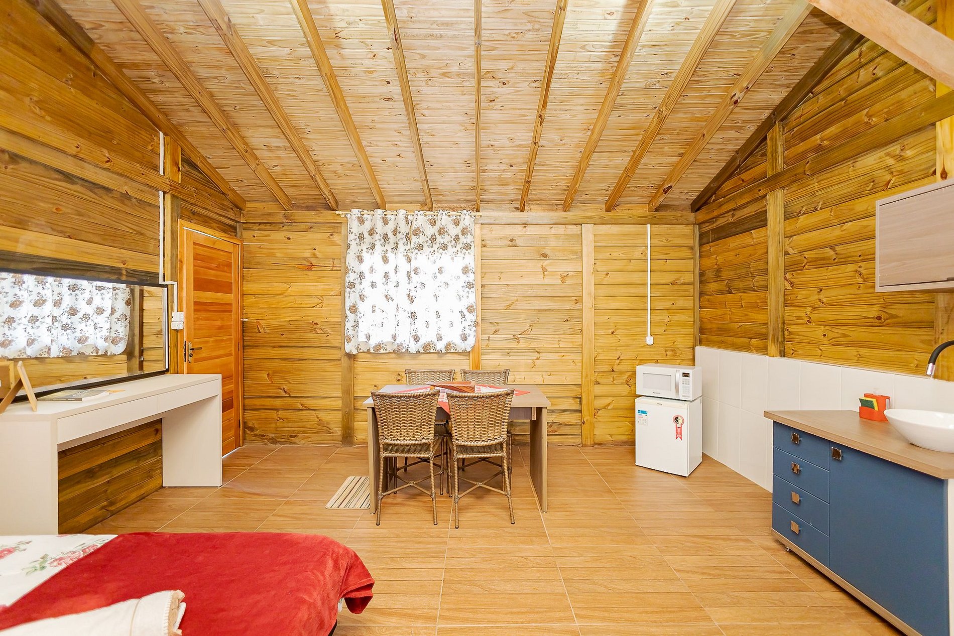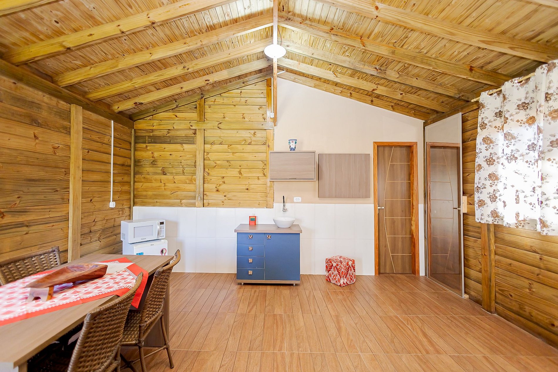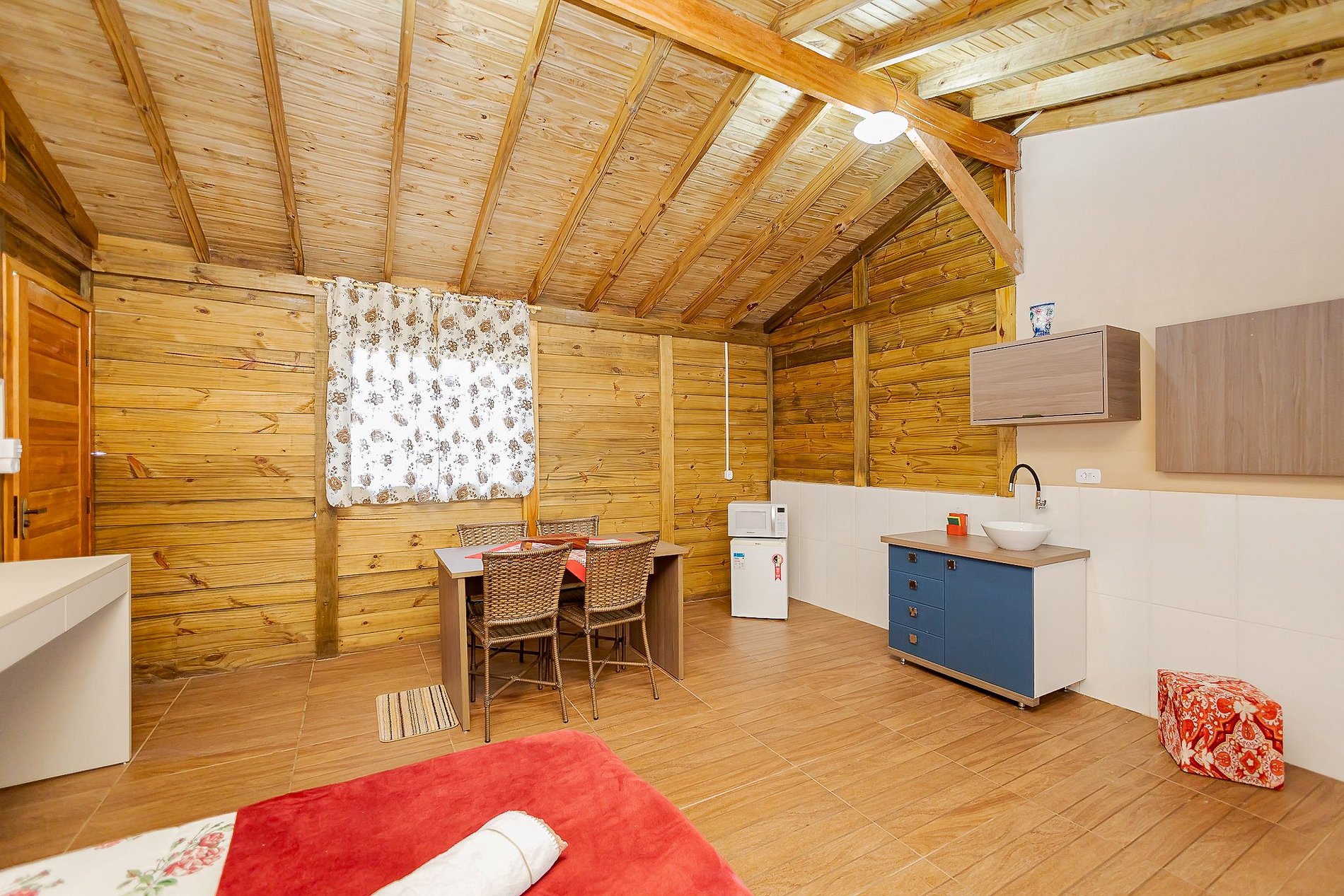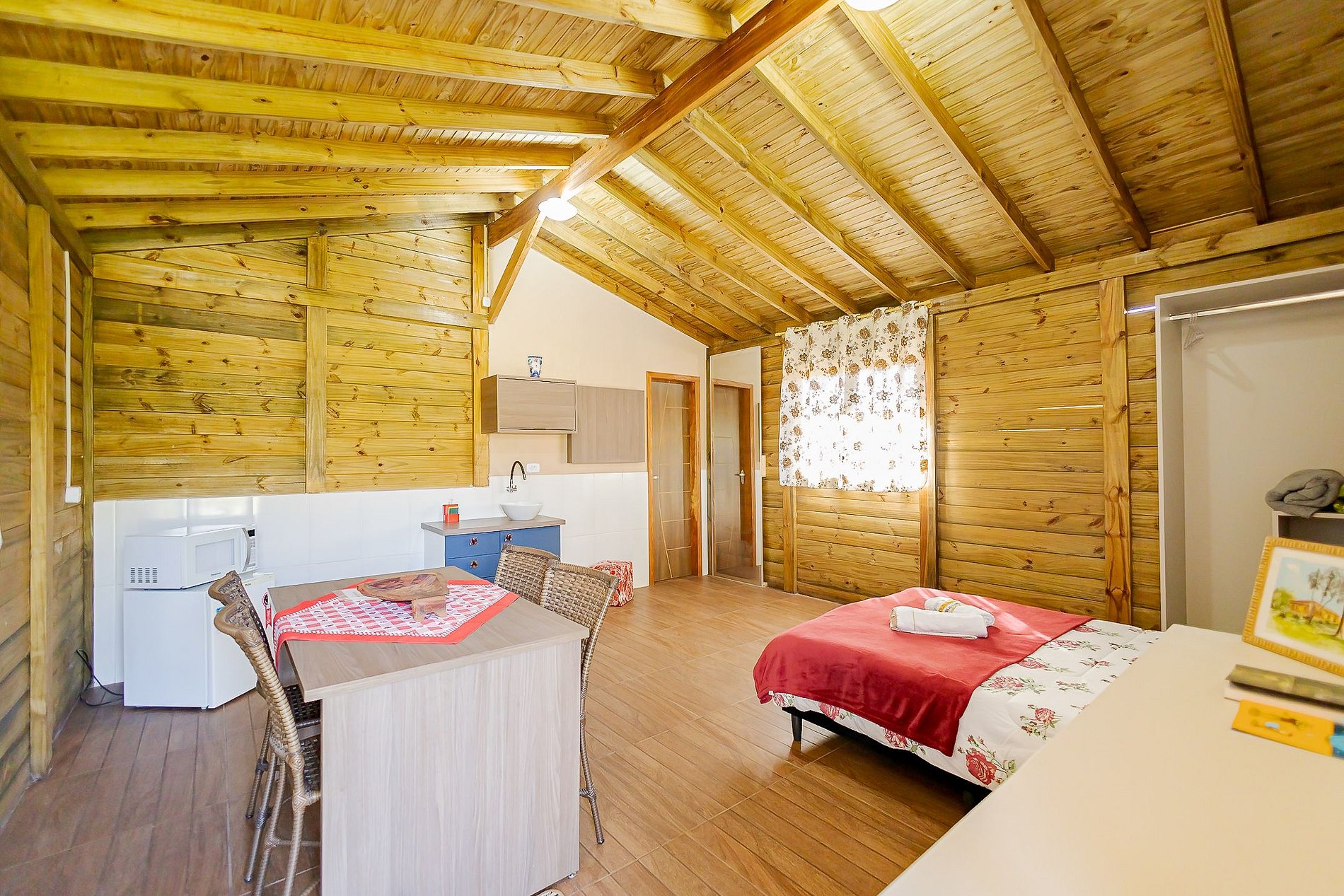 O Chalé Beija-Flor acomoda até 2 hóspedes e oferece uma cama de casal confortável, mesa para refeições, cozinha equipada com microondas, frigobar, pia com armário e cuba, além de utensílios como pratos, talheres e copos.