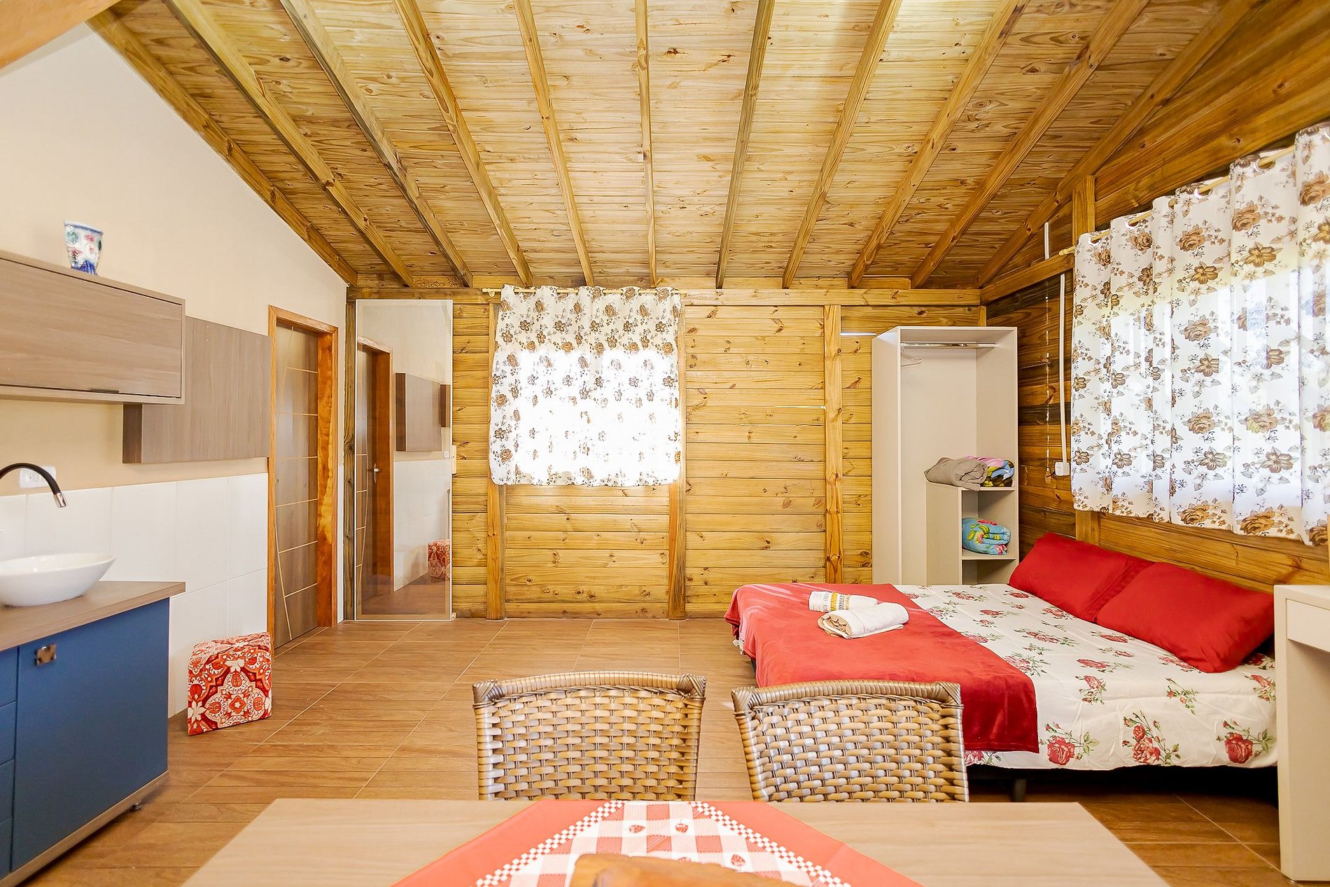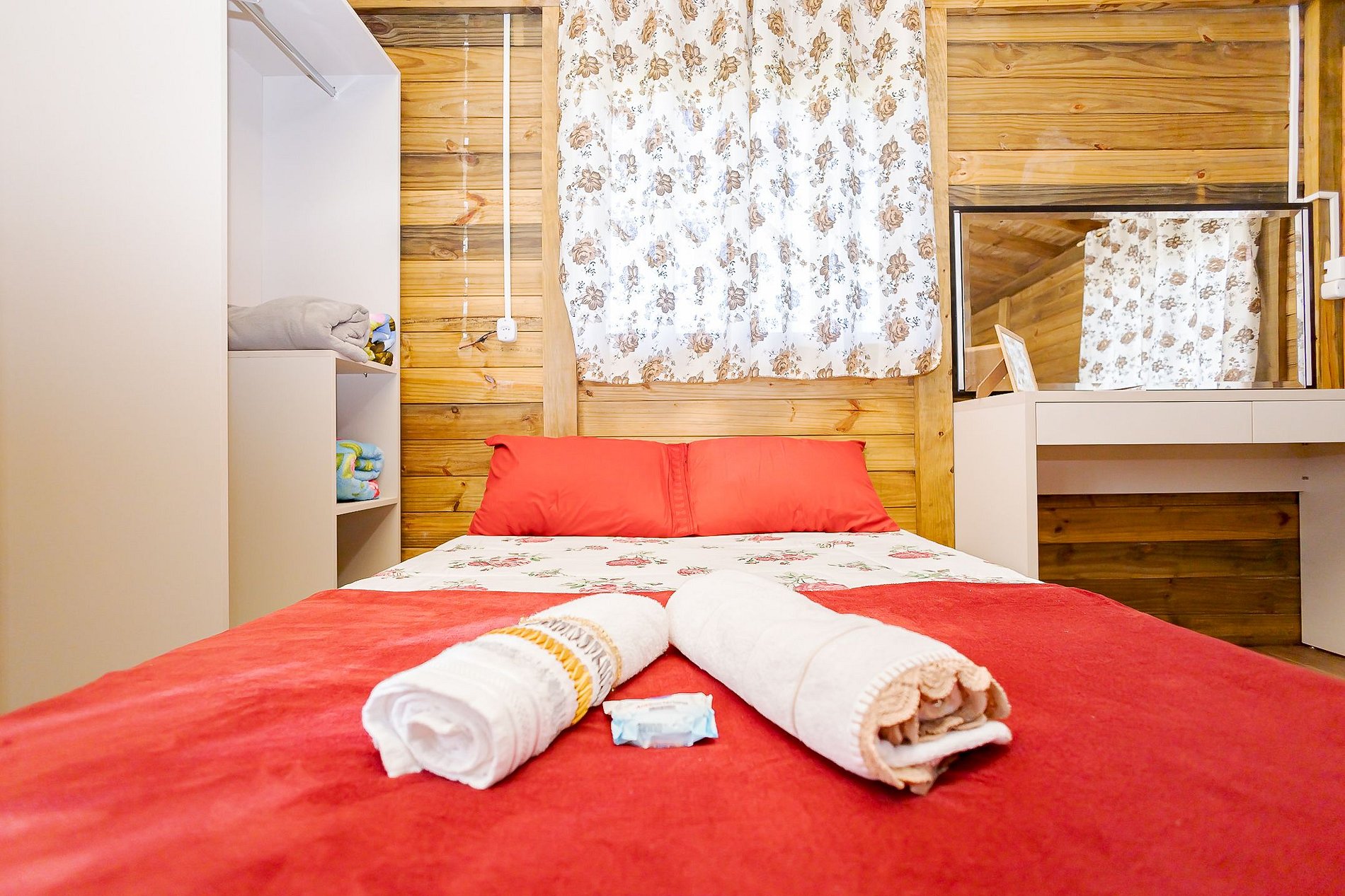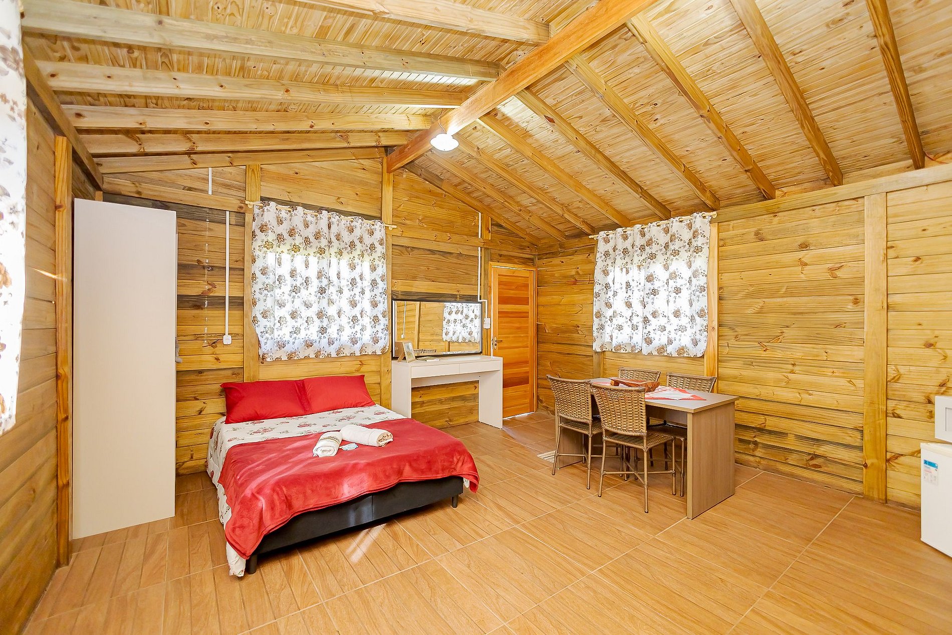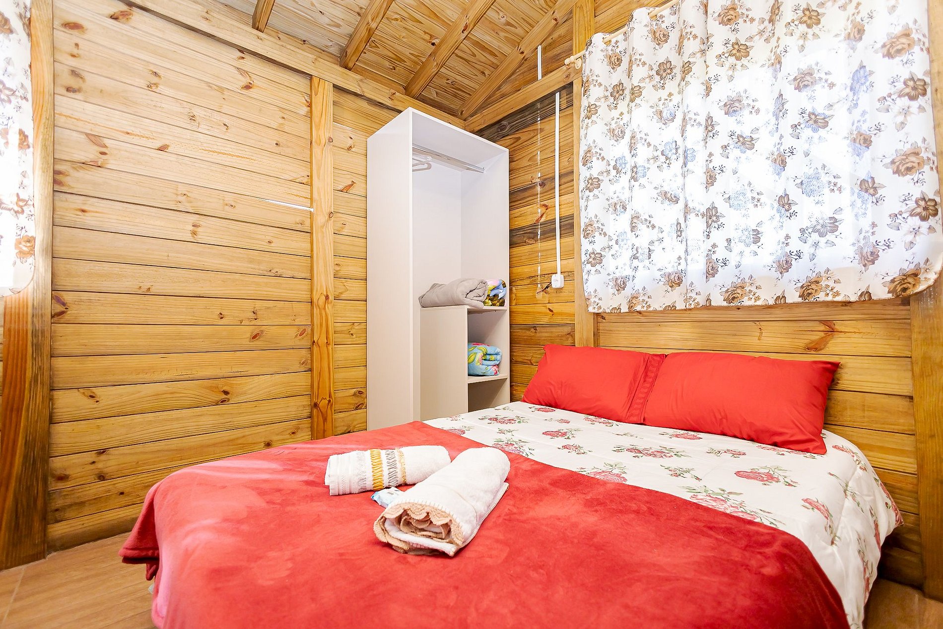 Para maior comodidade, o chalé também possui armário com cabideiro, além de roupas de cama e toalhas para todos os hóspedes.