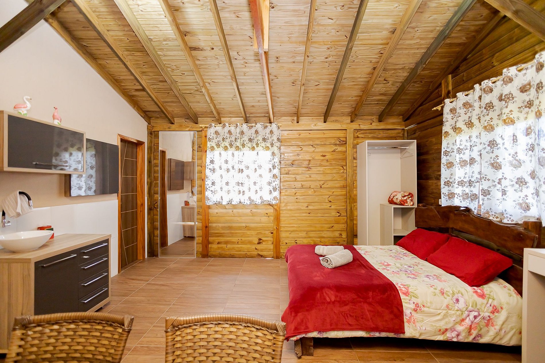 Para maior comodidade, o chalé também possui armário com cabideiro, além de roupas de cama e toalhas para todos os hóspedes.