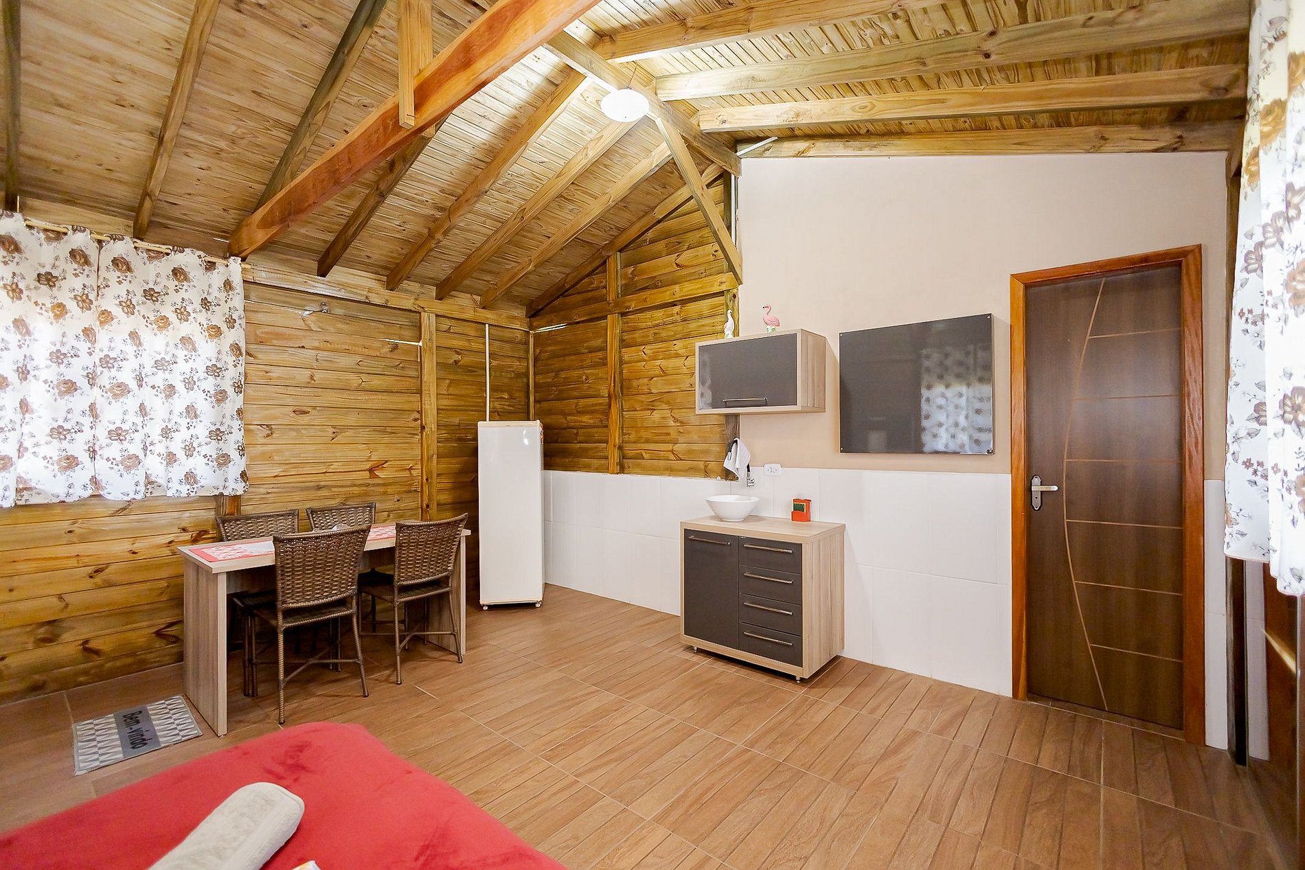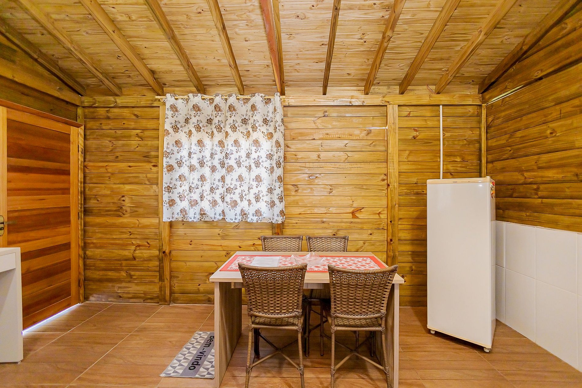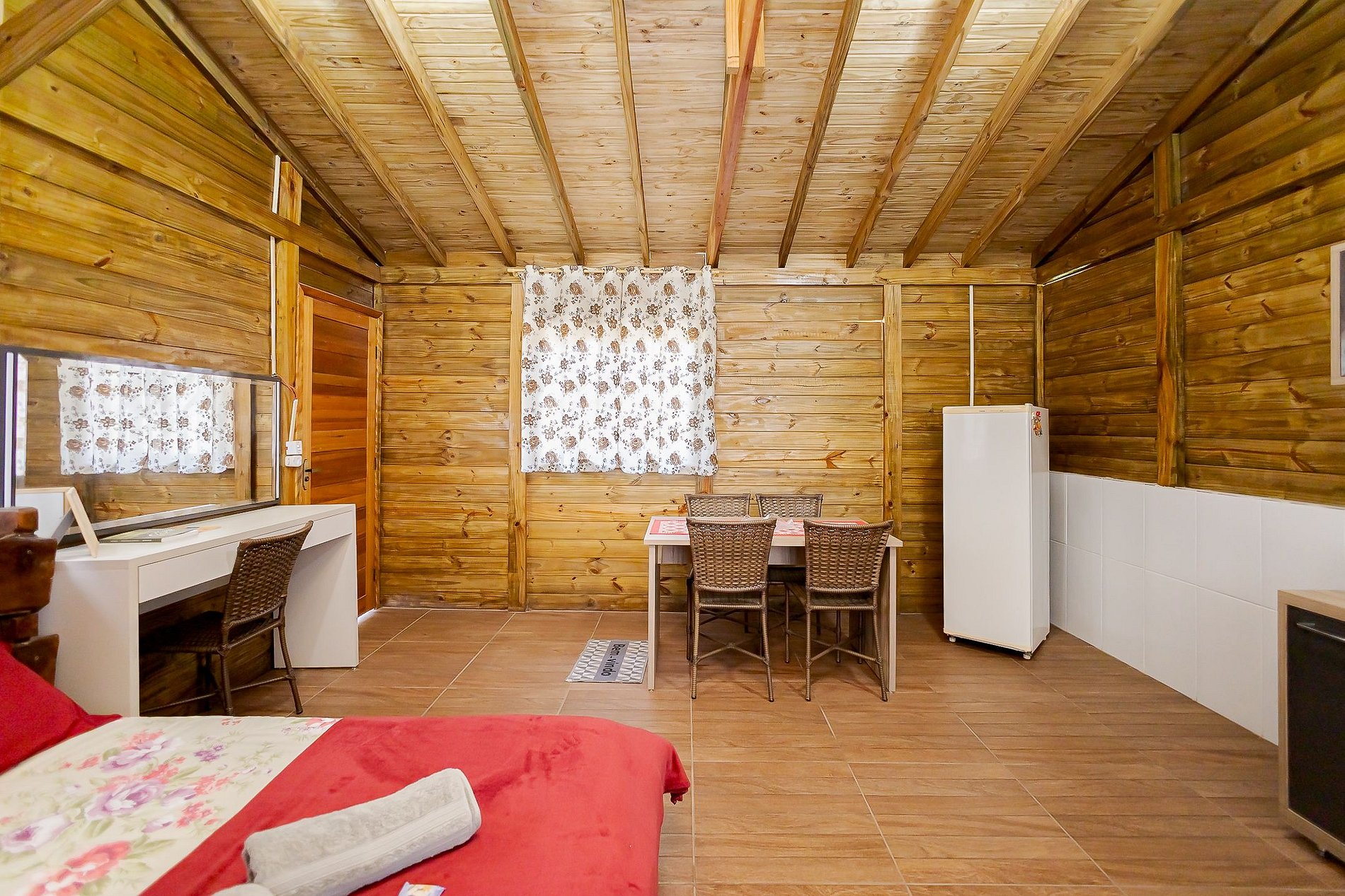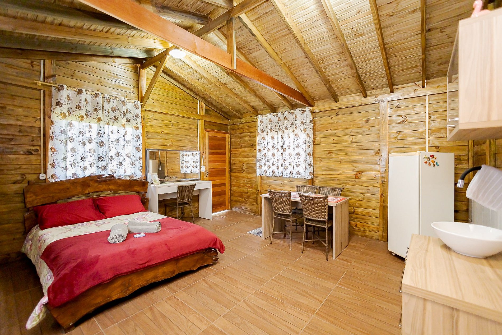 O Chalé Bem-te-vi acomoda até 2 hóspedes e oferece uma cama de casal confortável, mesa para refeições, cozinha equipada com microondas, frigobar, pia com armário e cuba, além de utensílios como pratos, talheres e copos.