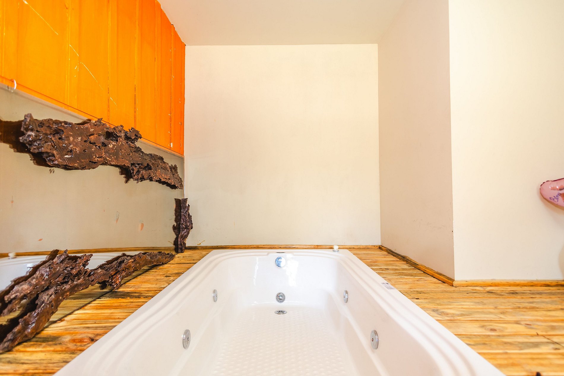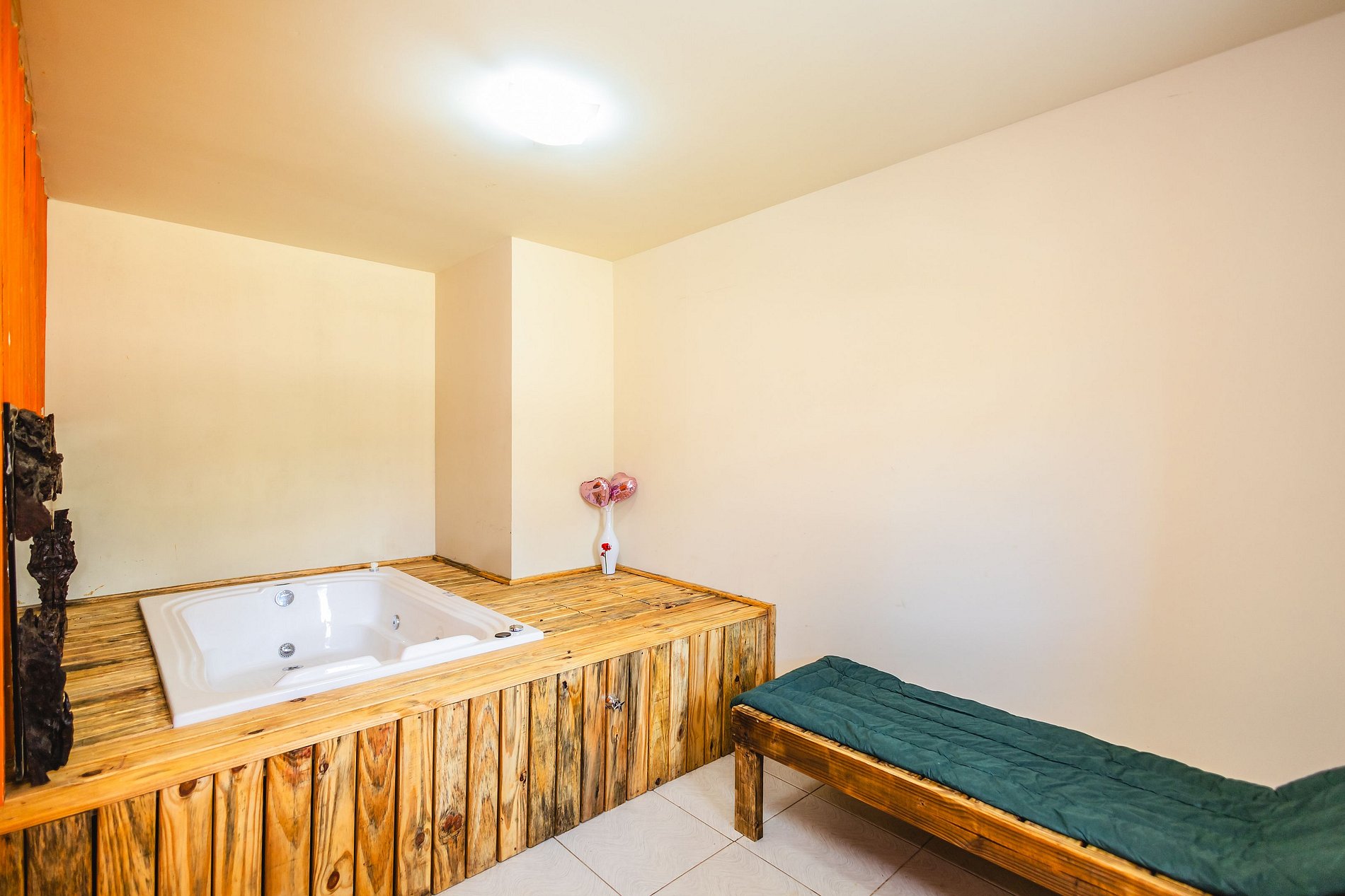 O grande diferencial é a banheira privativa, que convida a momentos de relaxamento depois de um dia aproveitando a chácara.