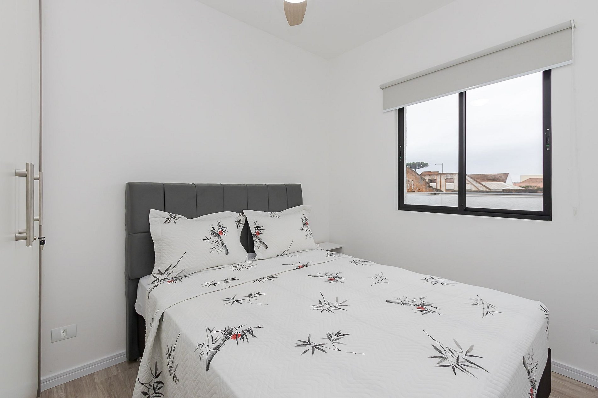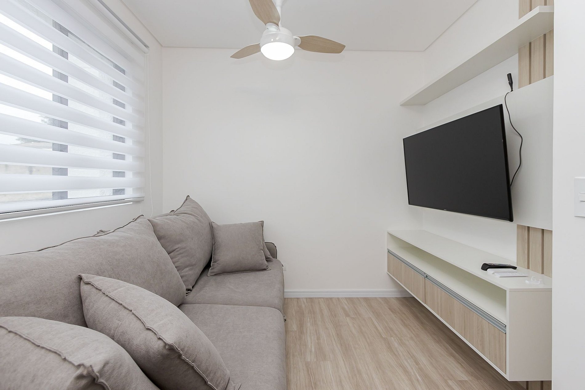 A suíte é aconchegante e a sala integrada à cozinha proporciona um ambiente funcional.