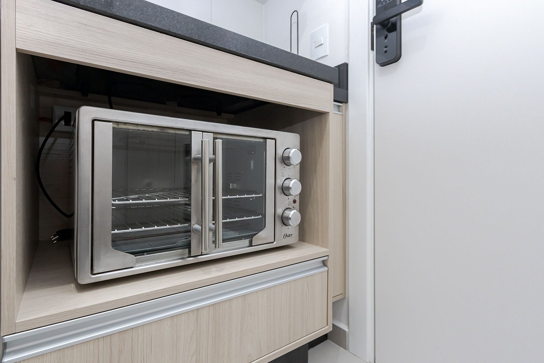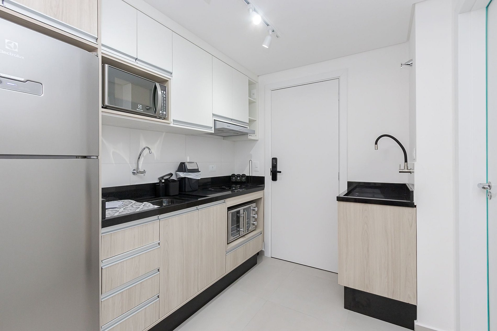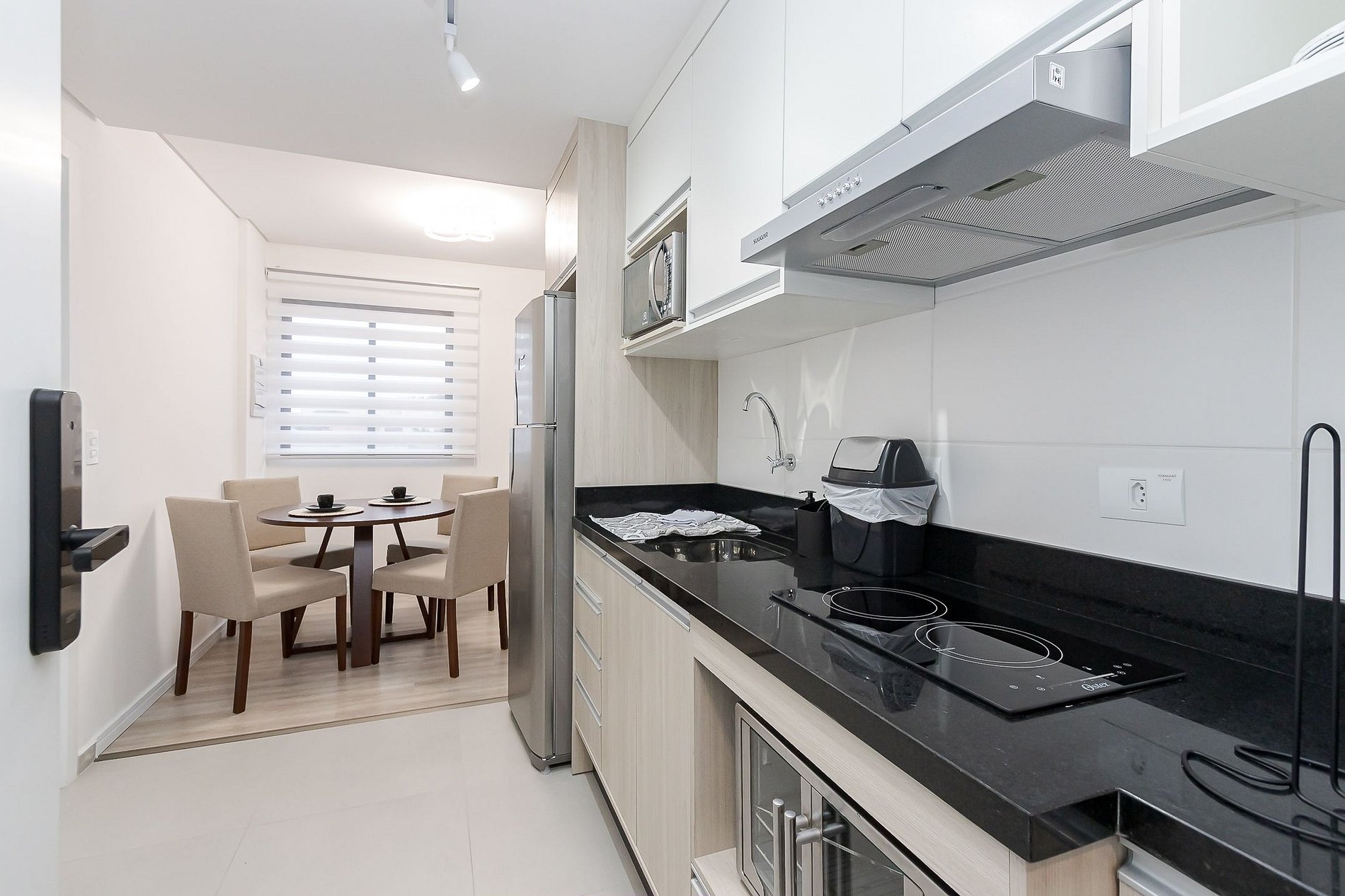 • Cozinha: Equipada com cooktop de 2 bocas, forno, micro-ondas, geladeira, chaleira elétrica, panelas, talheres, pratos, copos e utensílios essenciais.