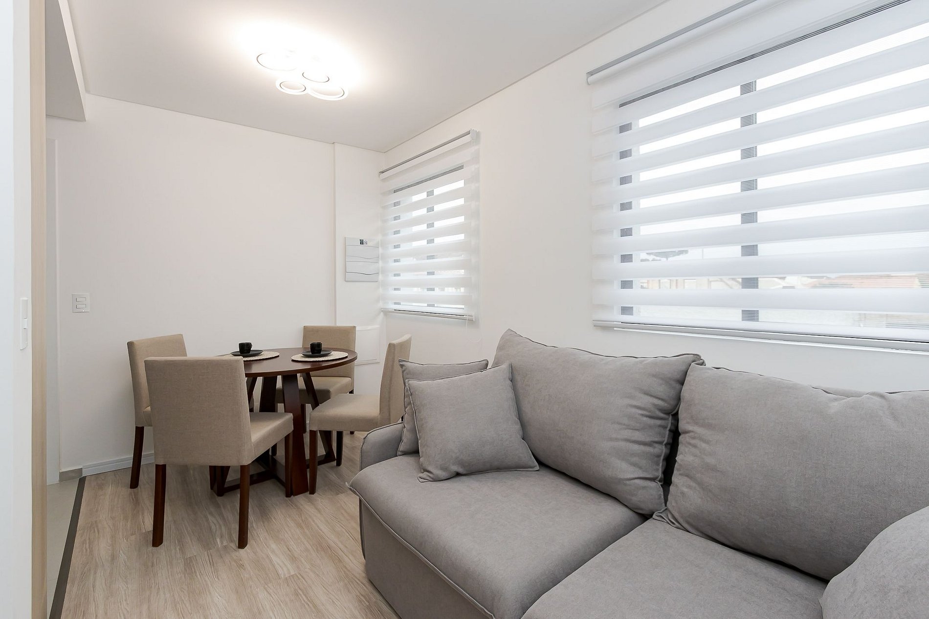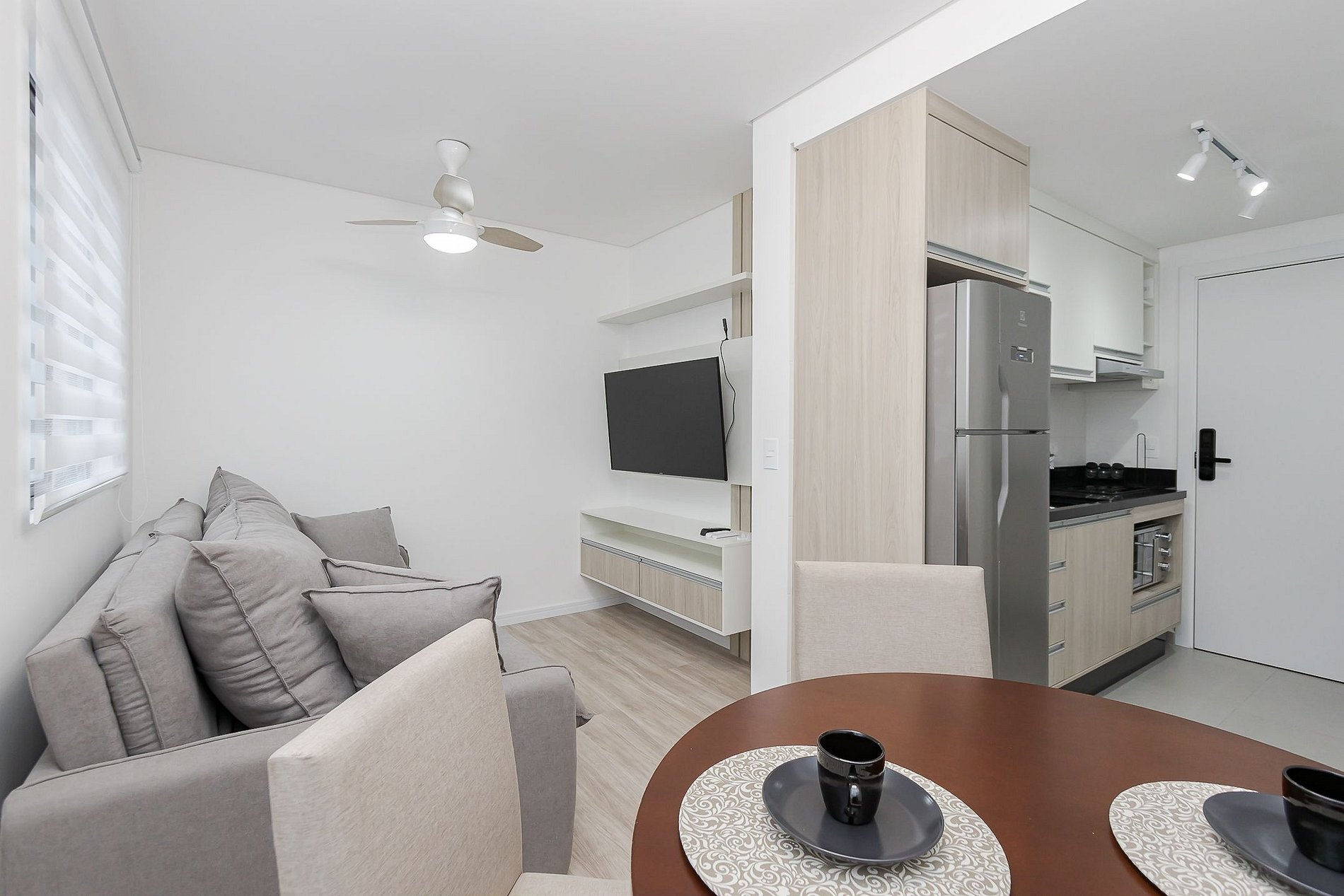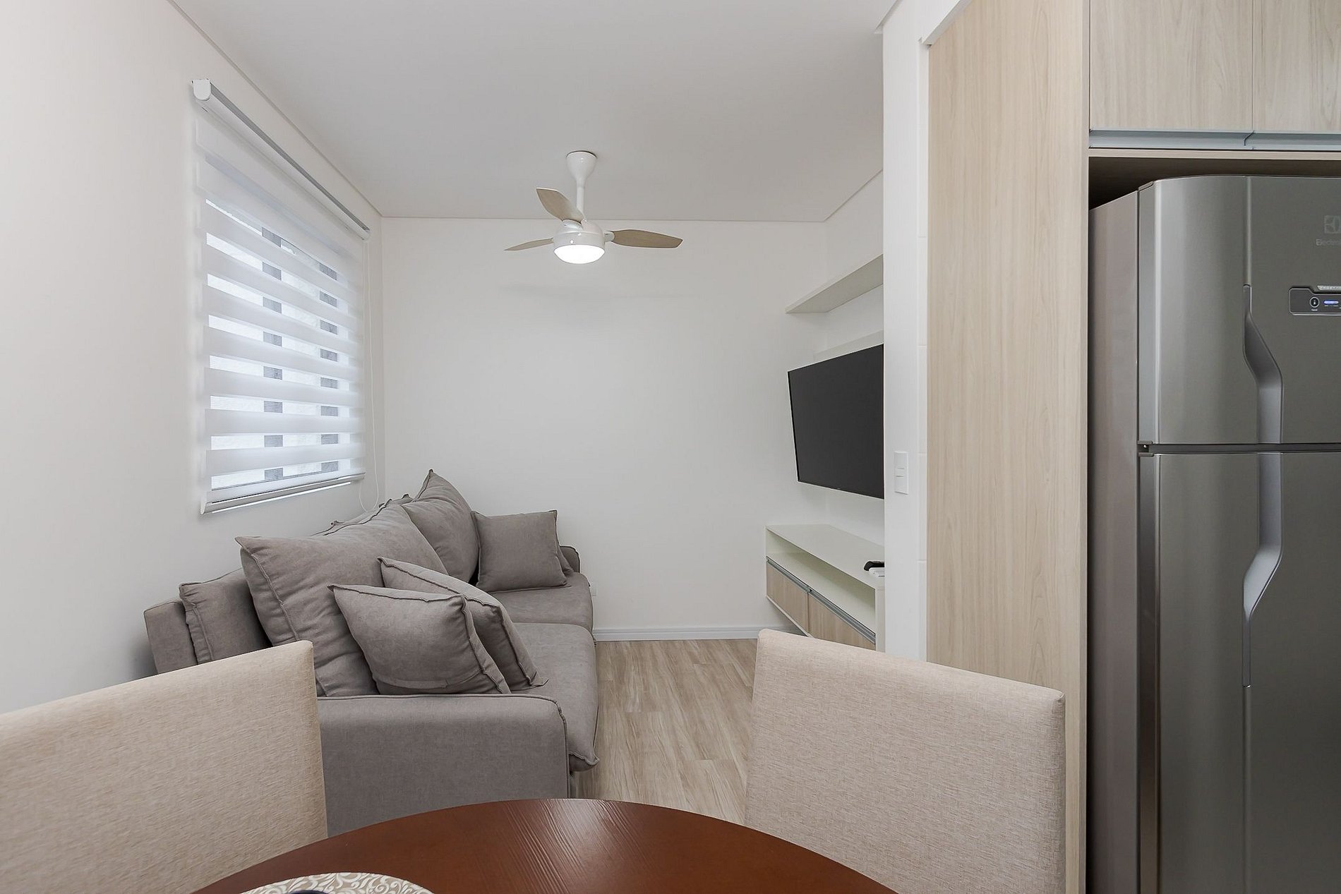 • Sala e jantar: A sala conta com um sofá-cama, cortina blackout e TV Smart. O espaço inclui uma mesa redonda, que pode ser usada para refeições ou trabalho, com duas cadeiras.