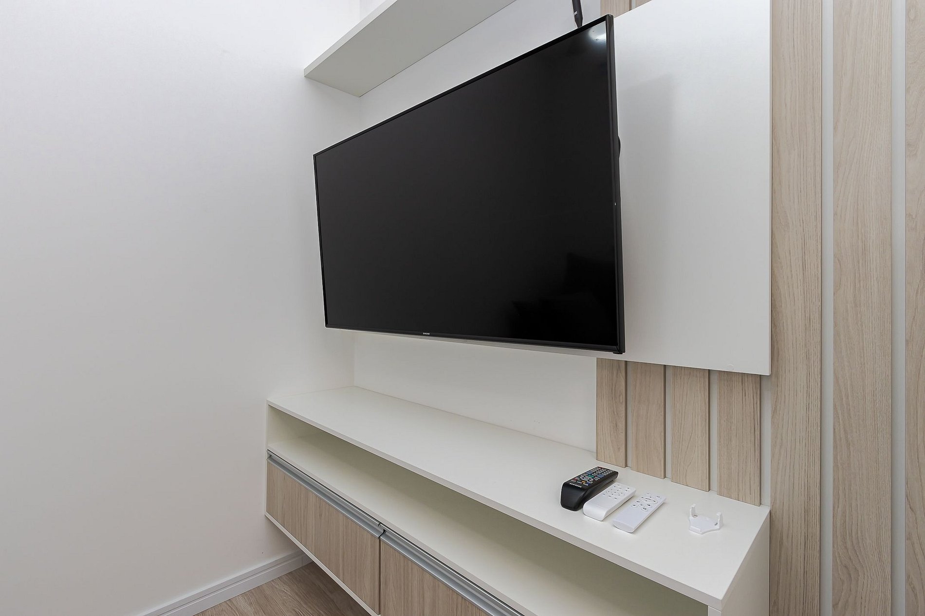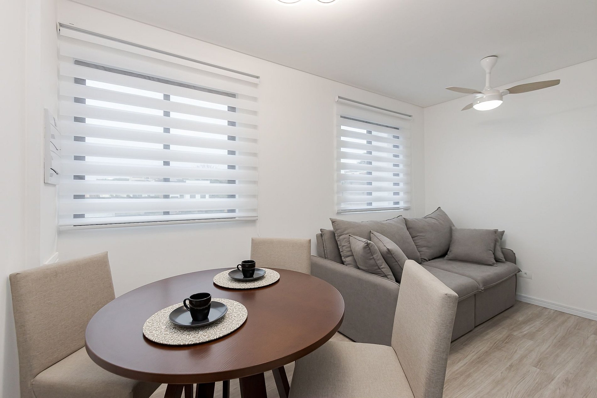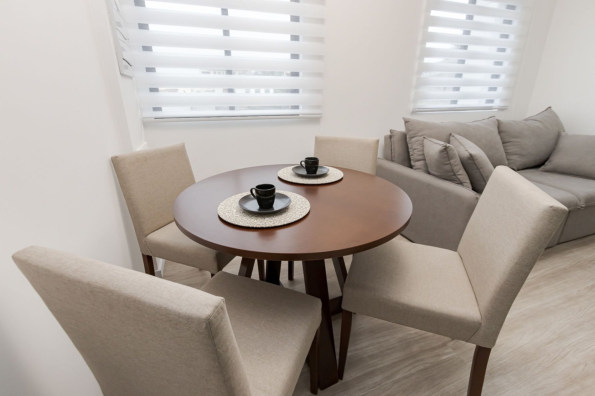 • Sala e jantar: A sala conta com um sofá-cama, cortina blackout e TV Smart. O espaço inclui uma mesa redonda, que pode ser usada para refeições ou trabalho, com duas cadeiras.