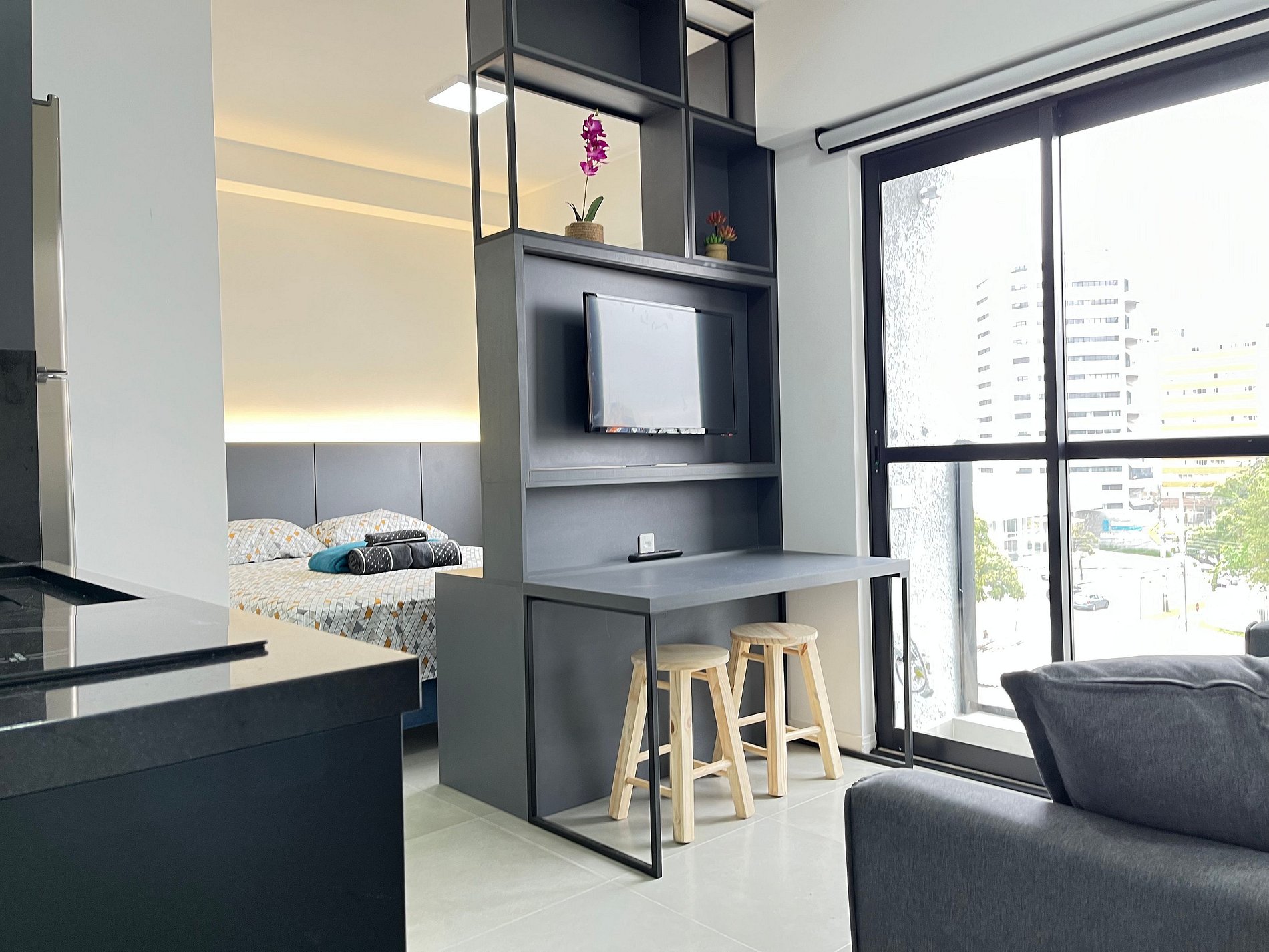 Neste estúdio você desfrutará de uma cozinha completa e uma pequena sacada com churrasqueira, ideal para momentos relaxantes. O prédio também disponibiliza uma lavanderia coletiva e um espaço de coworking com internet de alta velocidade, garantindo conforto e praticidade durante sua estadia.